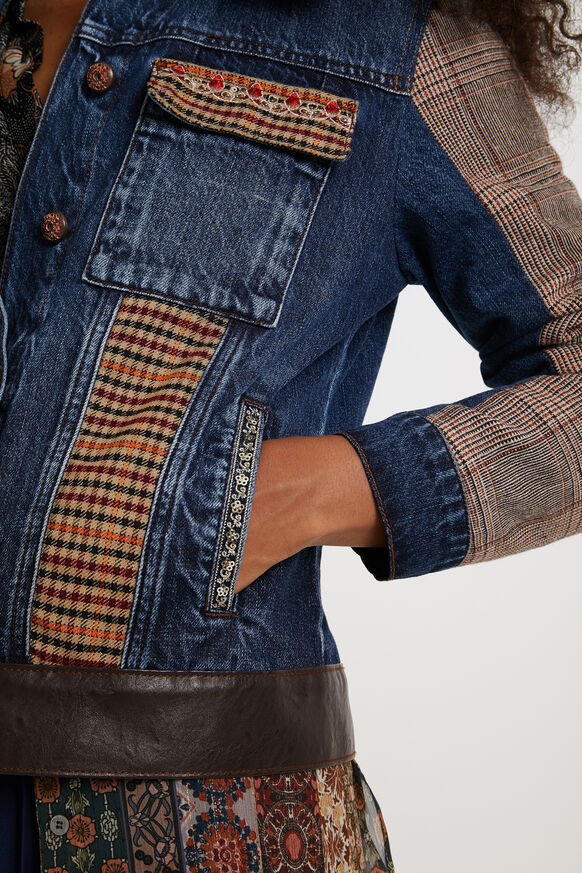 20WWED22 - CHAQ_ALMU - 80% POLYESTER 20% COTTON 83% COTTON 11% PES 2% AC 1% EA 1% PA 1% CV 1% WO The basis of this jacket is the usual trucker type jacket with washed/worn effect... But it's full of boho details that transform it into a unique garment, like its fur effect collar, its tartan panels, its jewel buttons and its friezes with sequins or its leather effect waist.