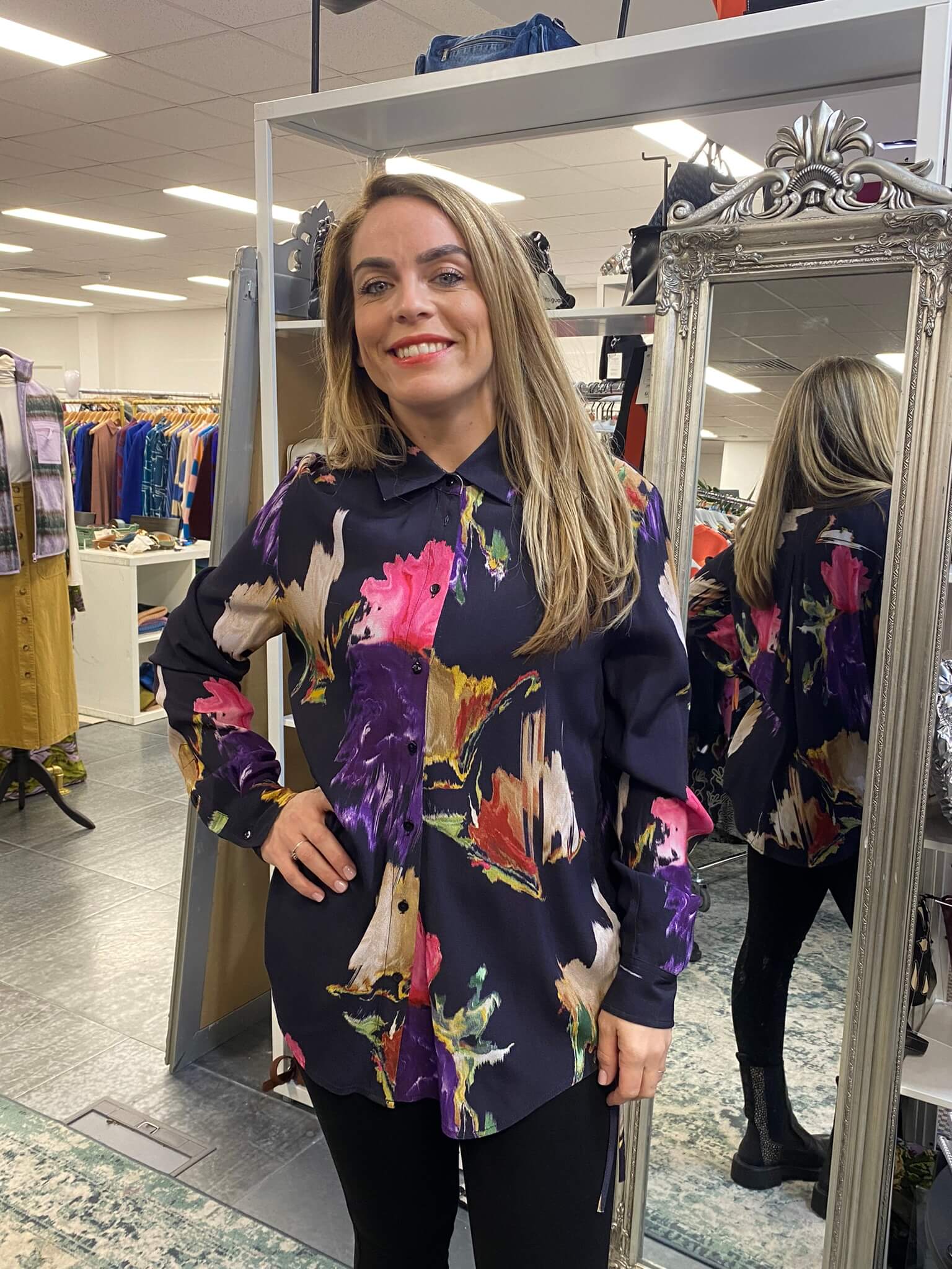 Long-sleeve shirt with a collar and button closure, featuring a floral print
