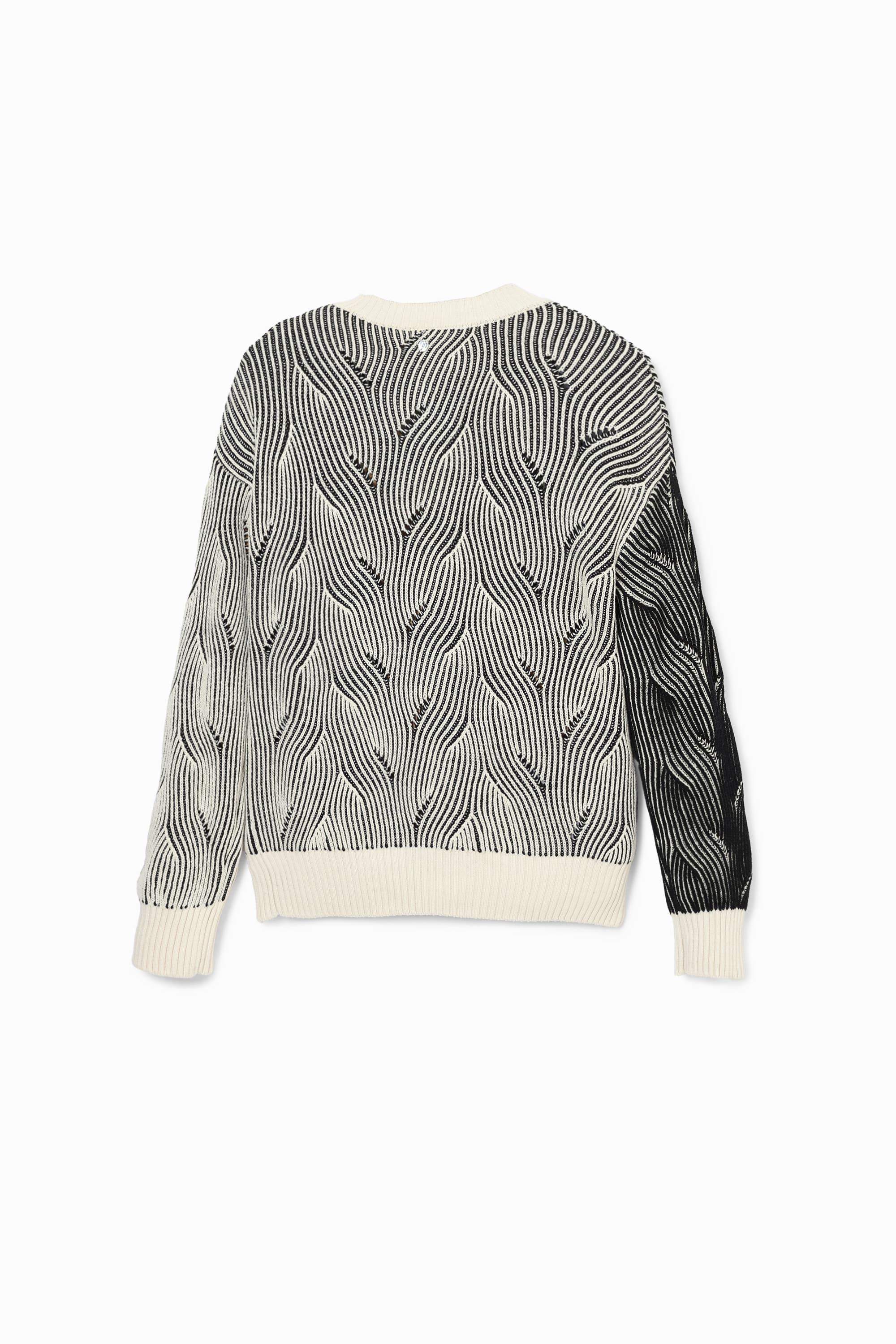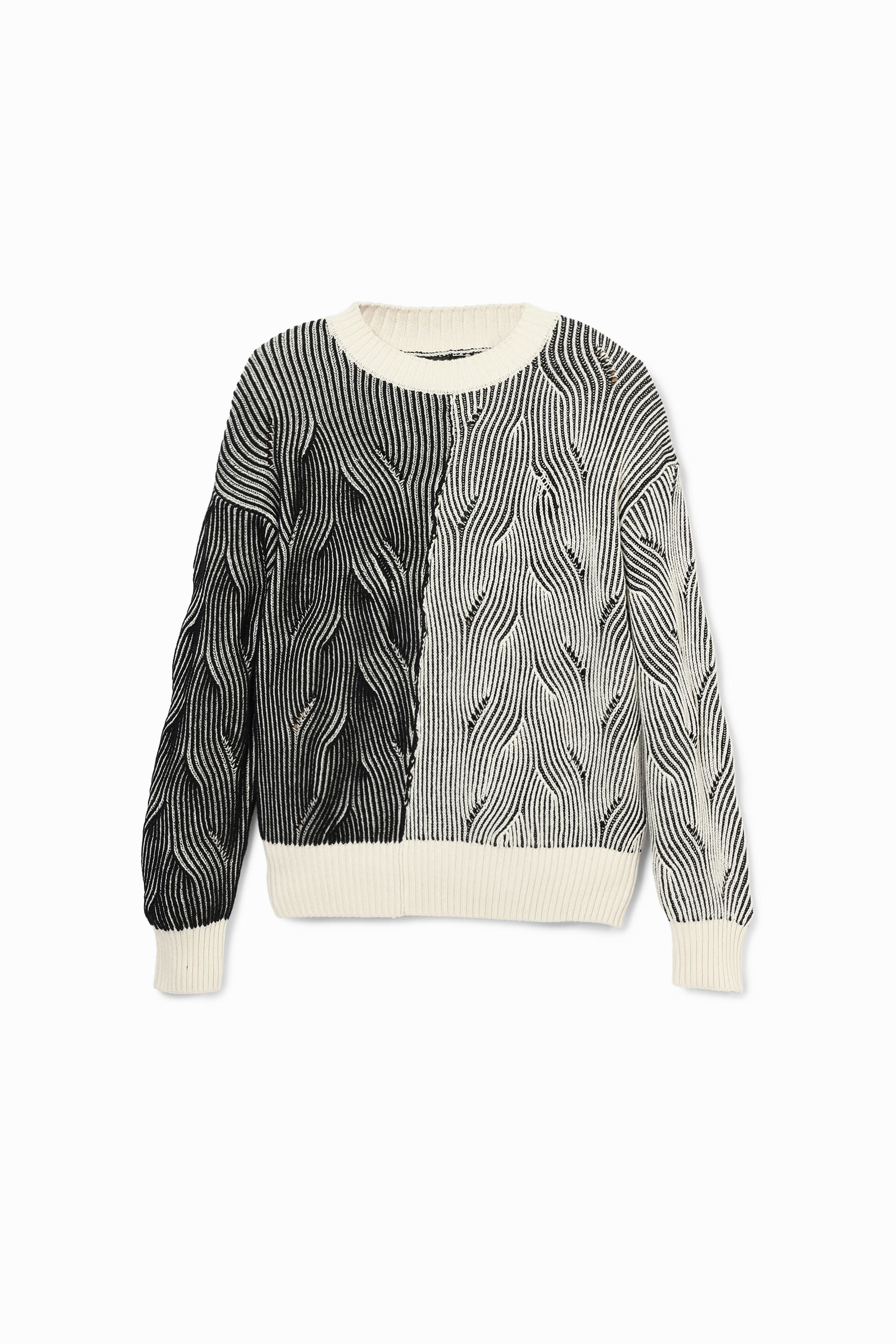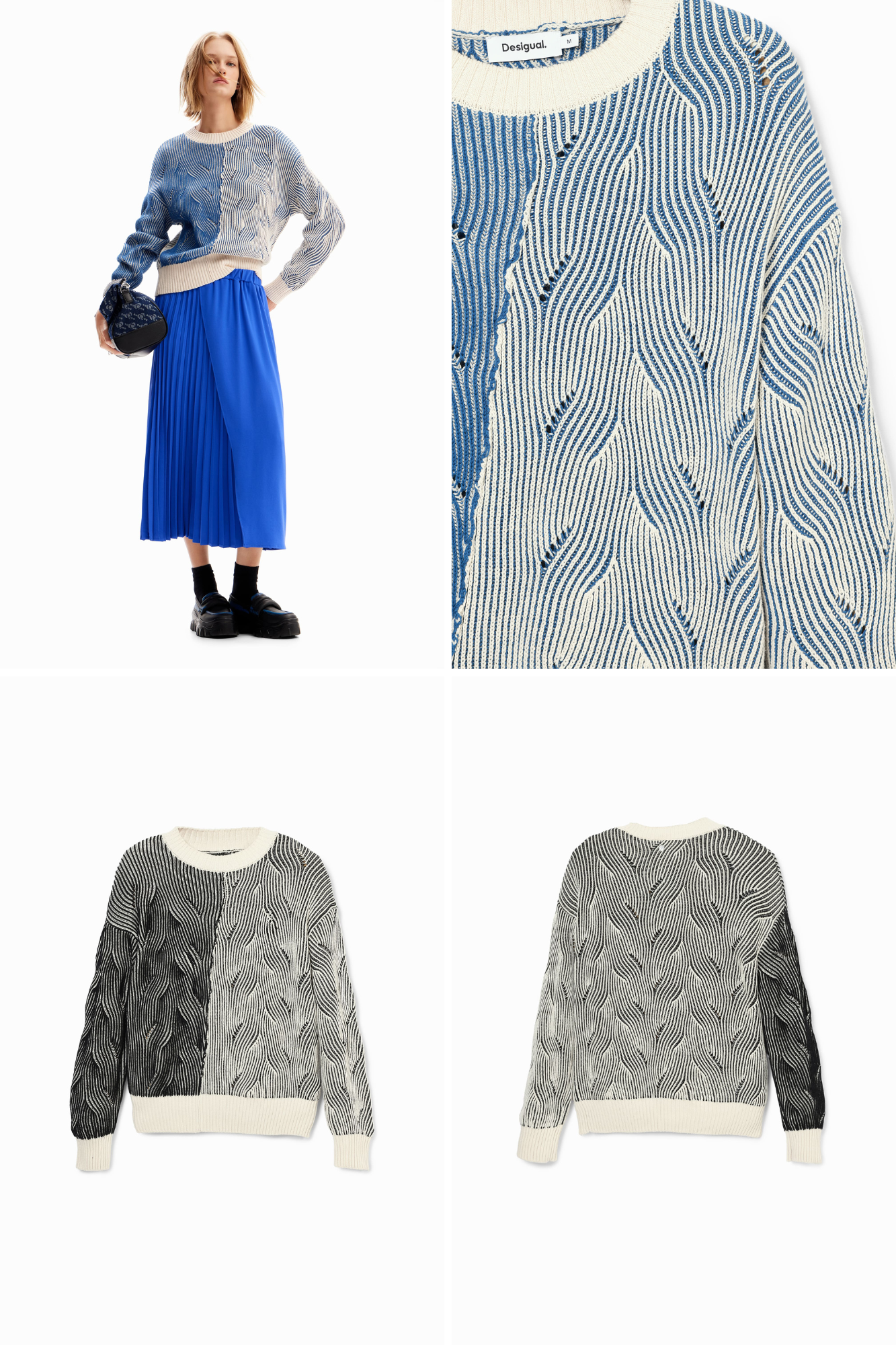 Long-sleeved knit sweater with a round neck and bicolor embossed print Fit: Regular Two-tone print Round neck Long sleeve Without closure Details on the neck, hem, and cuffs When you buy cotton products from Desigual, you are supporting our investment in Better Cotton. This product is sourced through a mass balance system and may not contain Better Cotton. bettercotton.org/massbalance Model’s measurements: Height: 177 cm; Waist: 57 cm; Hip: 87 cm Model size: M SKU: 24WWJF105036 Product Sustainability Better Cotton Composition and care Outer fabric composition: 97% COTTON, 3% POLYAMIDE