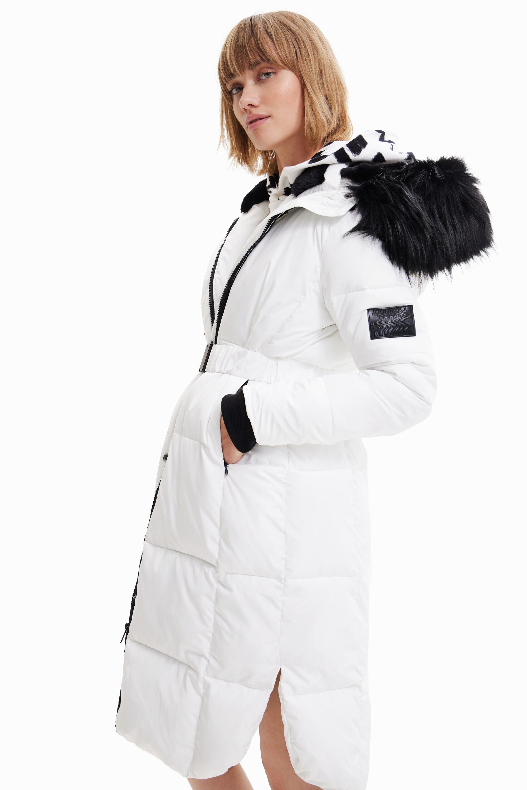 The removable hood with fur-effect trim is the key element of this long quilted coat with a high collar and belt. Made from a warm recycled padded fabric, it will protect you from the cold weather.