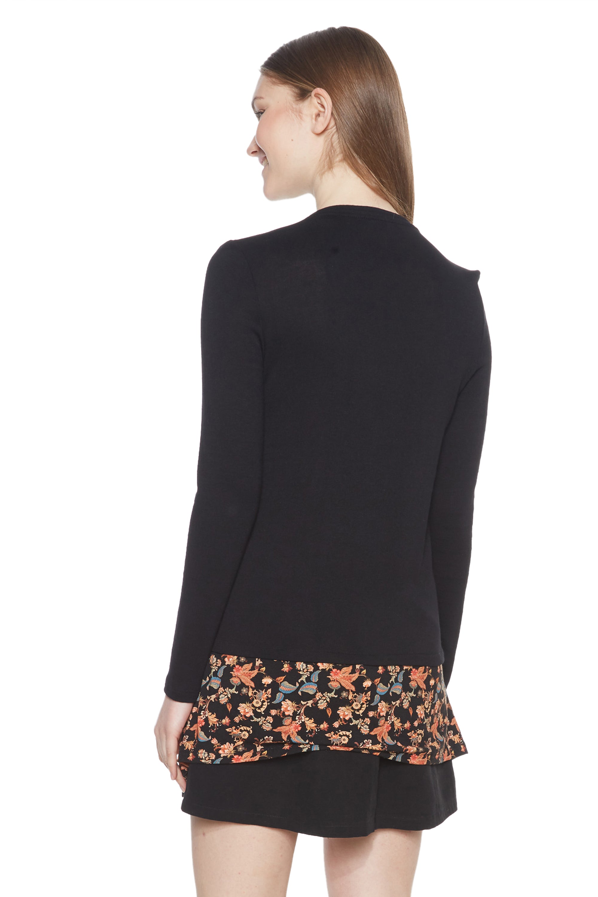 A jacket or a blouse? You don’t have to choose: you can have it all with this Twin Set layered piece. A black knit jacket with floral embroidery to the sides, and a blouse underneath with Indonesia-inspired print that comes to your wardrobe to give you versatility and a great solution for all your outfits.