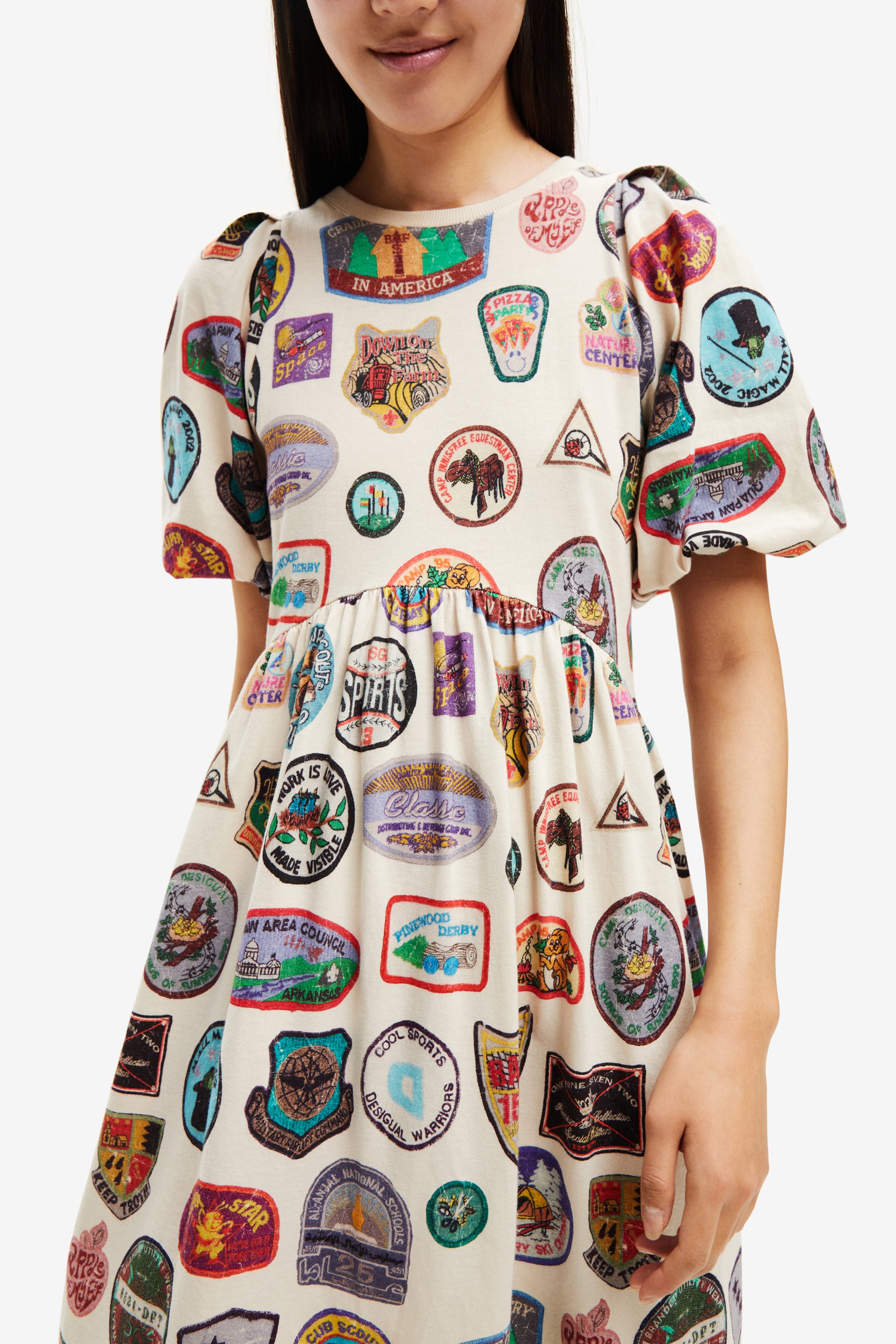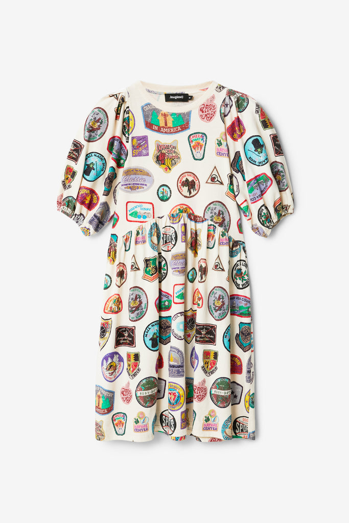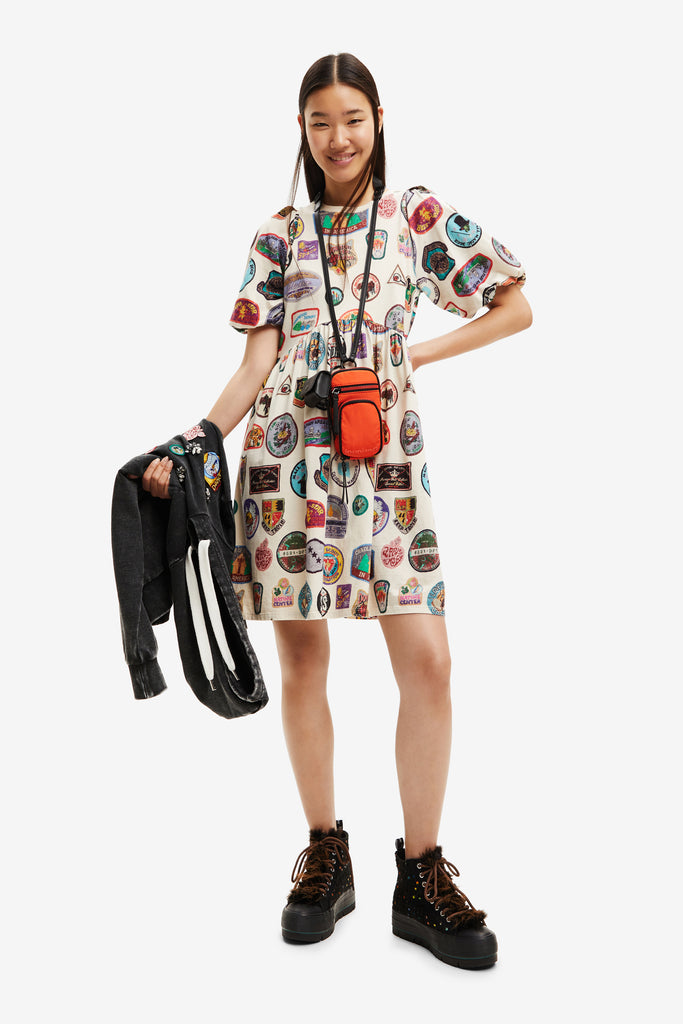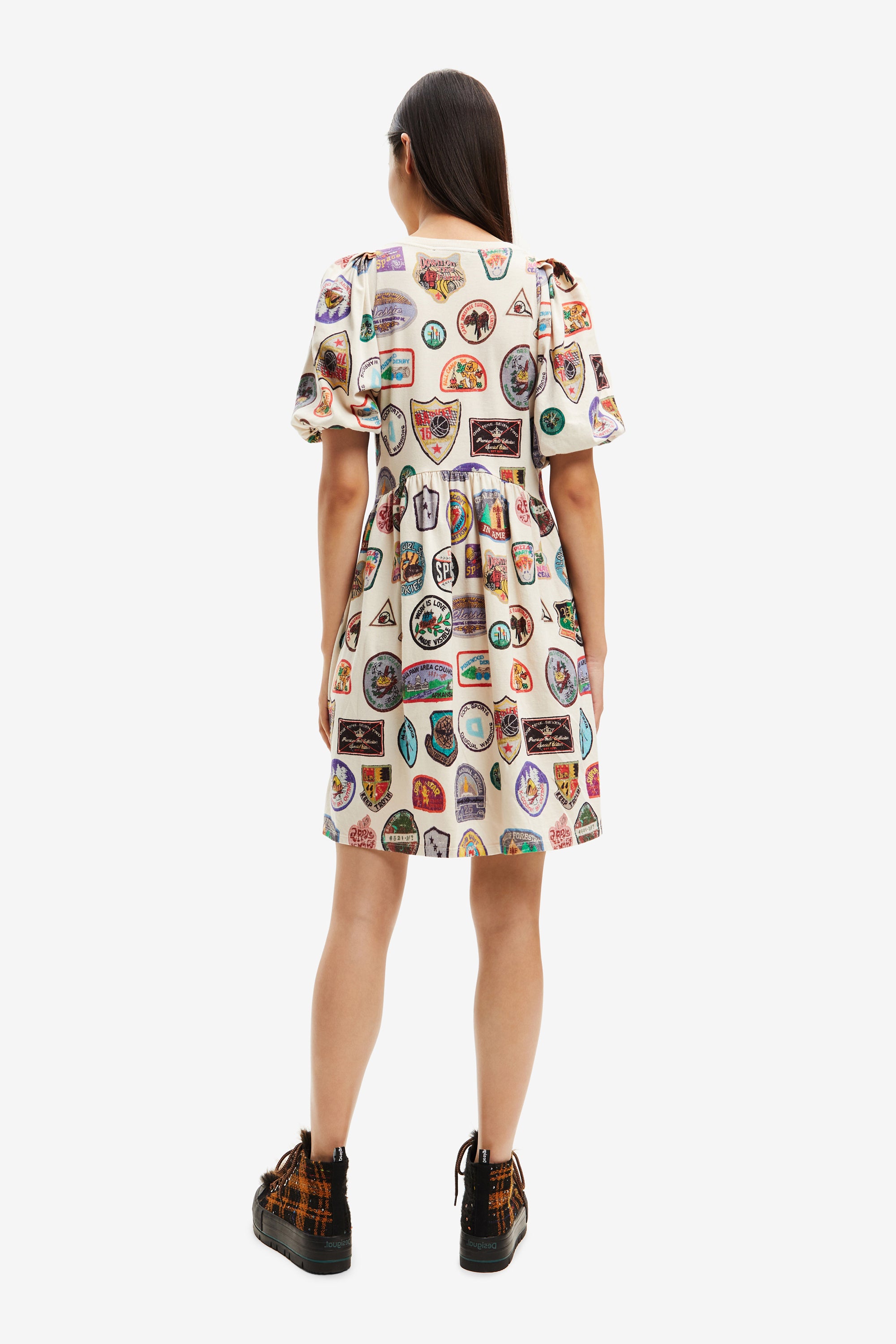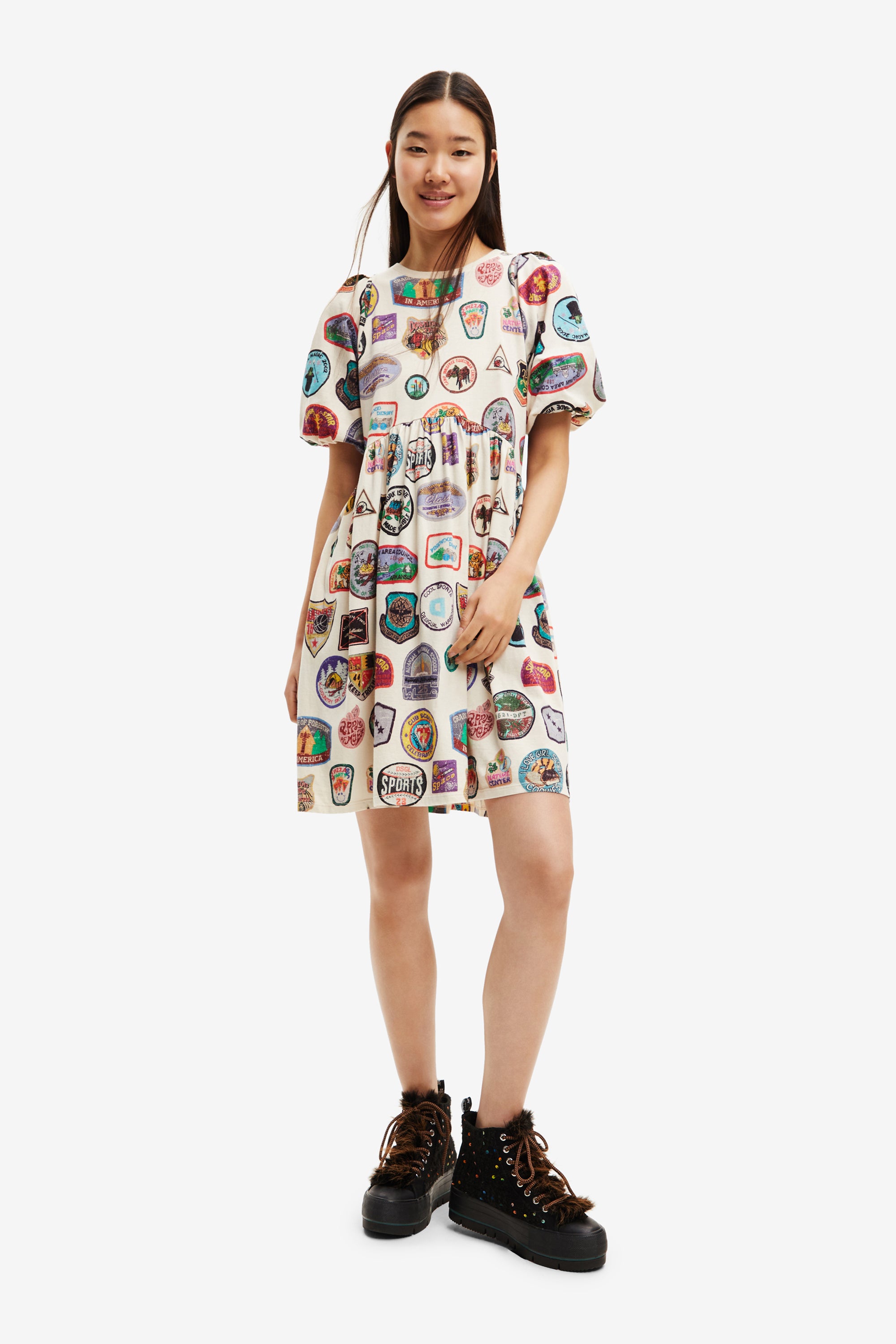 Desigual Stamps Smock Dress 22WWVW71 A short floaty dress in cotton with balloon sleeves and an A-line skirt featuring a digital all-over badge print.