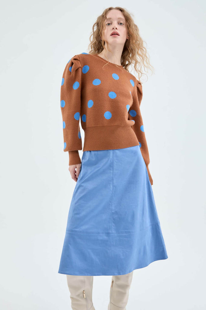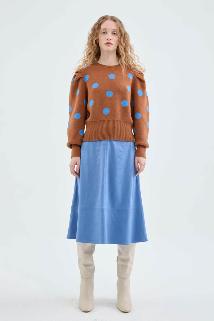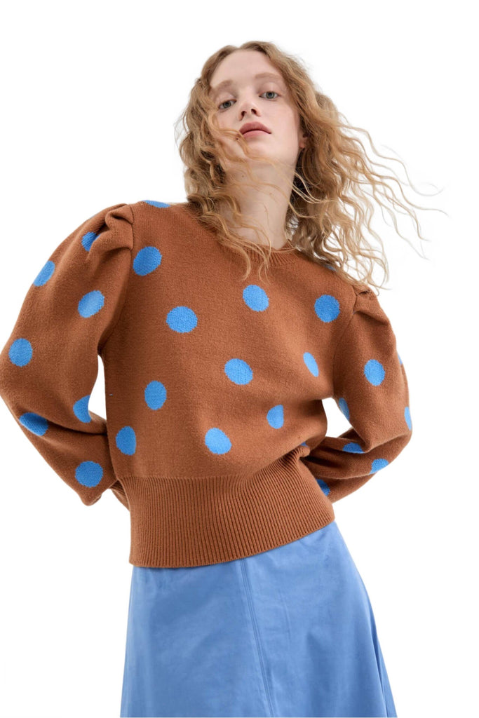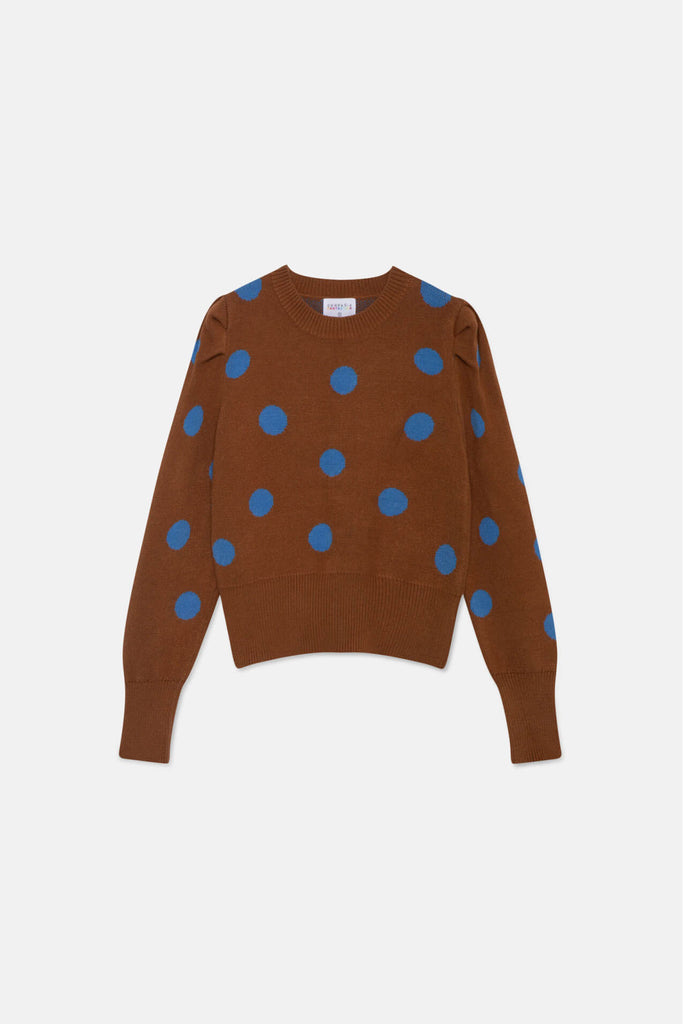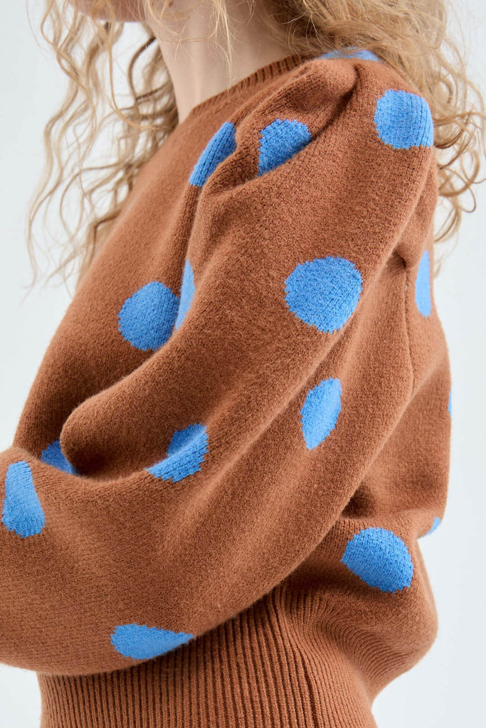 Compania Fantastica Brown Polka Dot Print Puff Sleeve Knitted Sweater