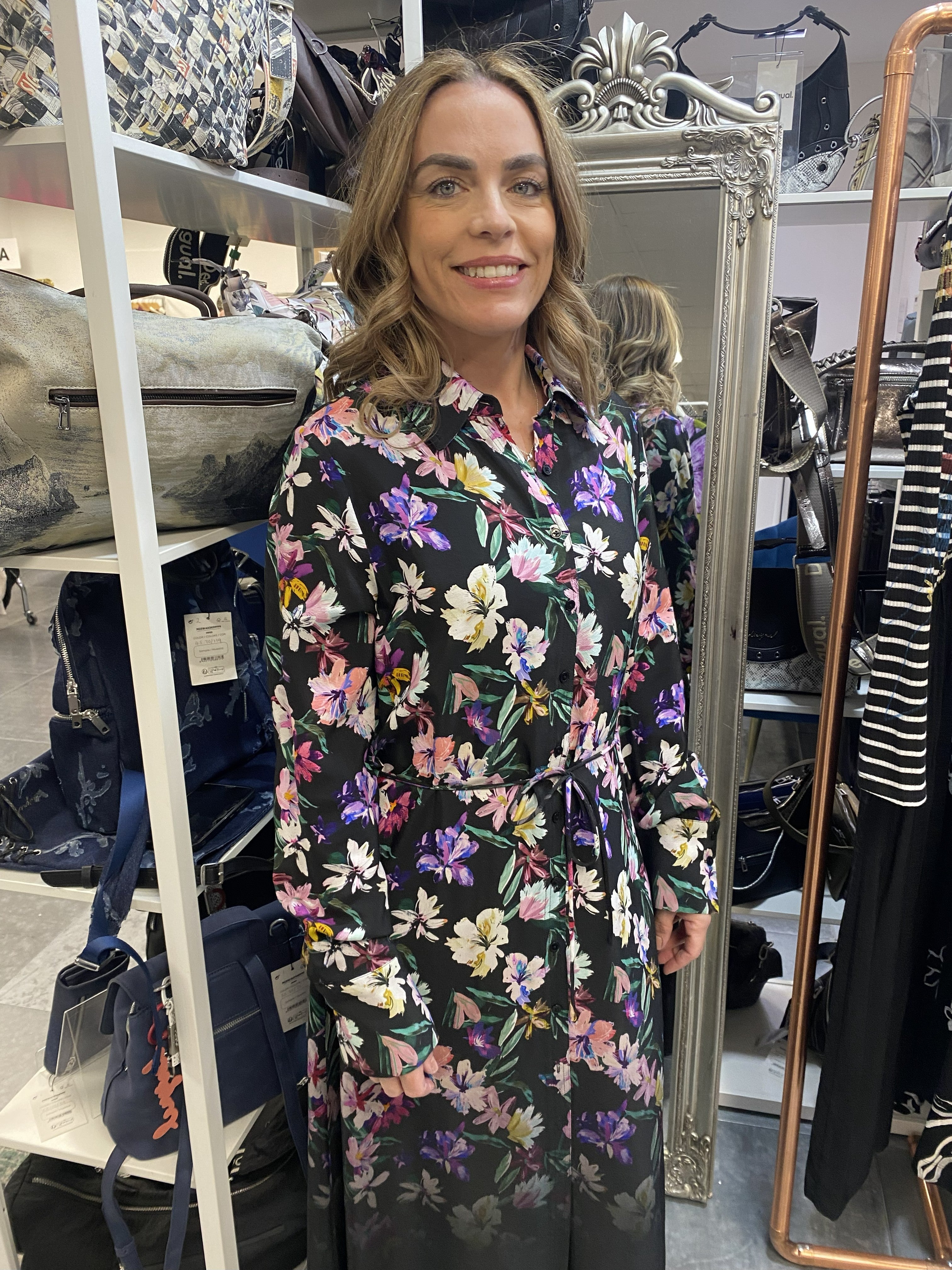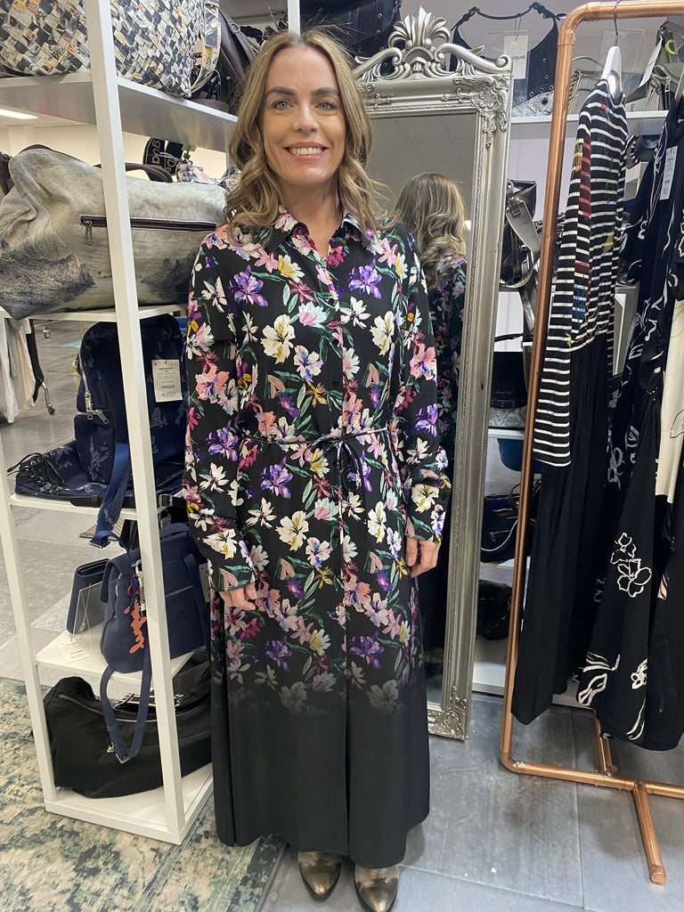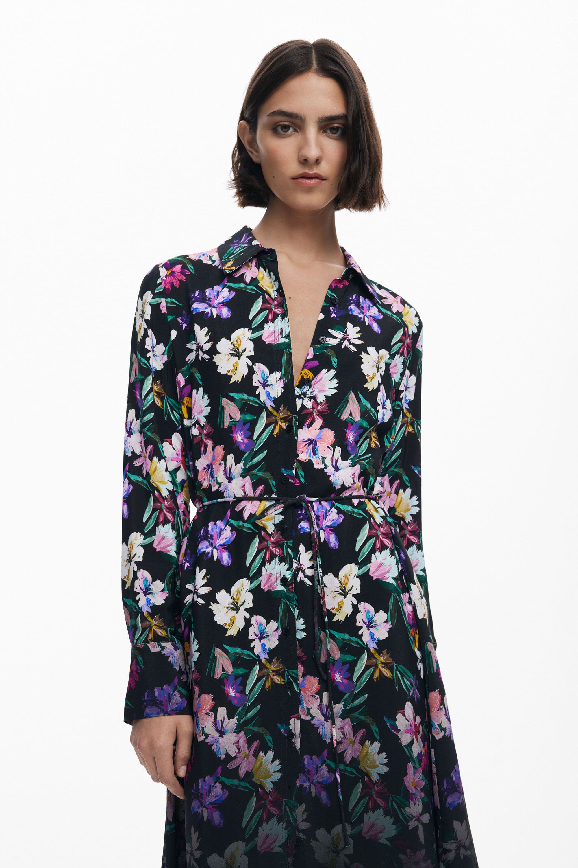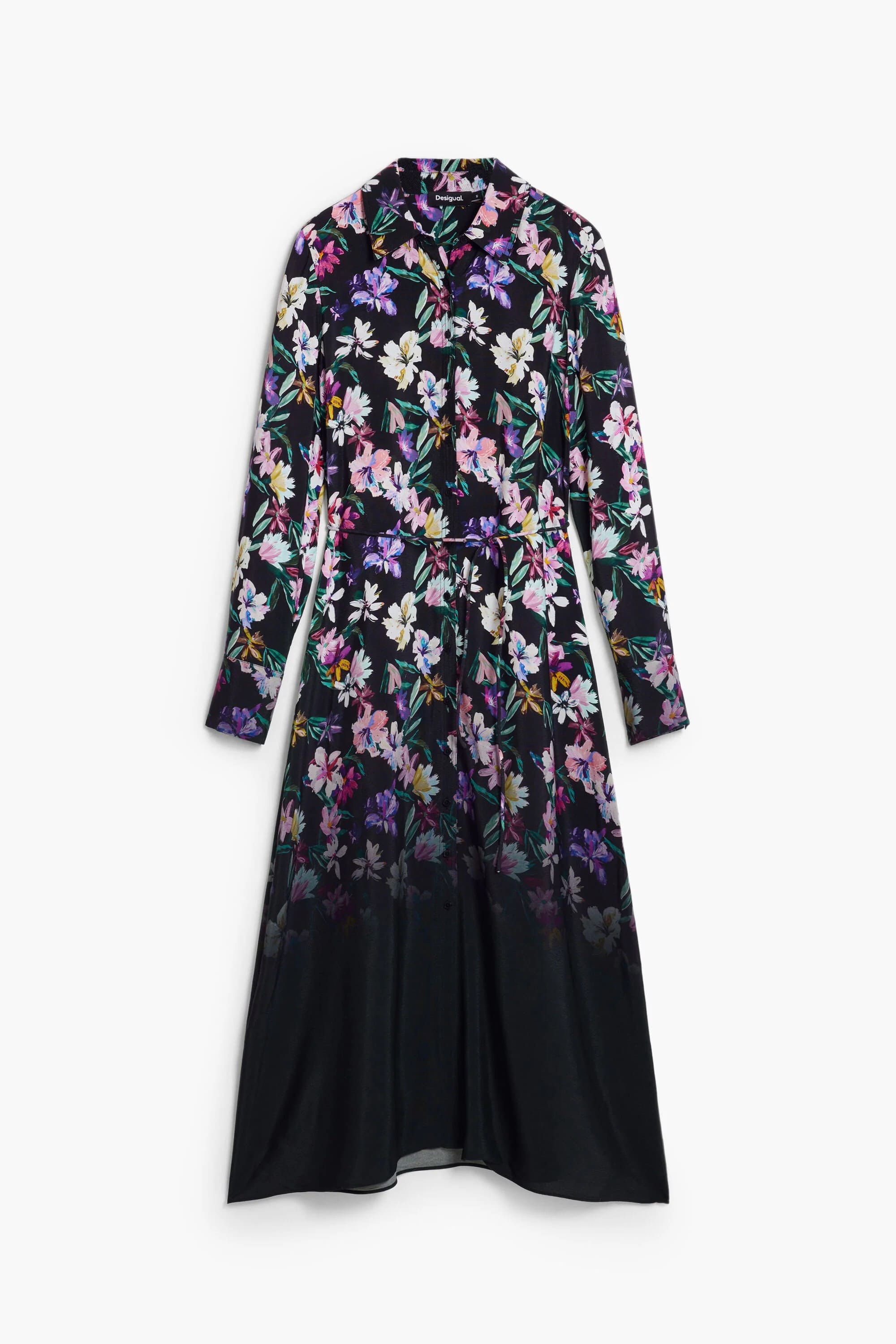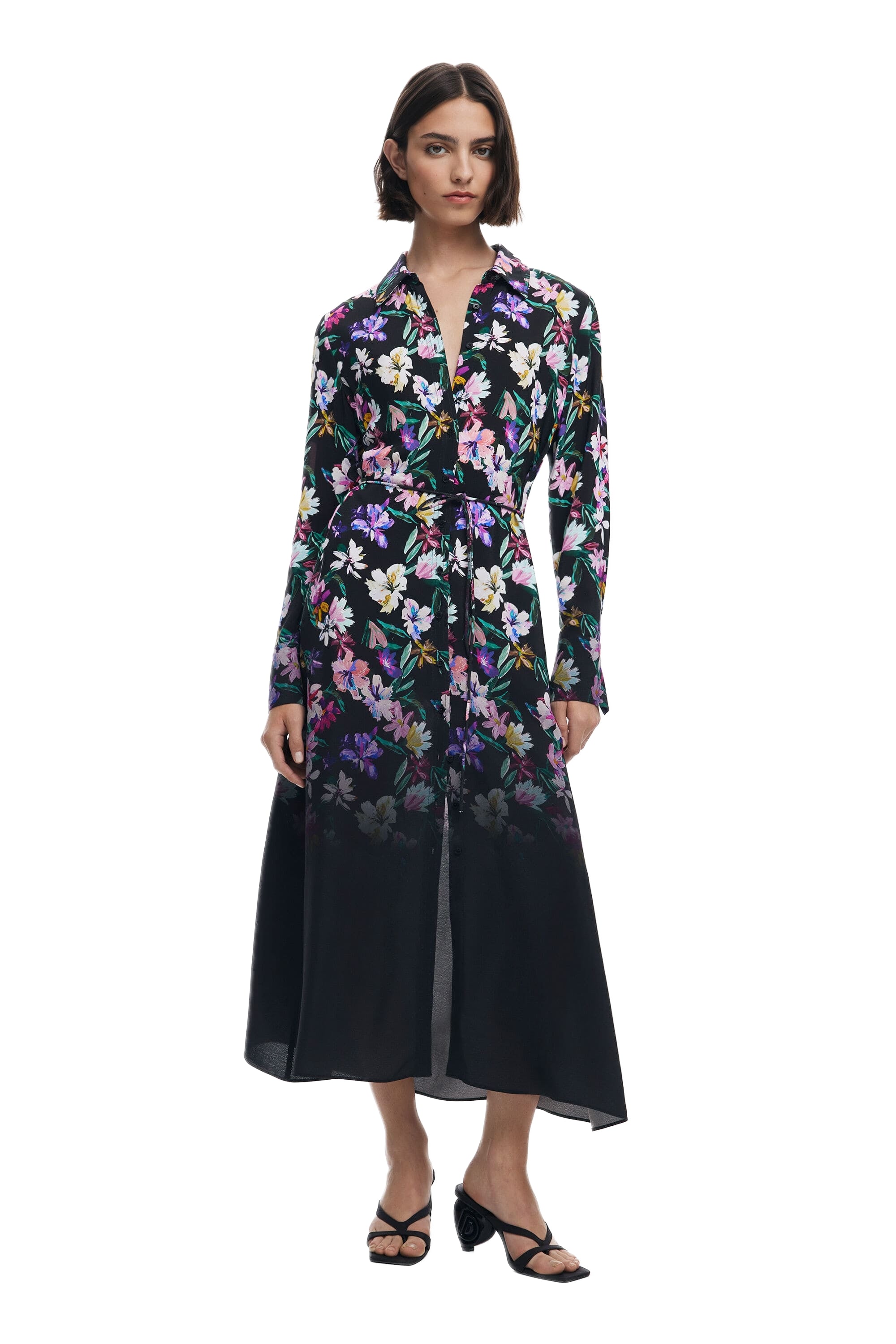 Shirt-style dress, long-sleeved, with front buttoning, tie detail at the waist, and gradient floral print.