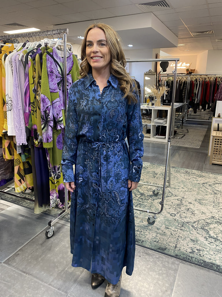 Midi dress in a shirt style, with front buttons, shirt collar, long sleeves, waist tie, and Paisley print.