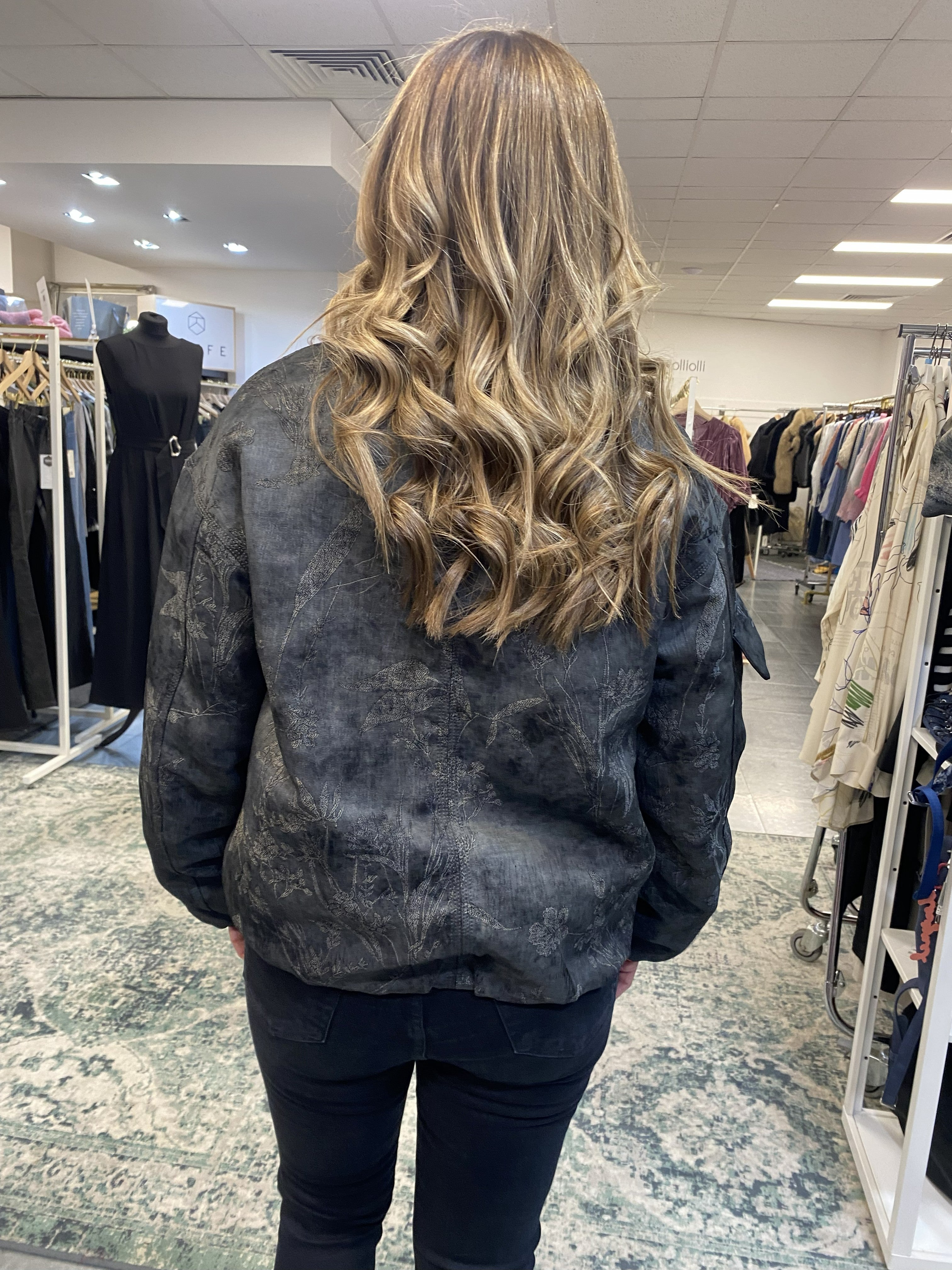 Short bomber-style jacket with front pockets, knitted collar, and elastic waistband with oriental-inspired embroidery.