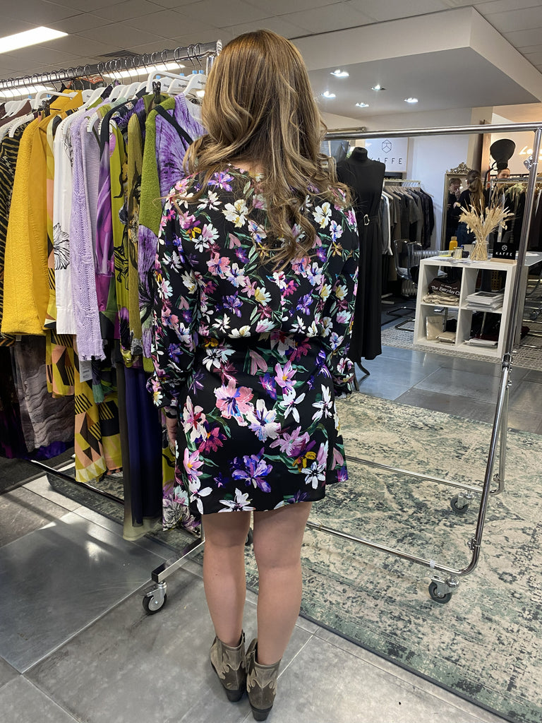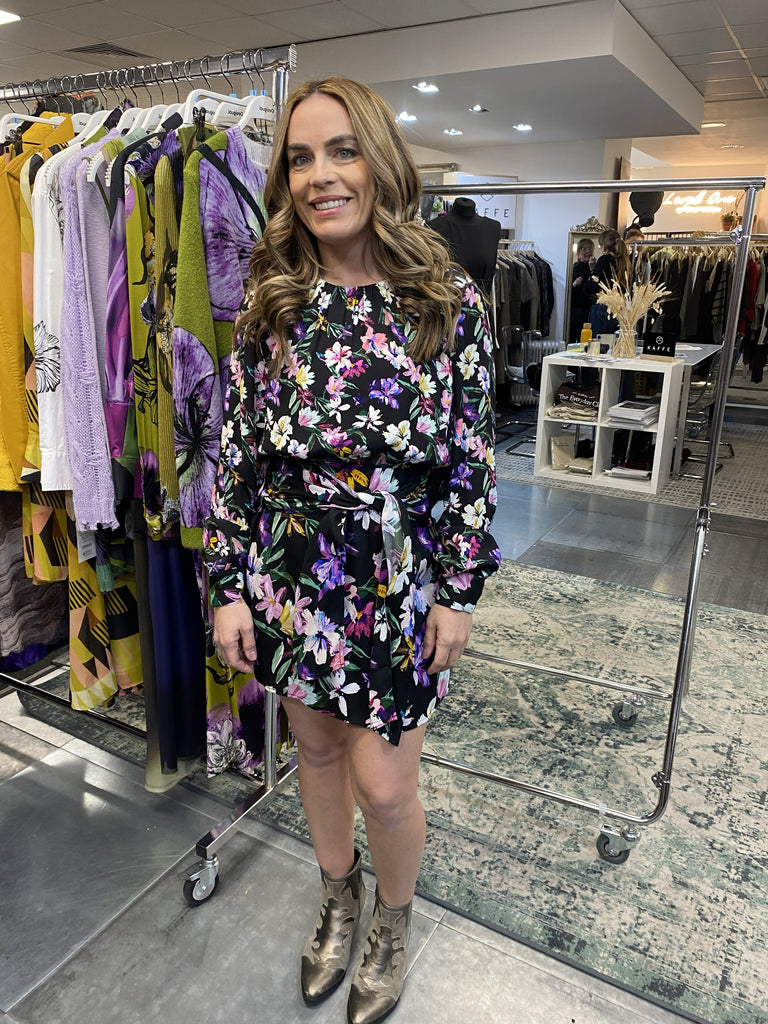 Short dress with long sleeves, round neck, knot detail at the waist, and floral print.