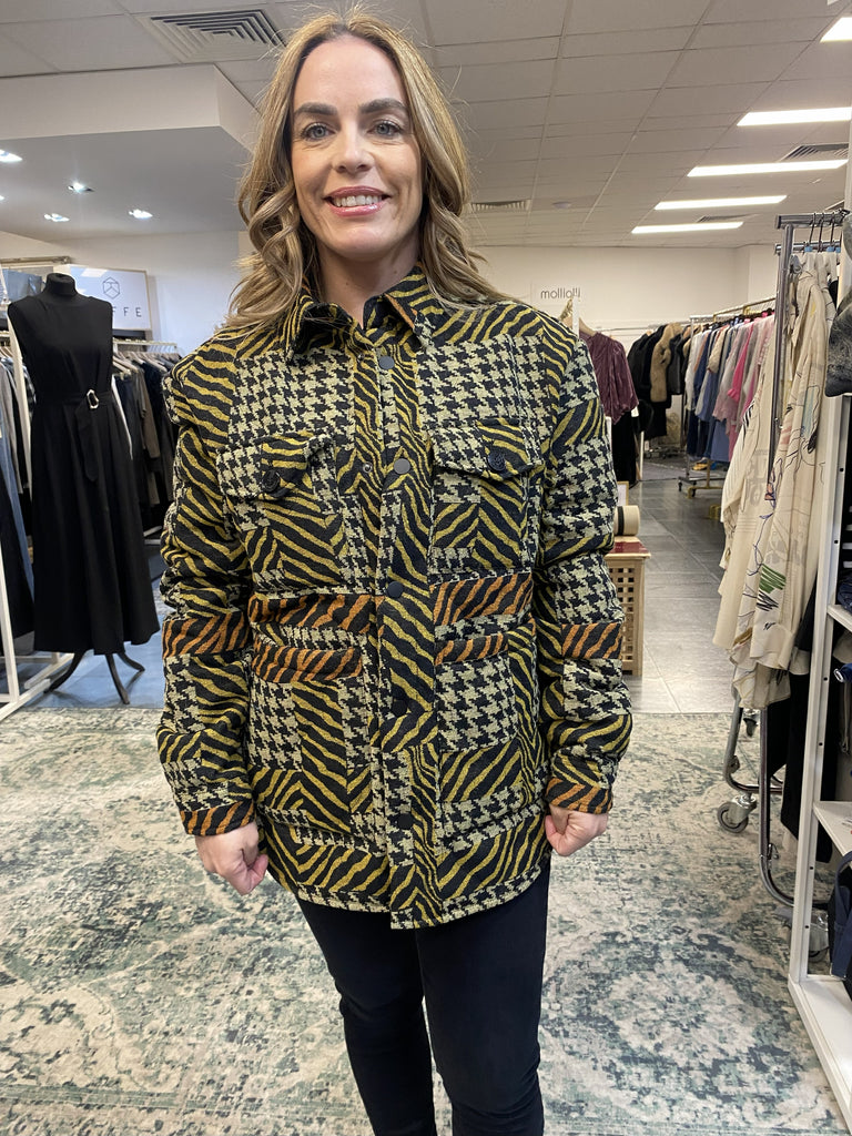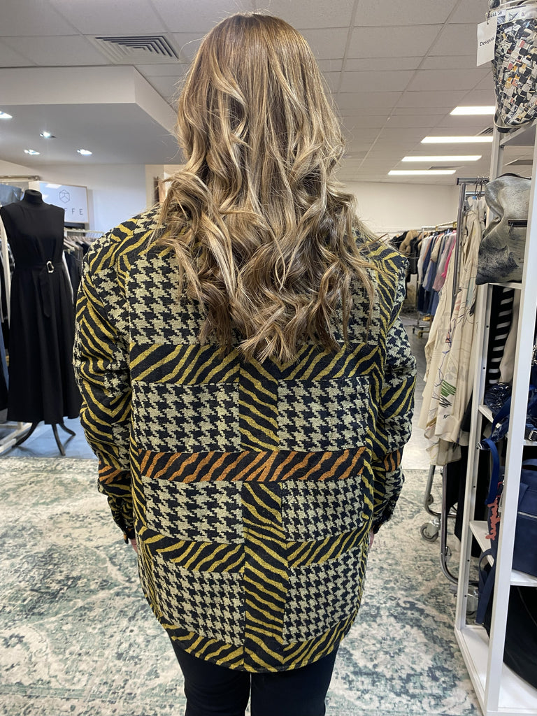 Trucker-style jacket with large front pockets in a combination of animal print and houndstooth designed by Monsieur Christian Lacroix.