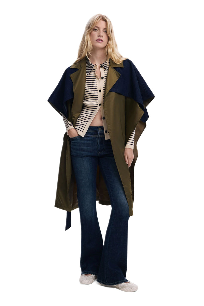 Long trench-style poncho combined with denim, front pockets, and bow-type belt.