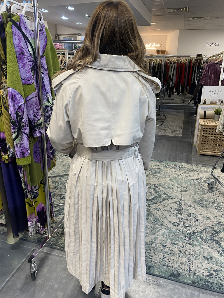 Long trench coat-style jacket with pleated back, front pockets, and removable belt in solid color.