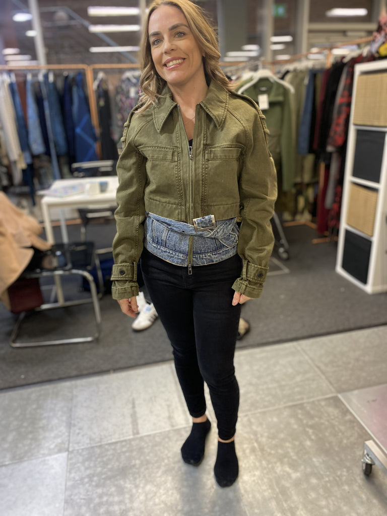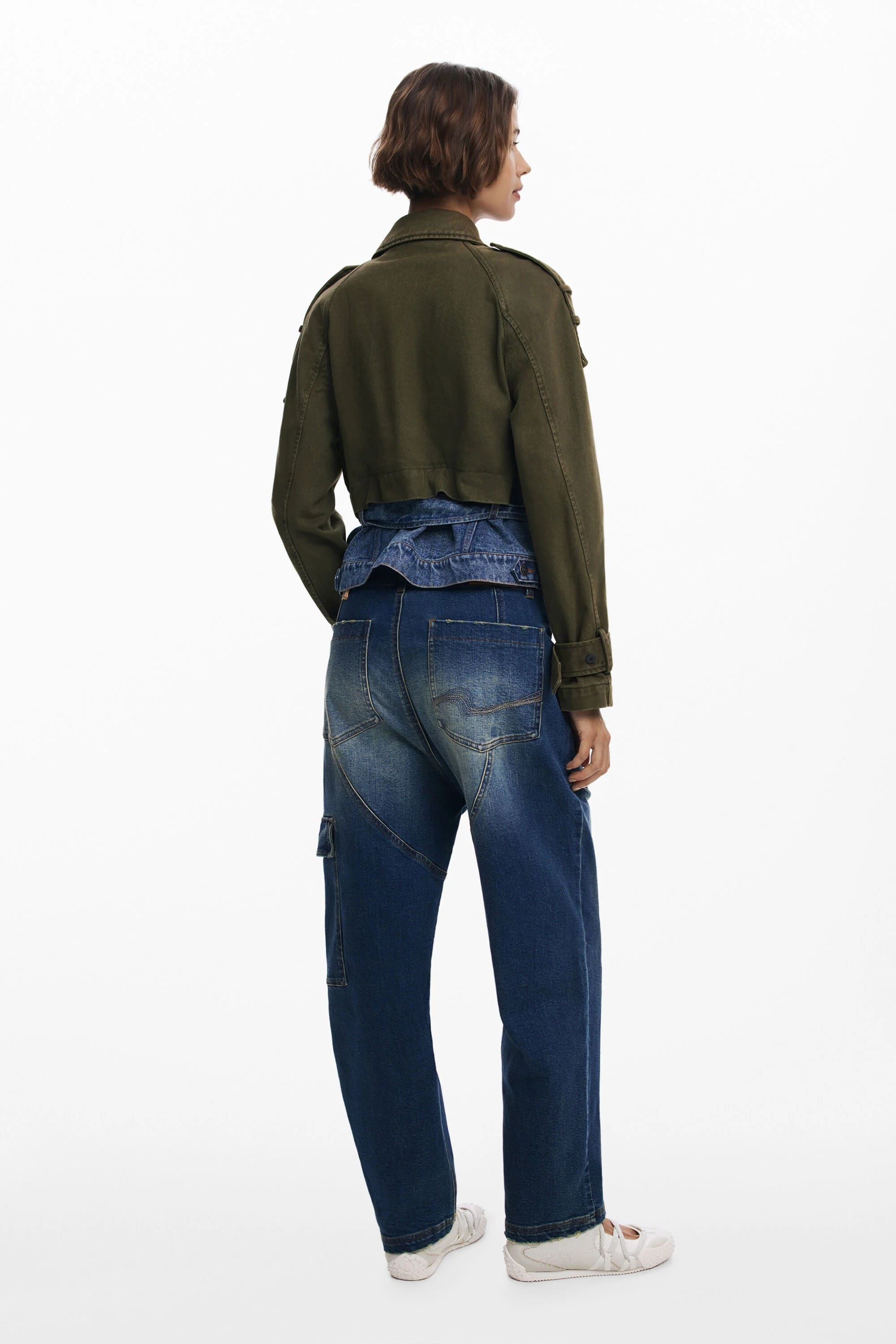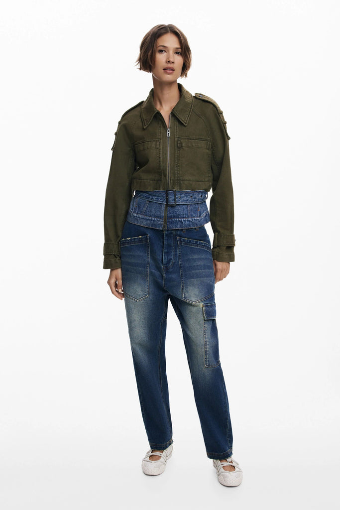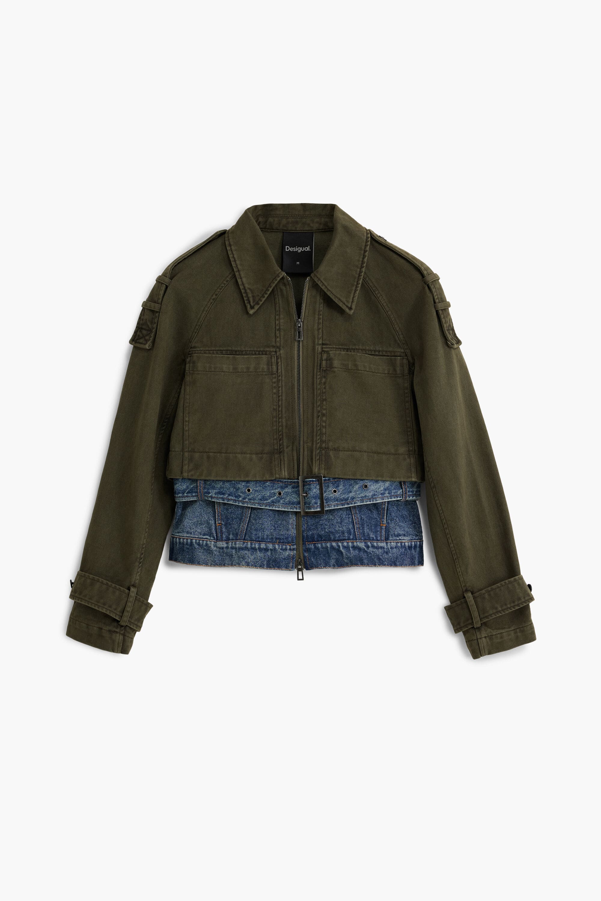 Cropped parka-style jacket with denim fabric combination, front pockets, and removable belt