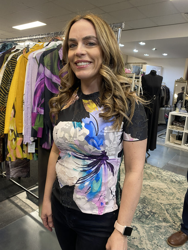Soft-touch textured T-shirt, with short sleeves, round neck, and floral print.
