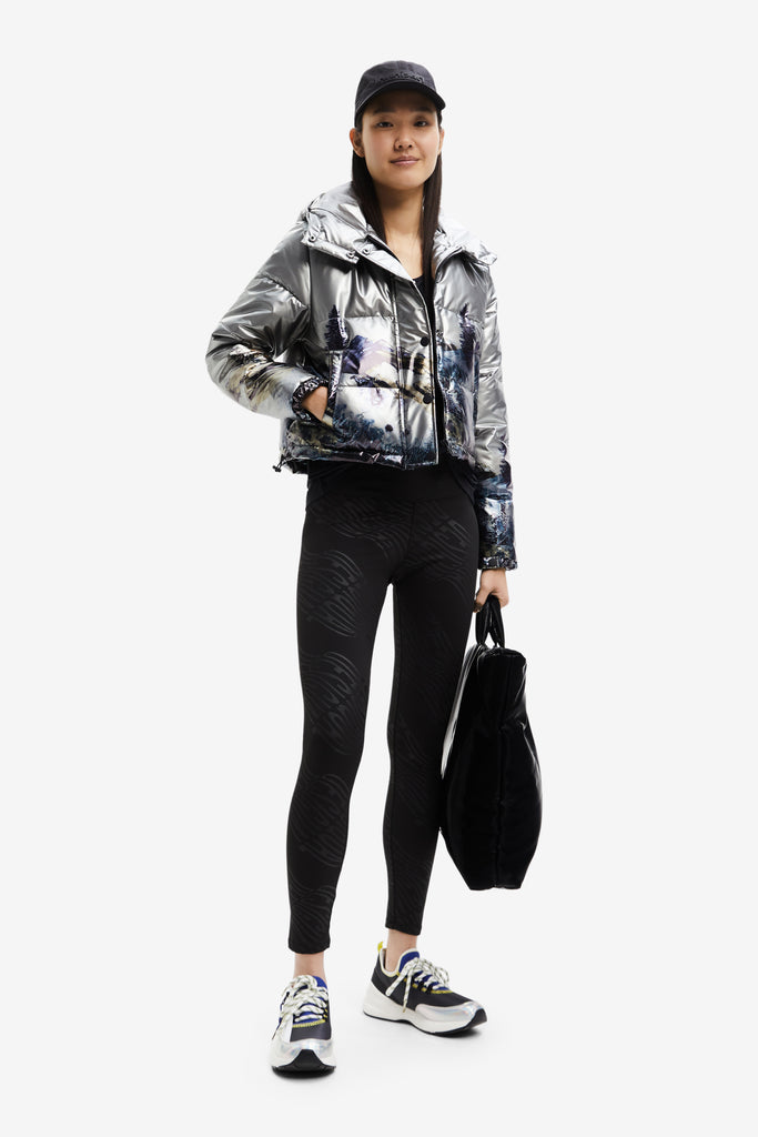 100% POLYURETHANE 100% POLYESTER This warm quilted jacket, made from recycled fibres, features a photographic digital print with a metallic finish. With contrasting buttons, zip and laces.