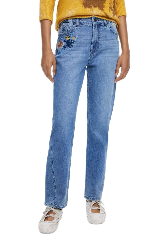Desigual Sunflower Blue Straight Jeans with Floral Embroidery 25WWDD23