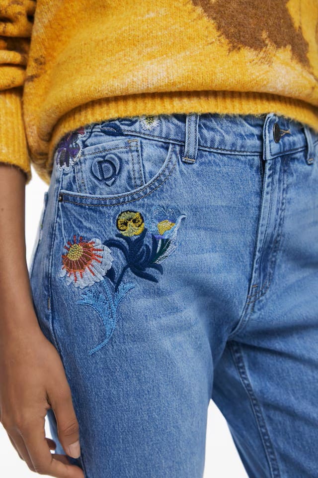 Long straight-cut jeans with floral motif embroidery on the hip area.
