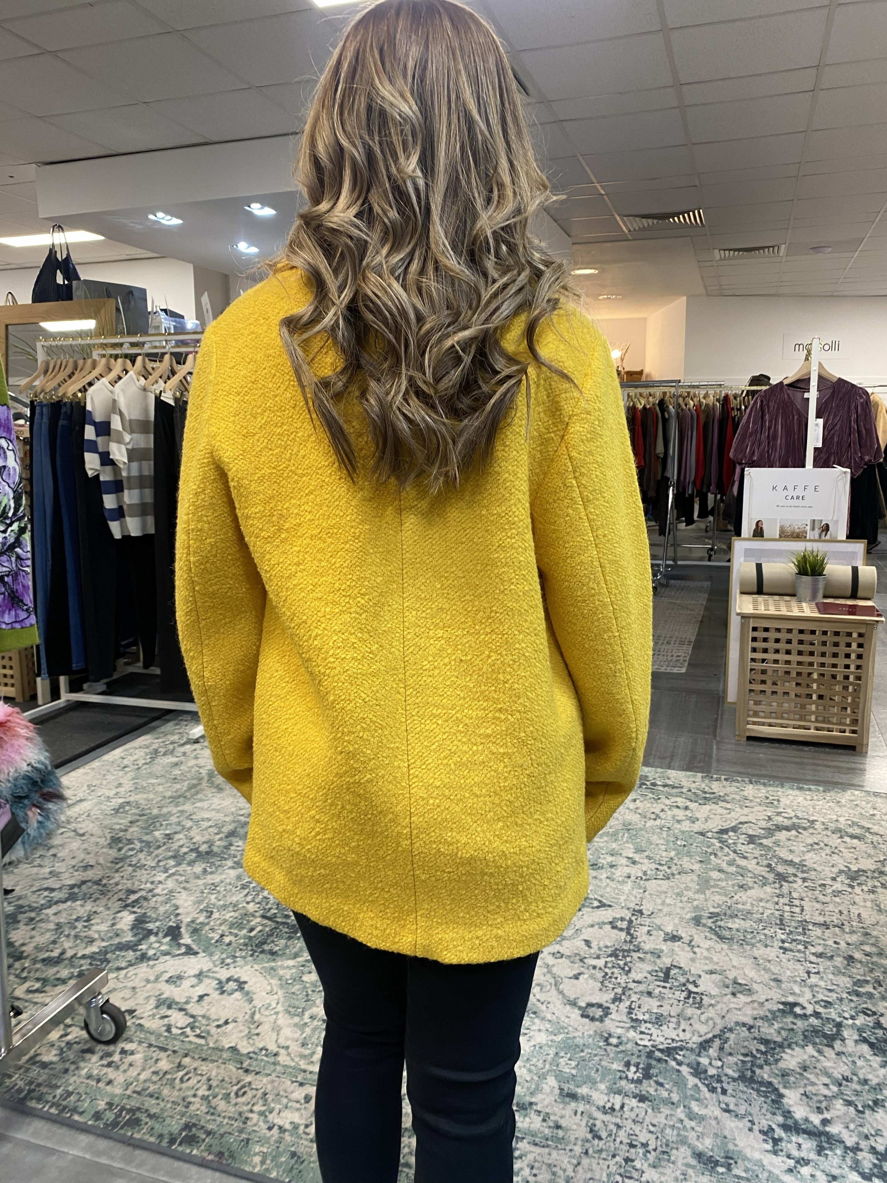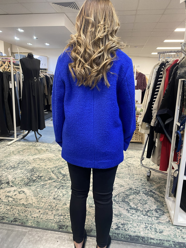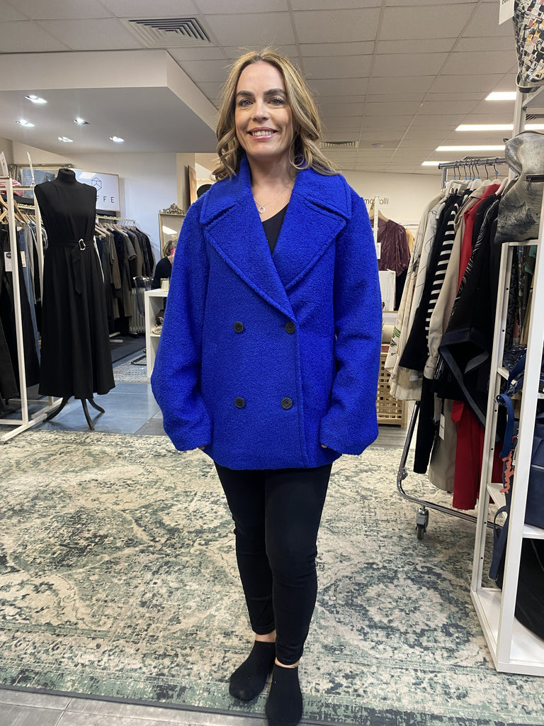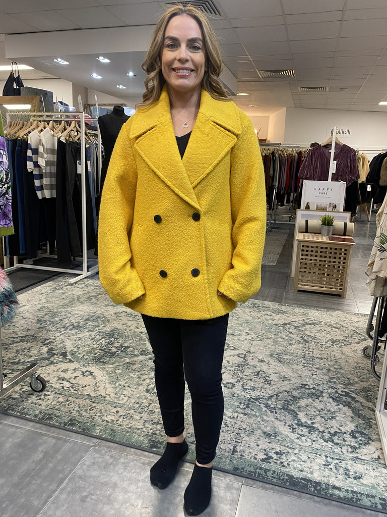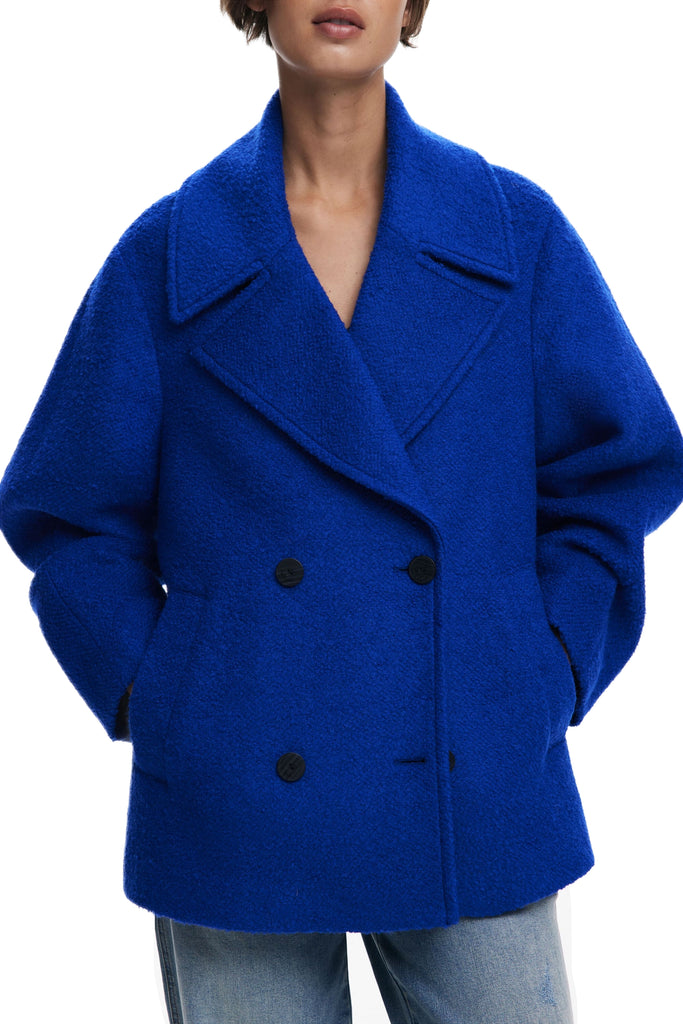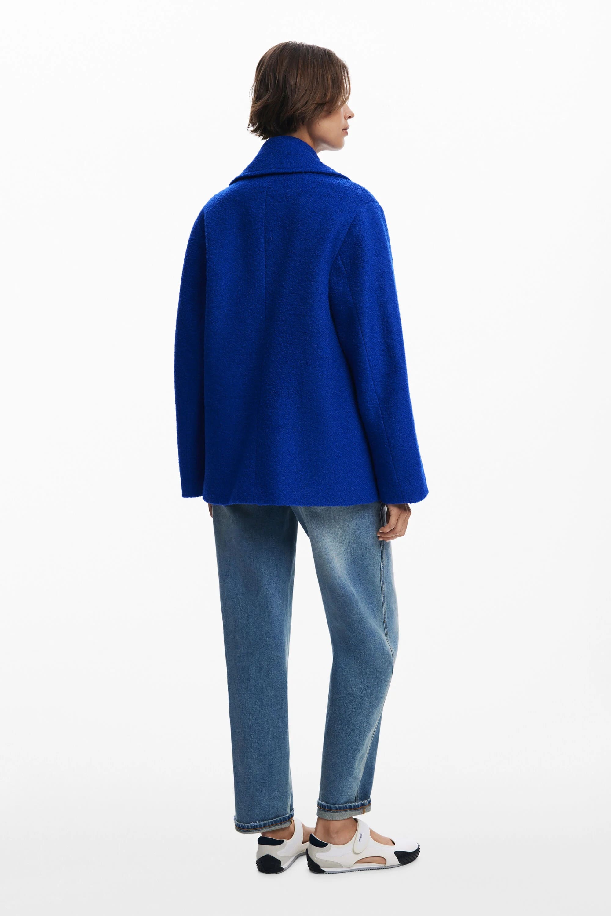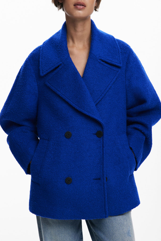 Short boucle coat with lapel collar, double-breasted front, and solid color pockets.