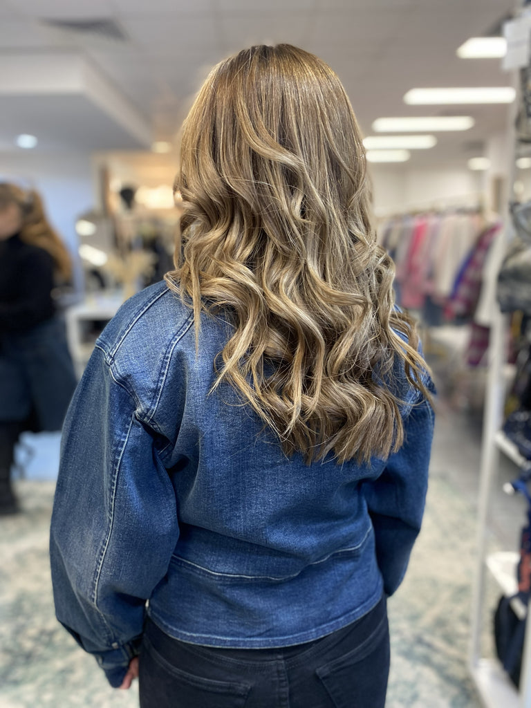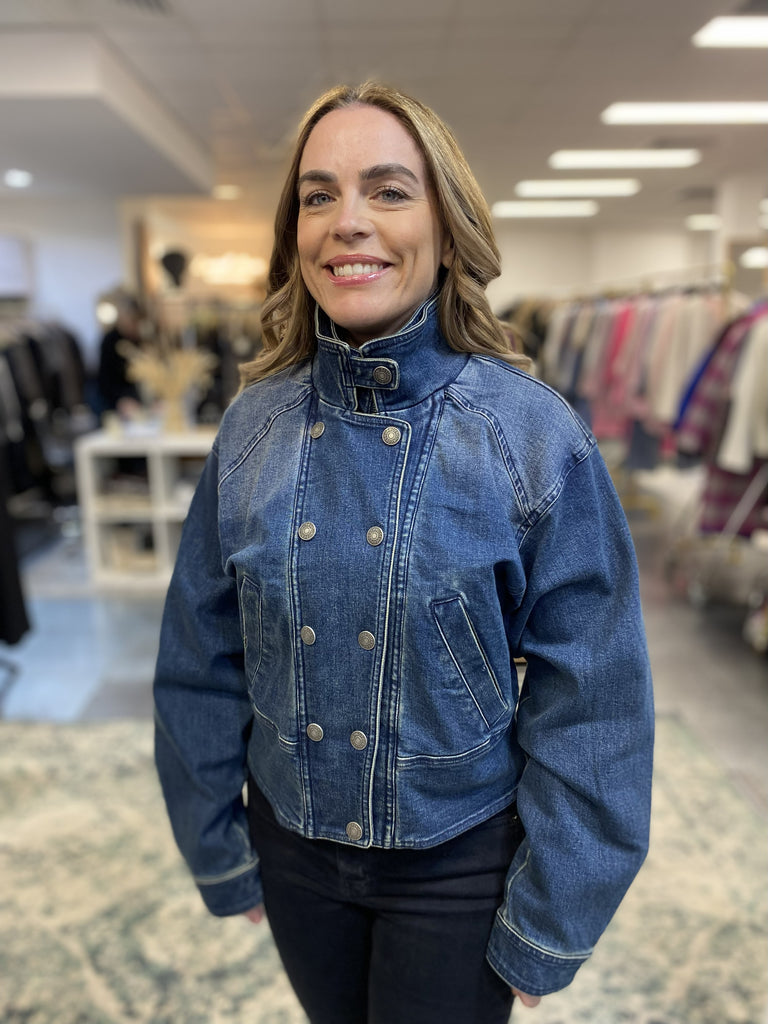 Trucker-style denim jacket, cropped, fitted at the waist, with double collar and double front buttoning.