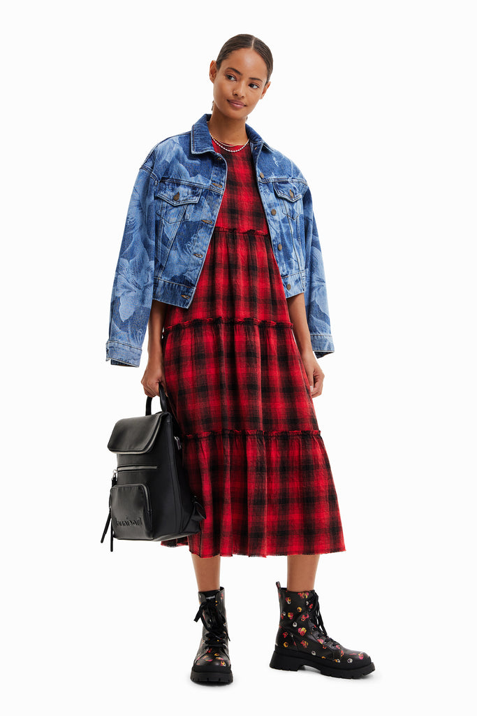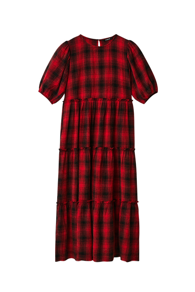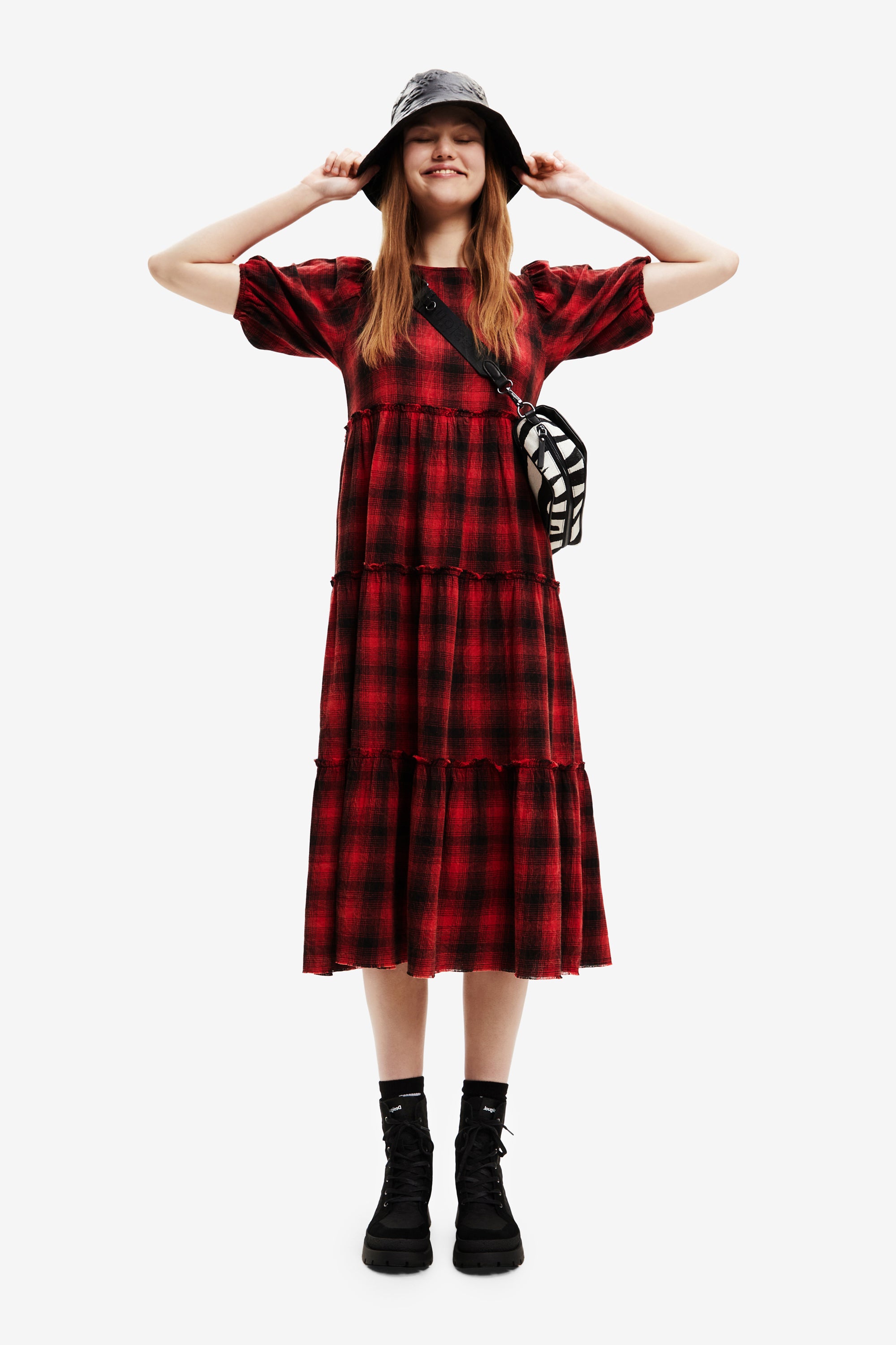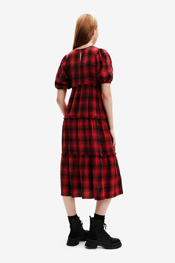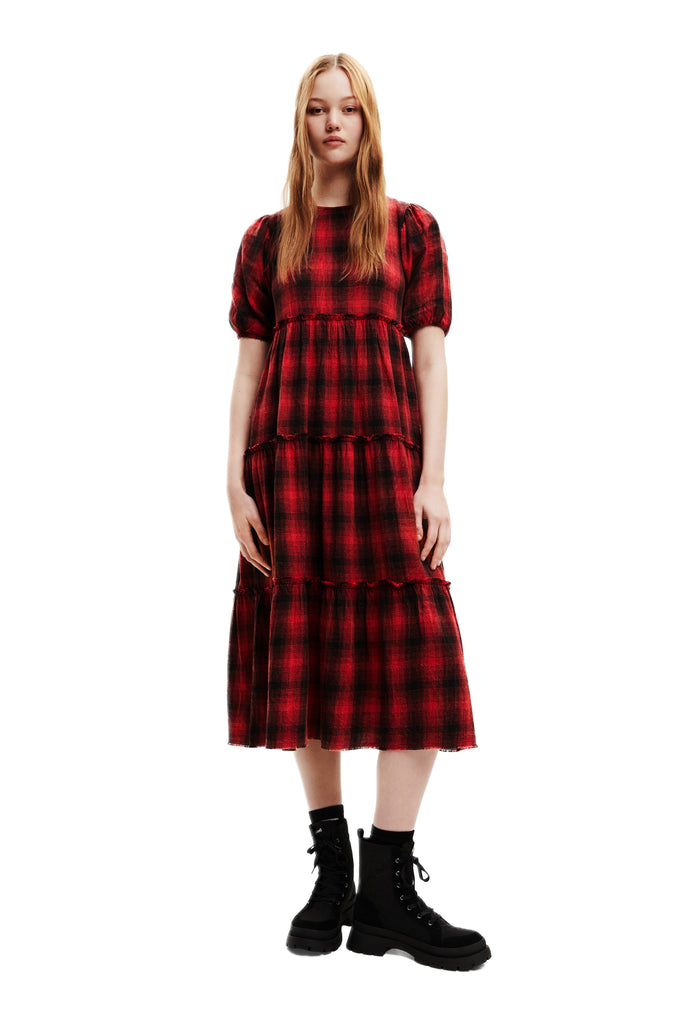Desigual Khan Smock Dress 22WWVW51 Plaid adds a grunge touch to a very light and comfortable dress. Made from red checked cotton with short balloon sleeves and a layered midi length.