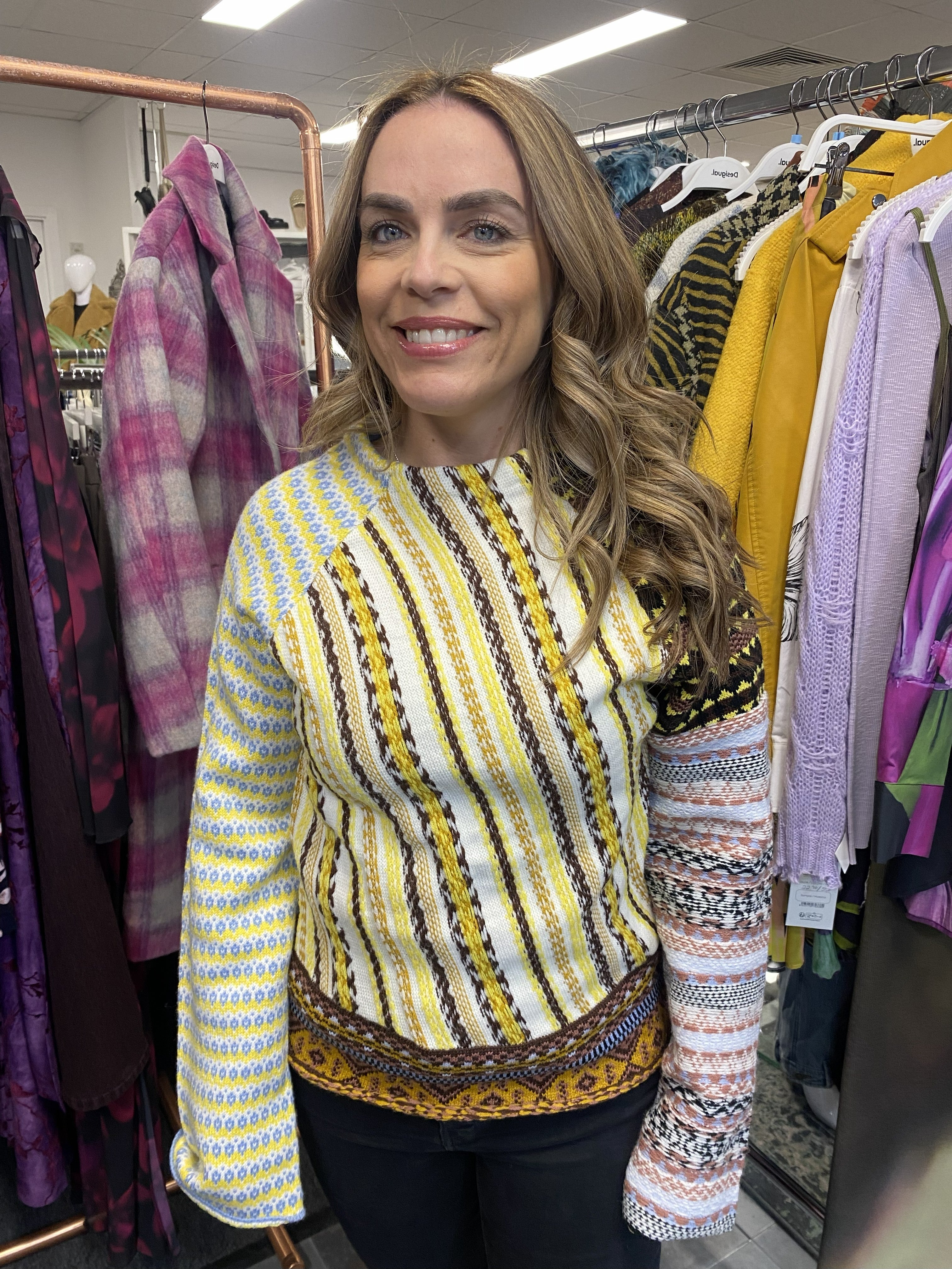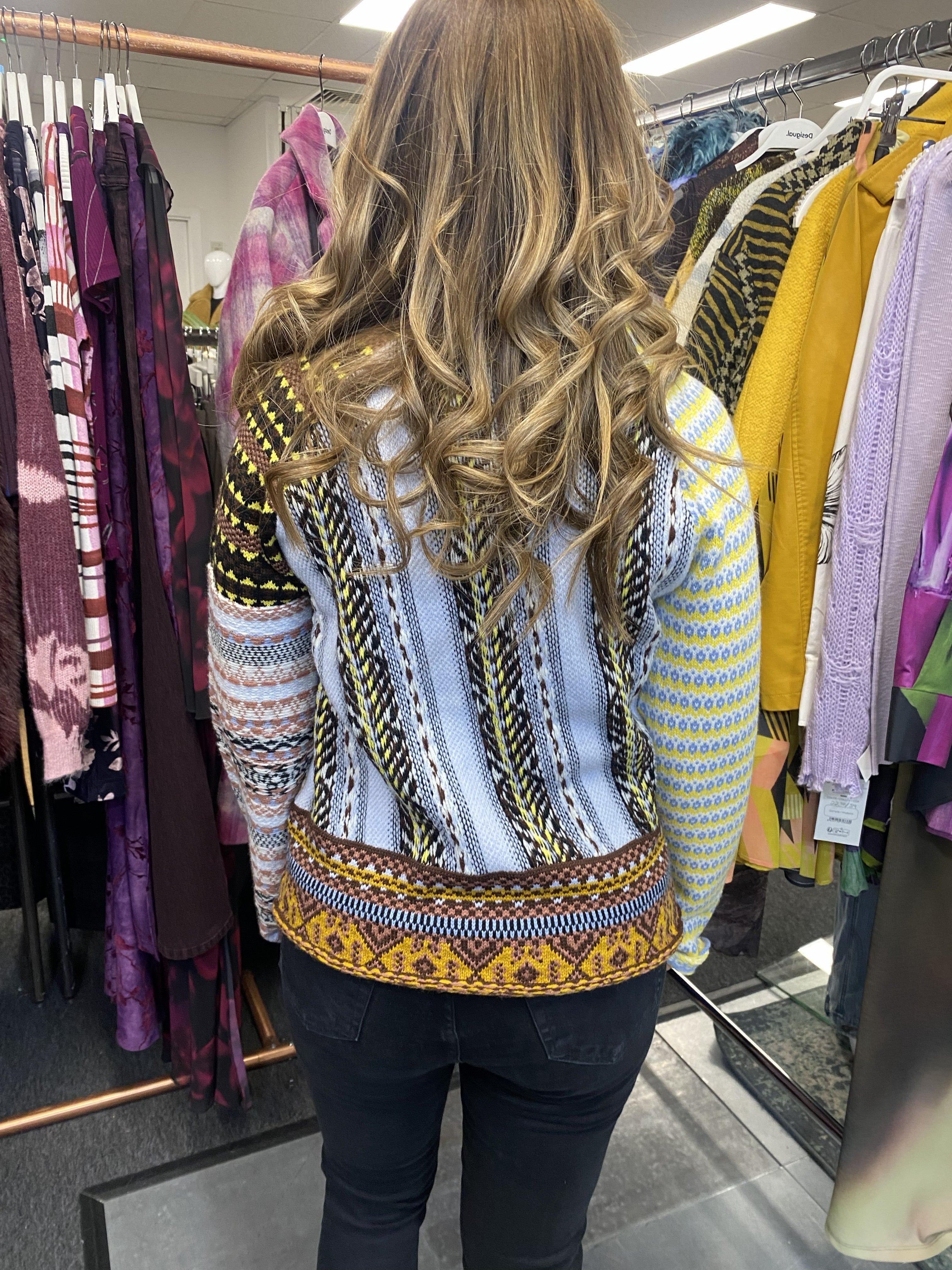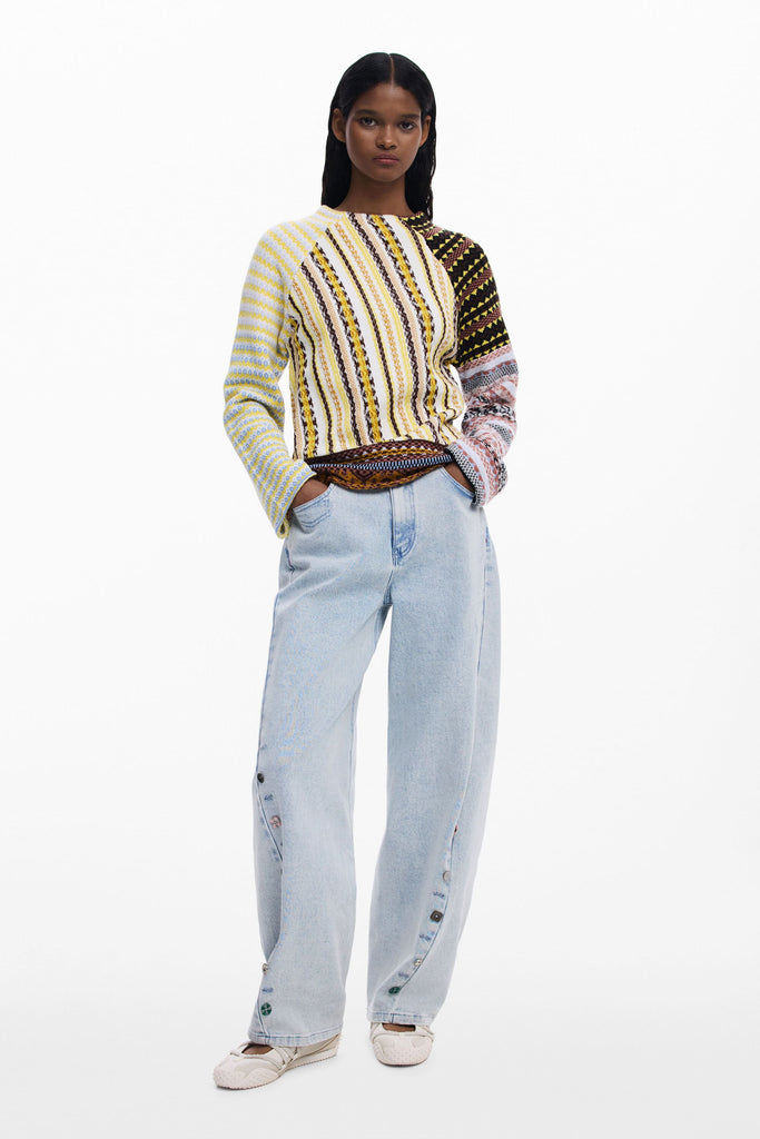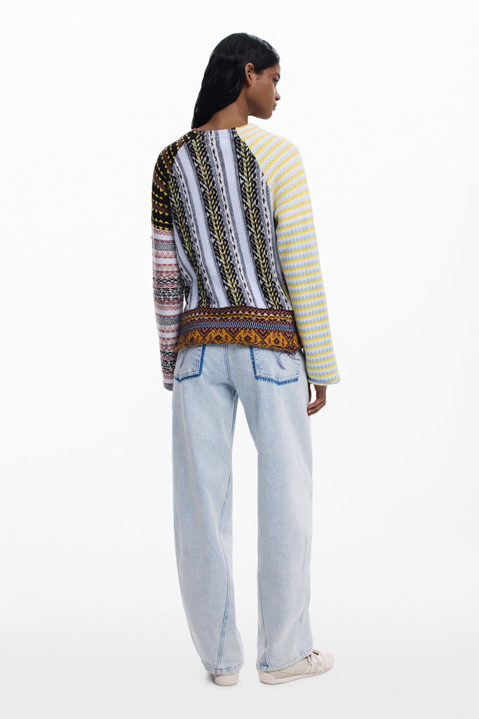 Product details Long-sleeve turtleneck sweater with a combination of ethnic-inspired prints. Fit: Regular Sleeve: Long Model’s measurements: Height: 178 cm; Waist: 54 cm; Hip: 86 cm Model size: M SKU: 25WWJF259019 Composition and care Outer fabric composition: 50% ACRYLIC, 41% POLYAMIDE, 9% WOOL