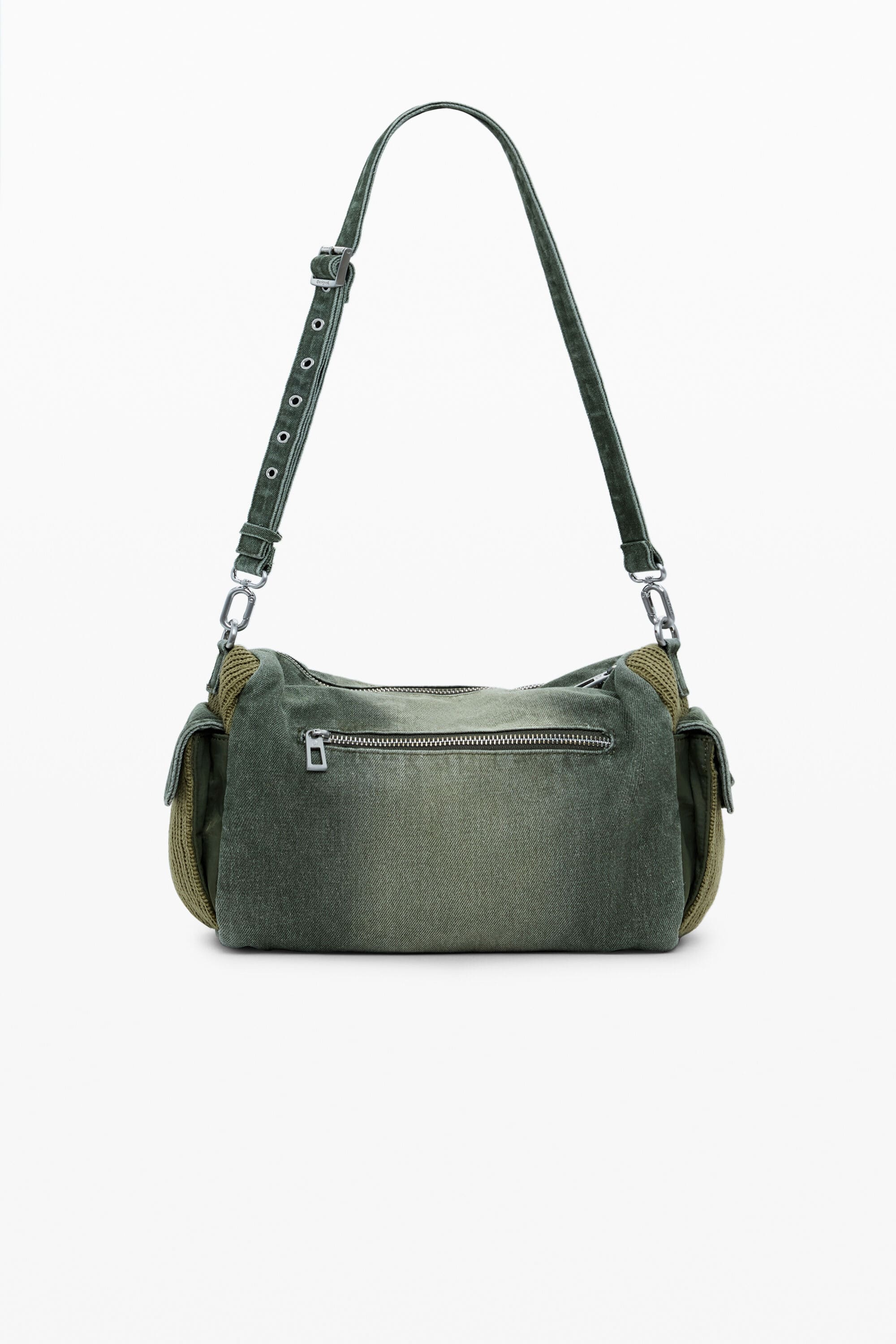 Medium bag with different pockets, worn effect, metallic appliqués, and interchangeable straps.