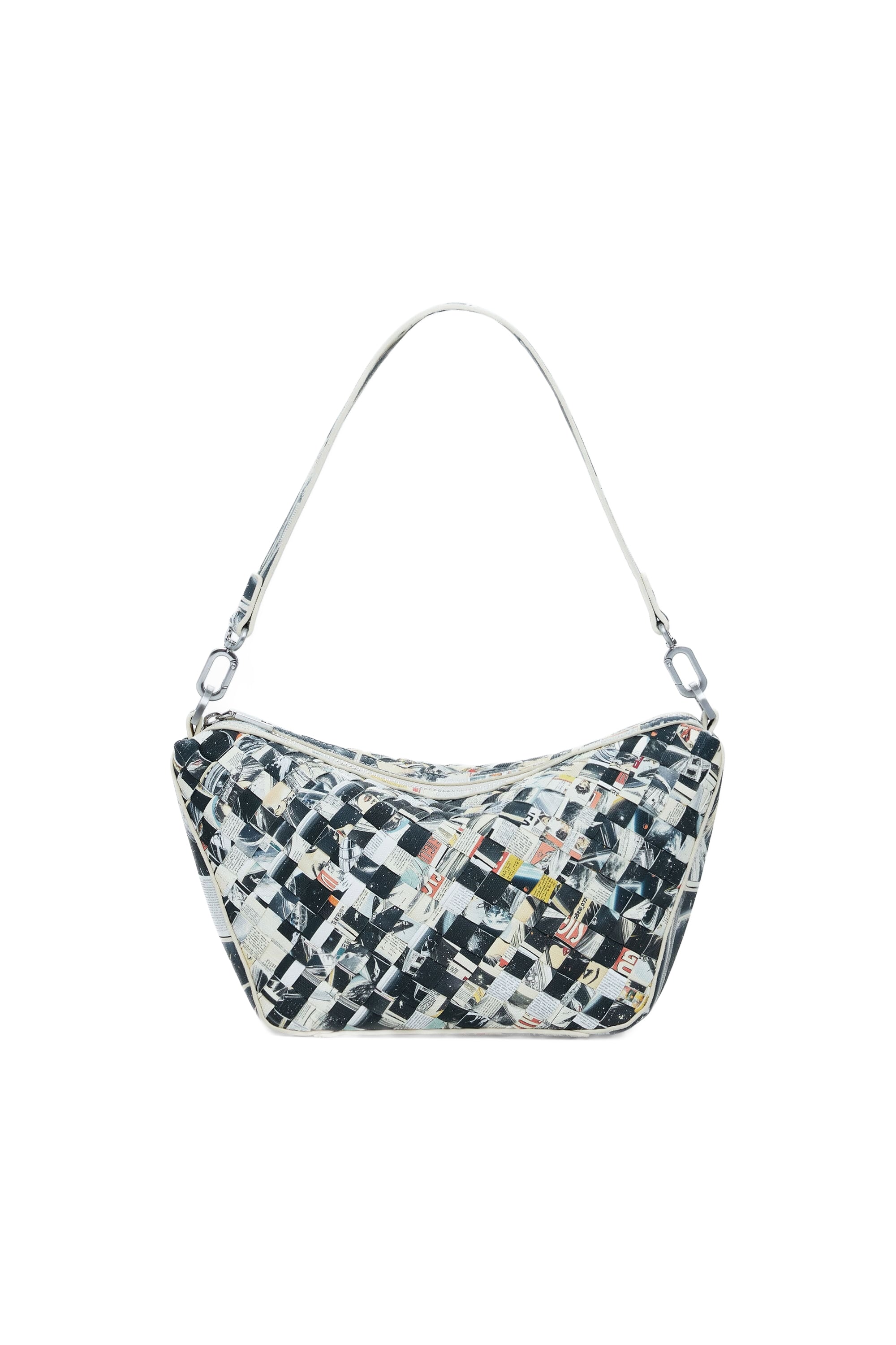 Crossbody-style bag made of braided leather-effect material, multiple compartments, and zipper closure.