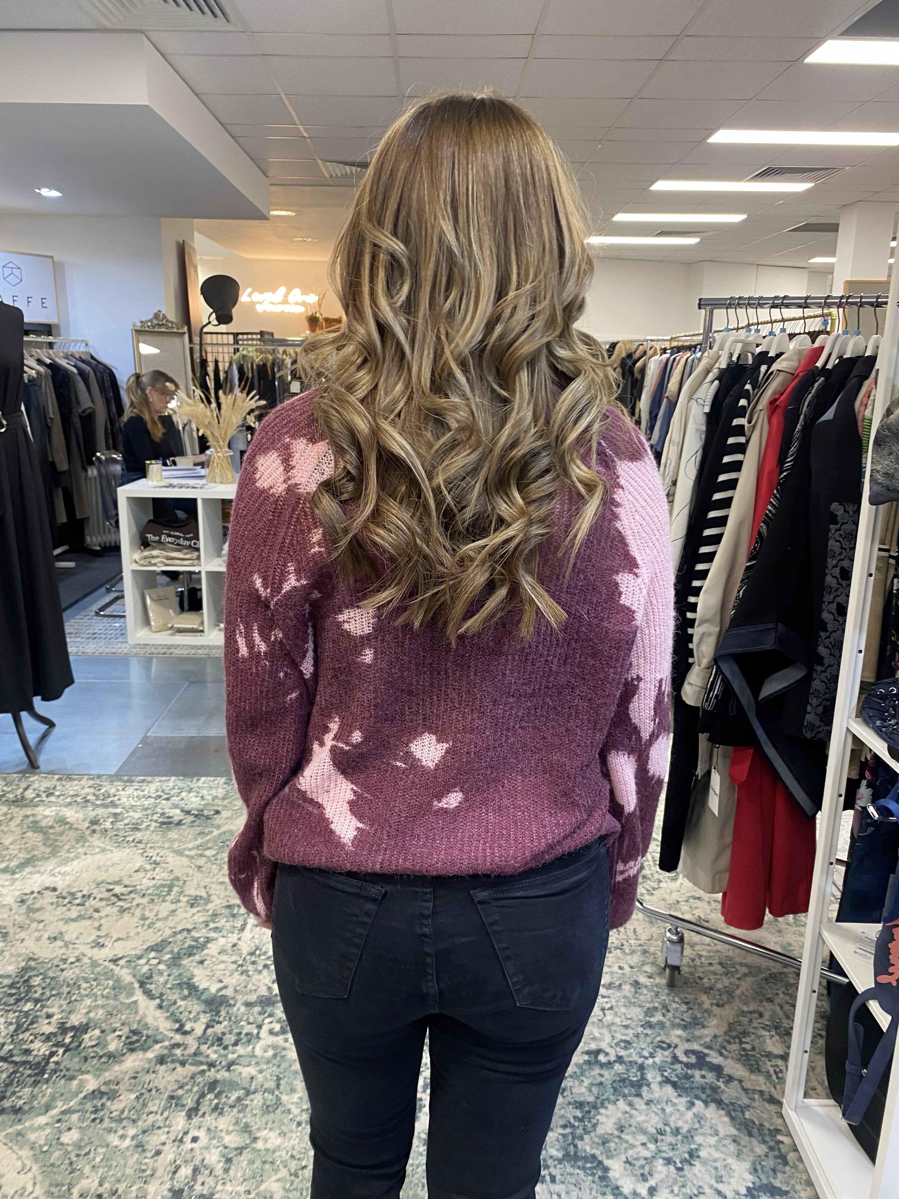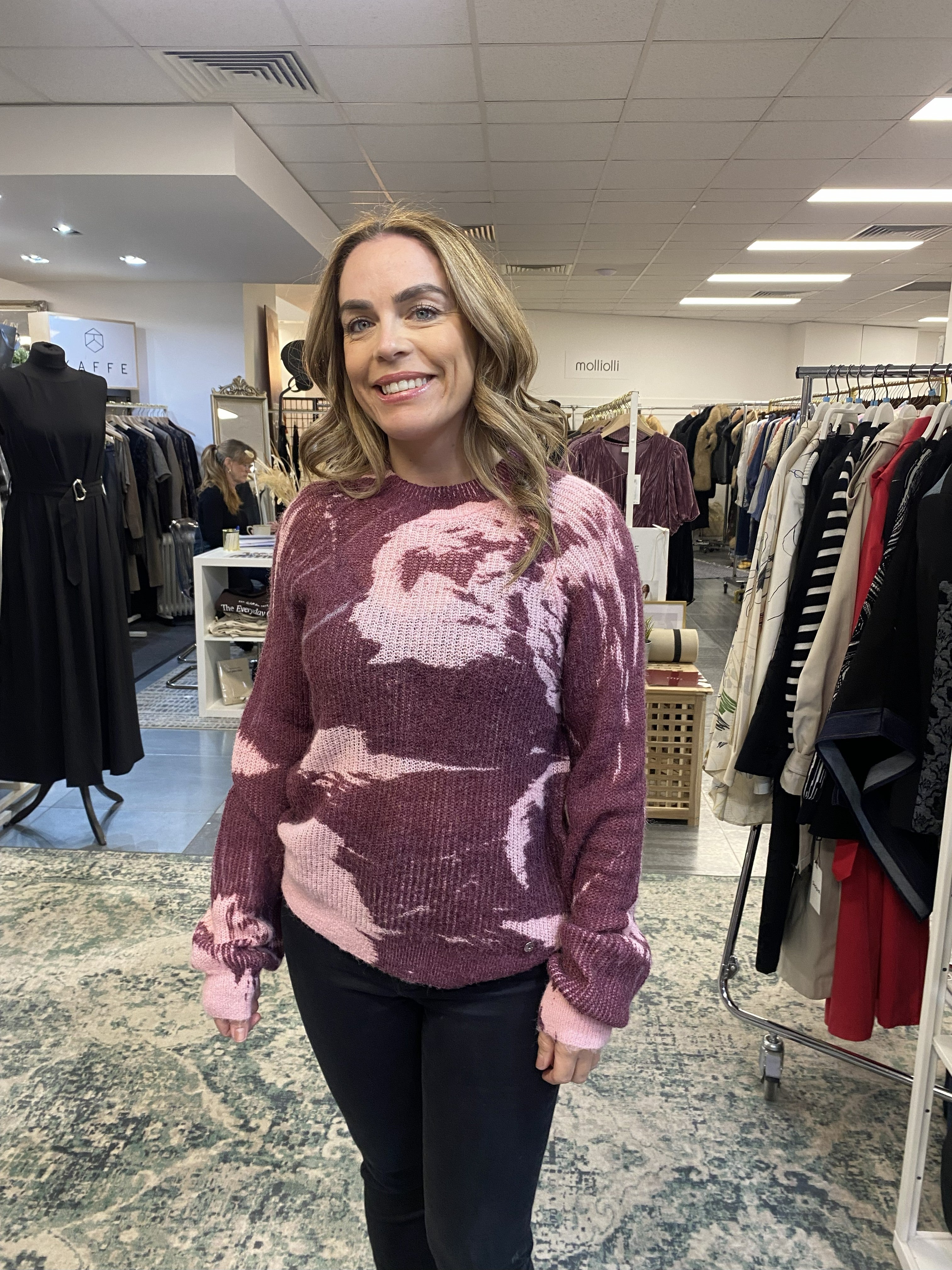 Textured sweater with a round neck, long raglan sleeves, and a sinuous shapes print