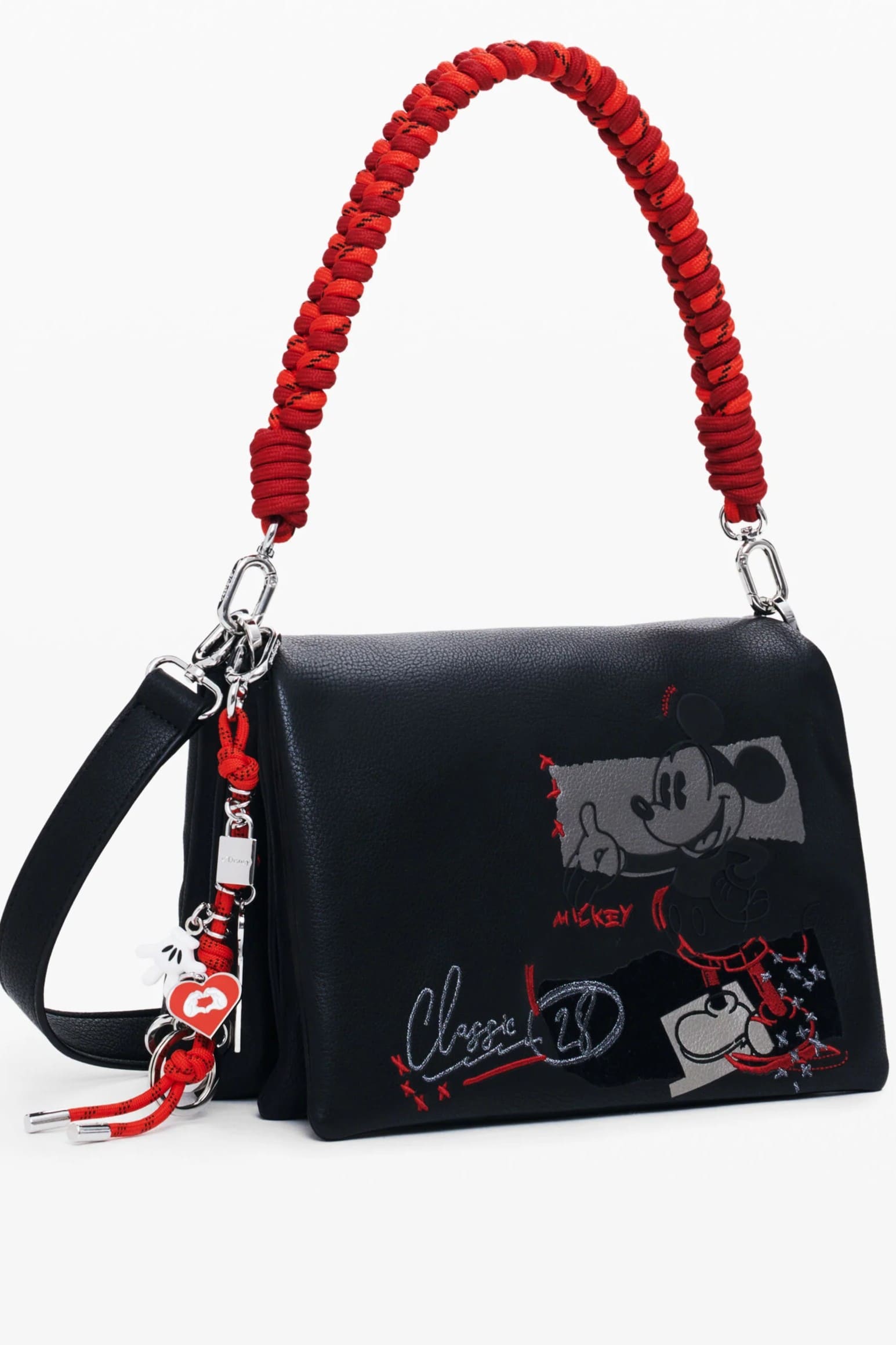 Crossbody style bag in faux leather fabric, with multiple interior compartments, interchangeable handles with Mickey Mouse™ print.