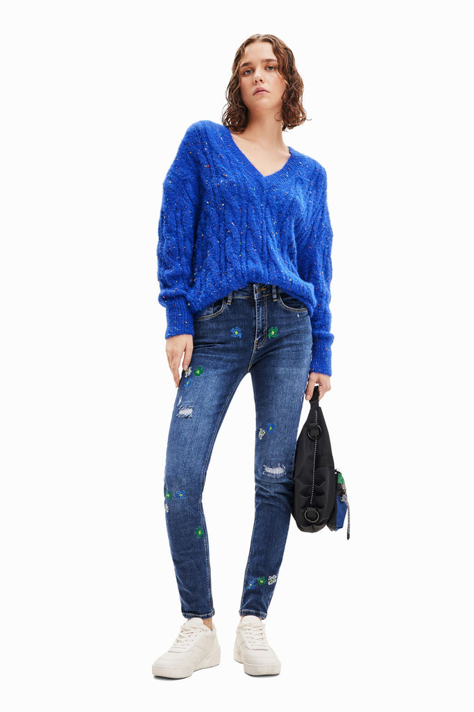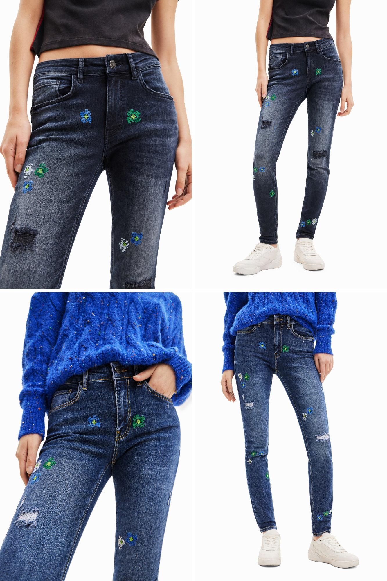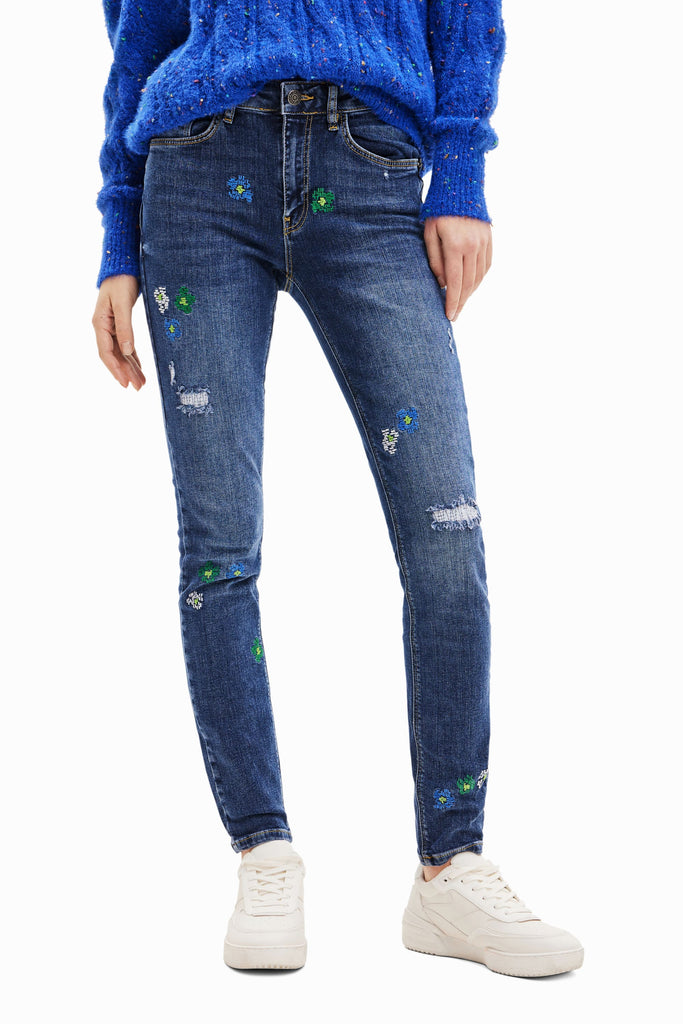 Desigual Bruselas Jeans 23WWDD17 Mid-rise fitted jeans in a very comfortable stretch fabric, with a push-up effect on the derriere. Featuring a ripped detail and embroidered flowers.