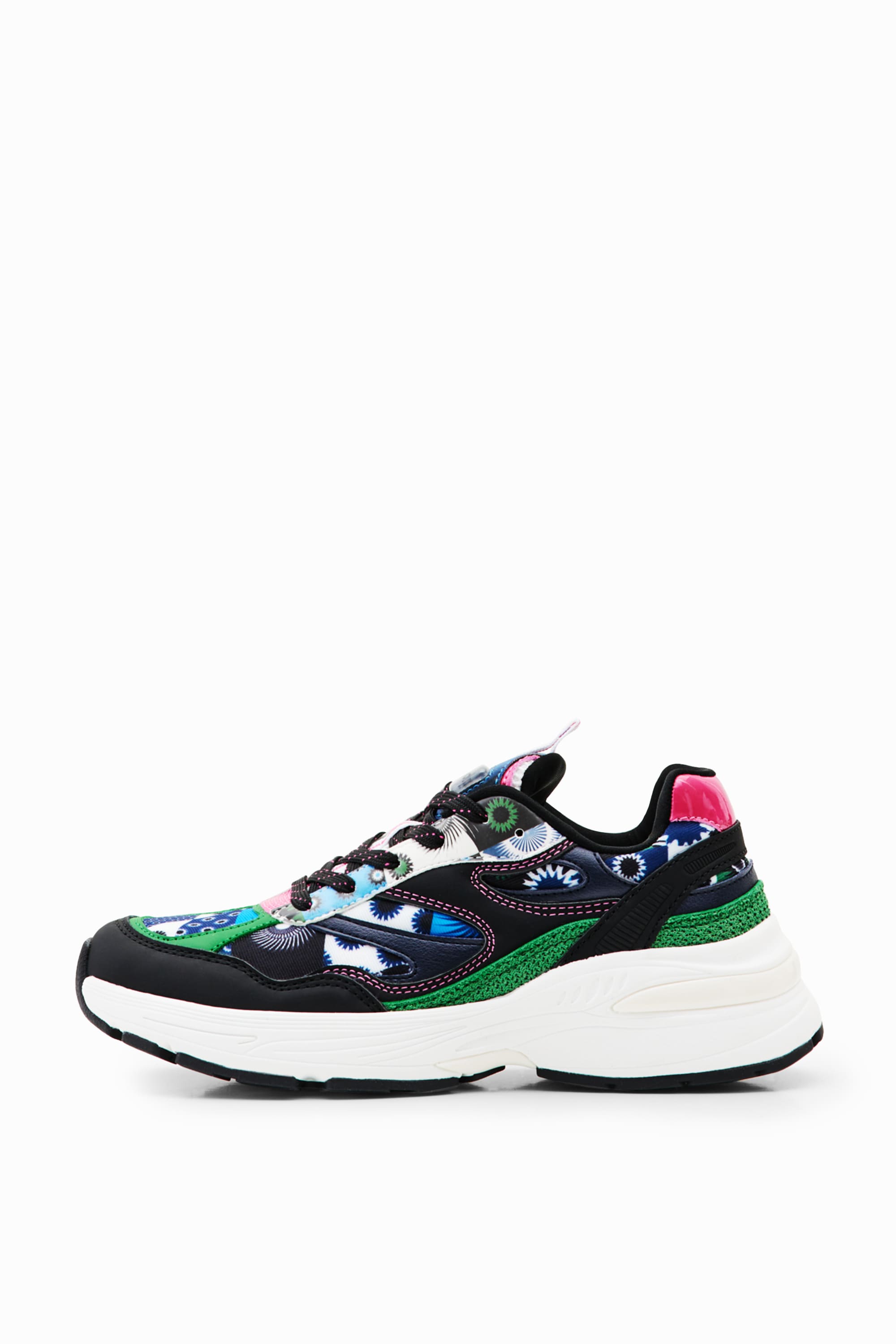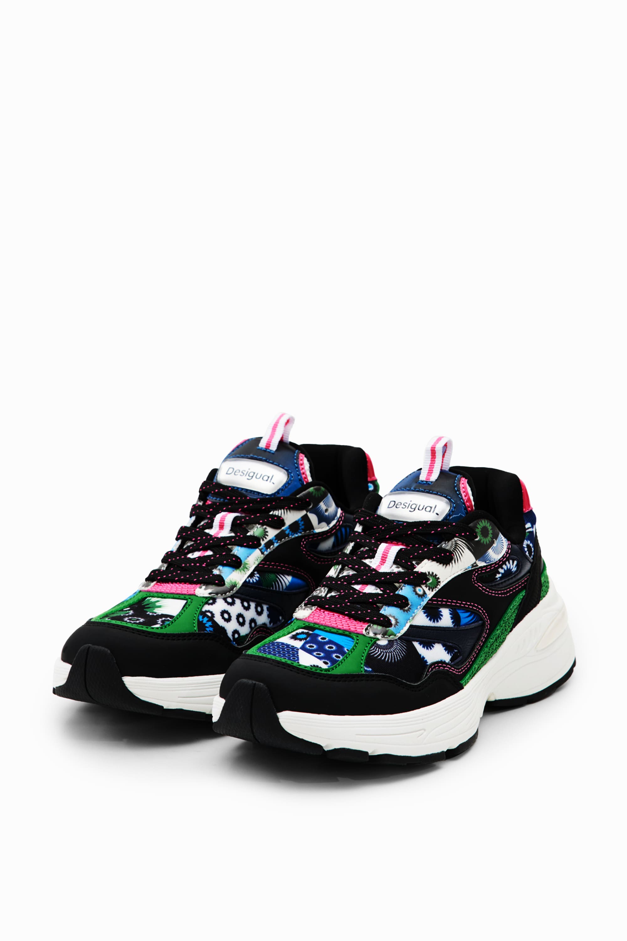 Desigual Moon Patch Trainers 23WSKA11 Anatomically shaped running-style sneakers in a patchwork of different fabrics with a geometric print and contrasting details.