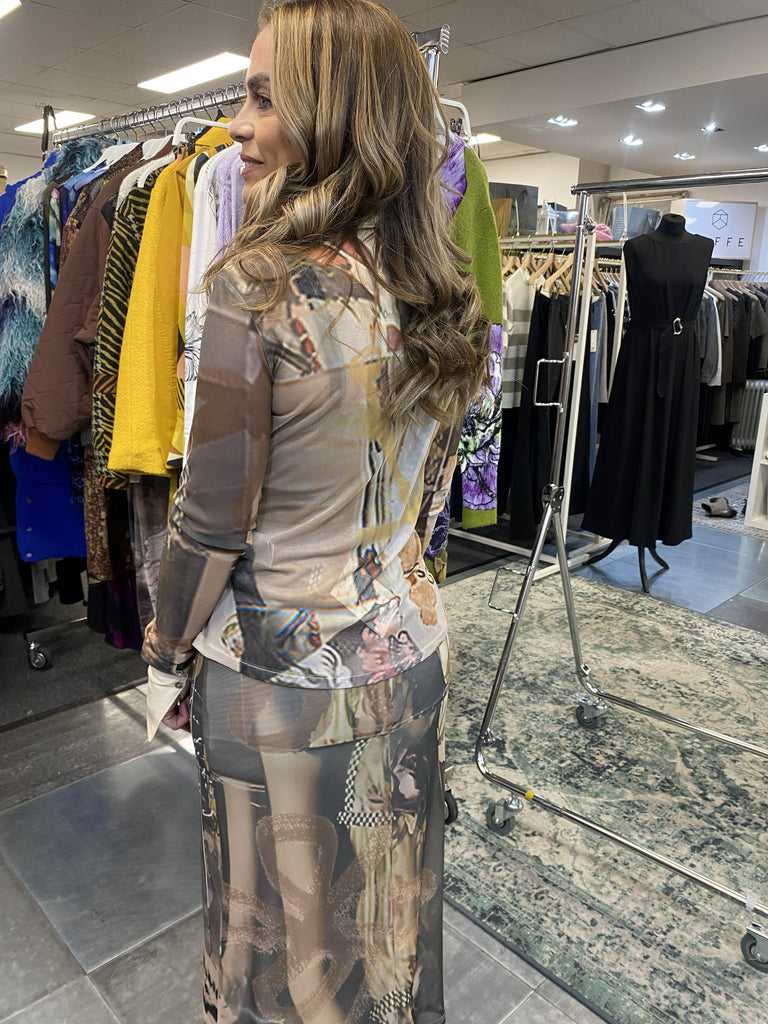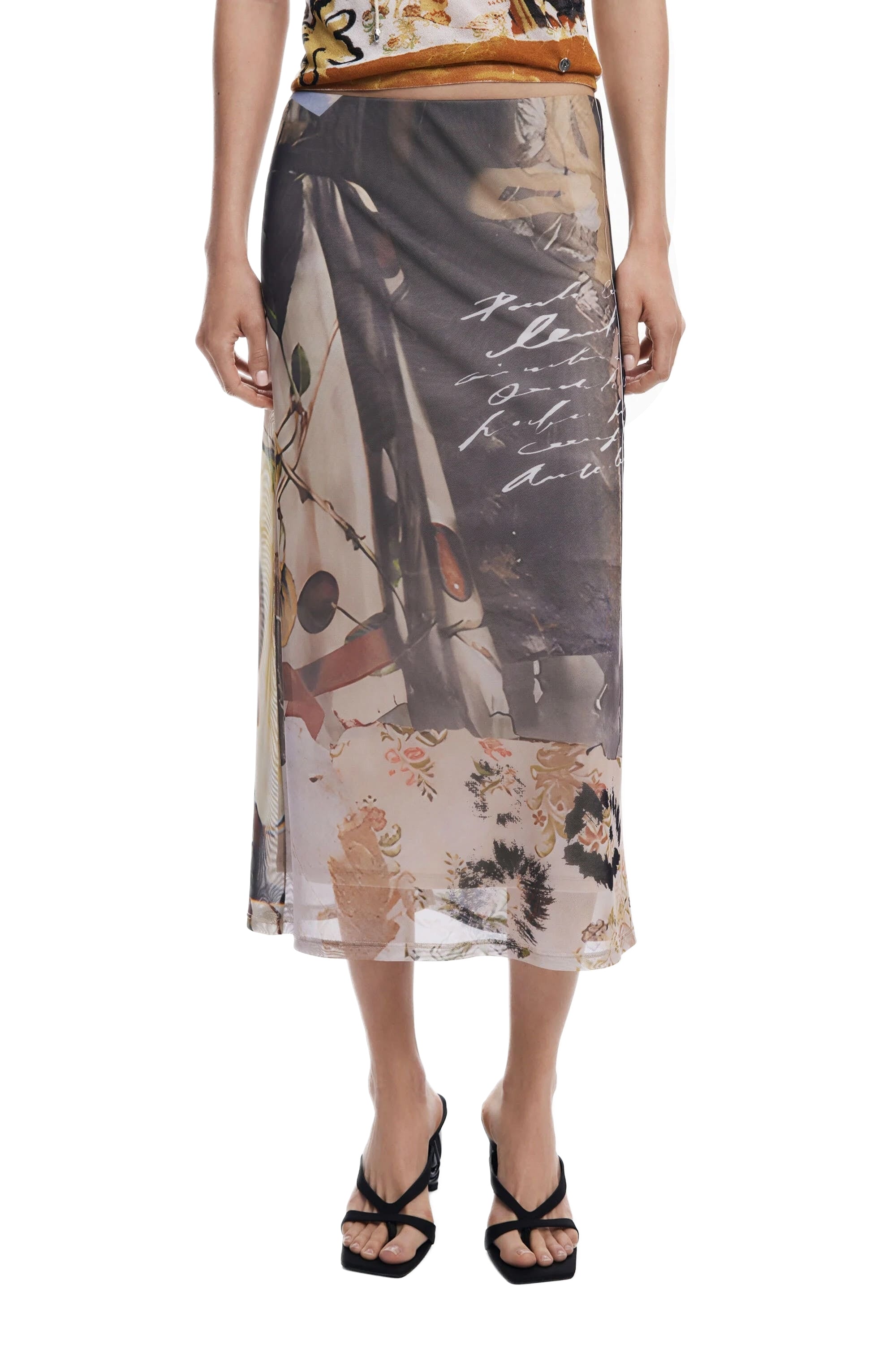 Midi skirt up to the knee in tulle with elastic waistband and Collage effect print.