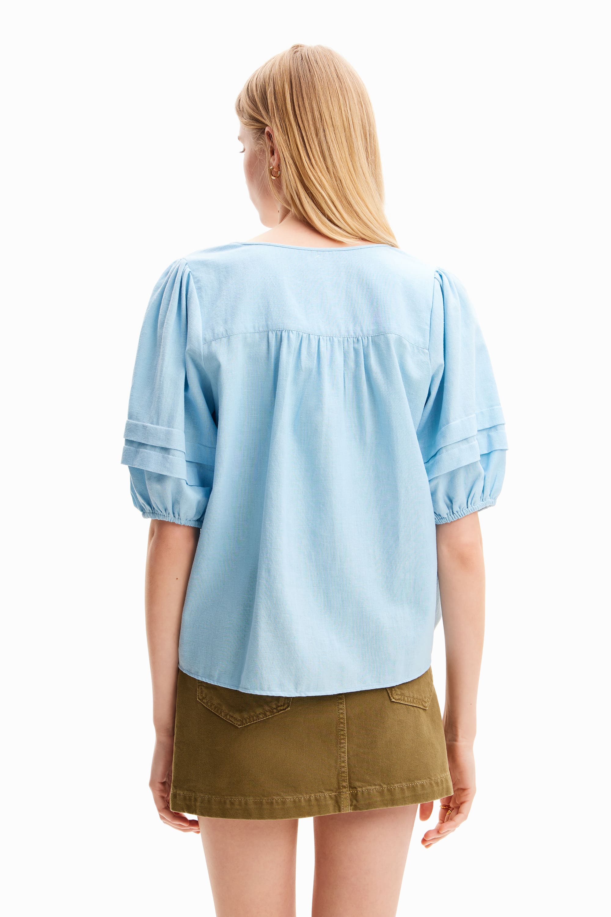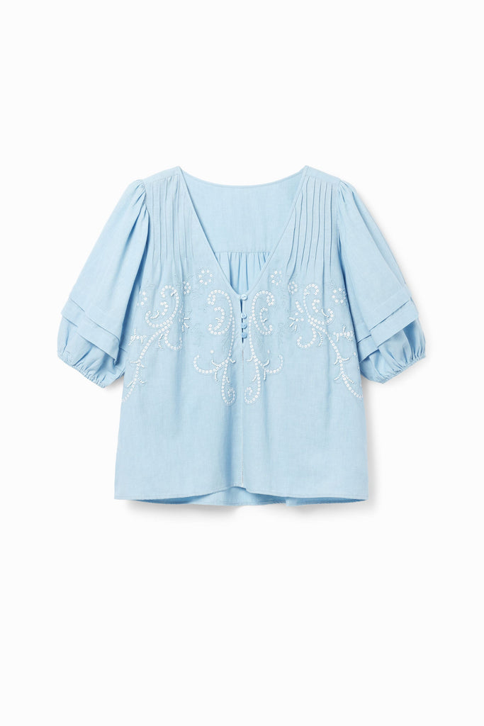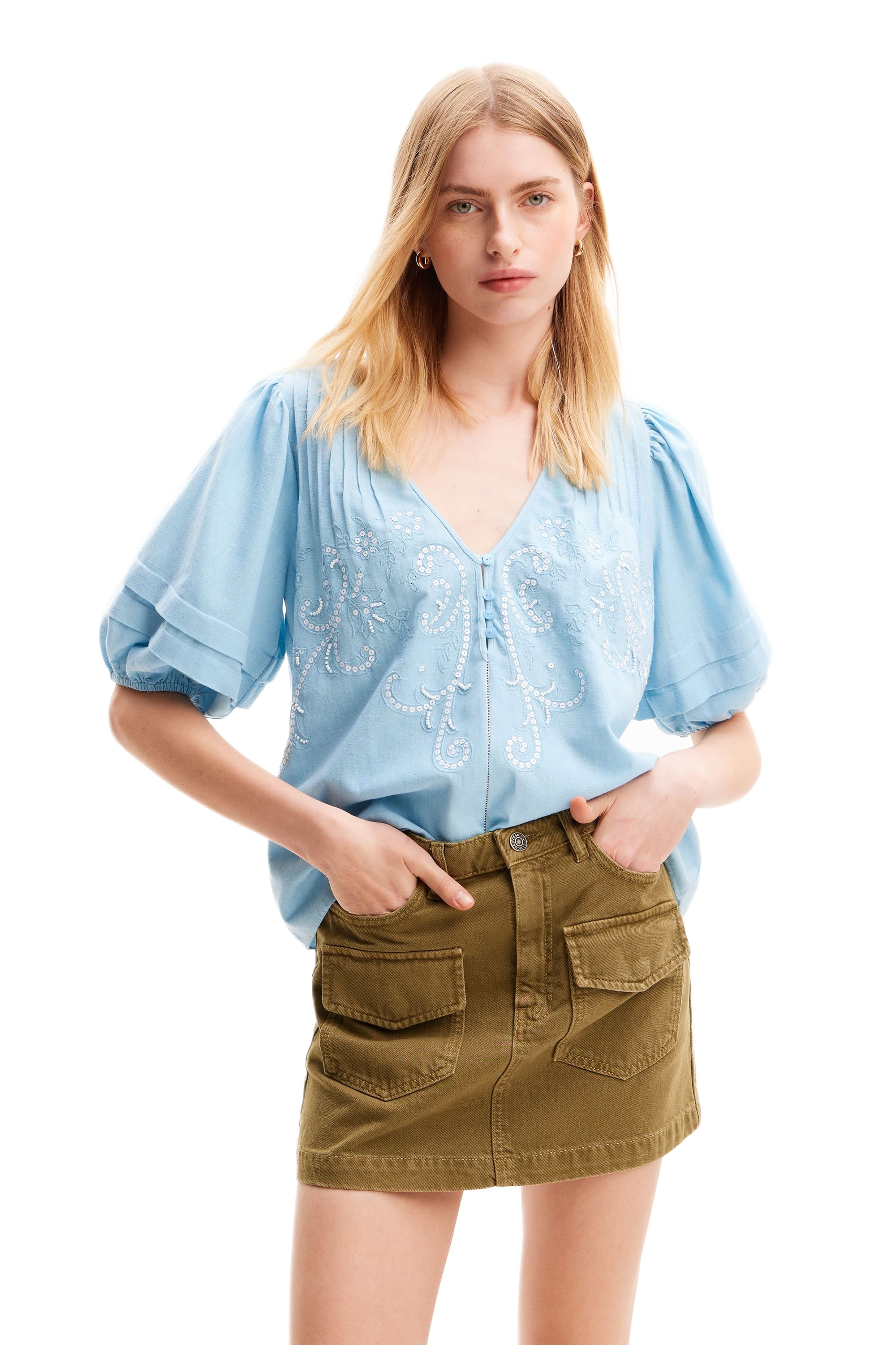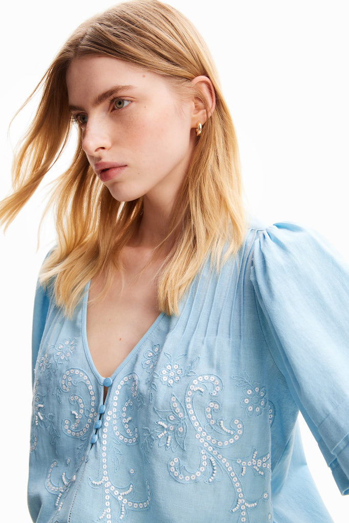 Desigual Camille Blouse 24SWBW06 A 3/4-sleeve wide blouse with buttons, pleats and sequin embroidery.