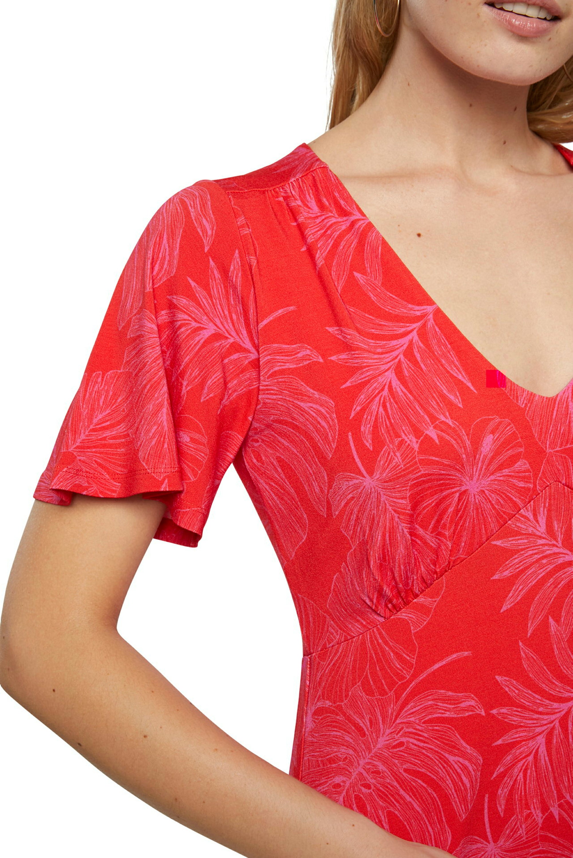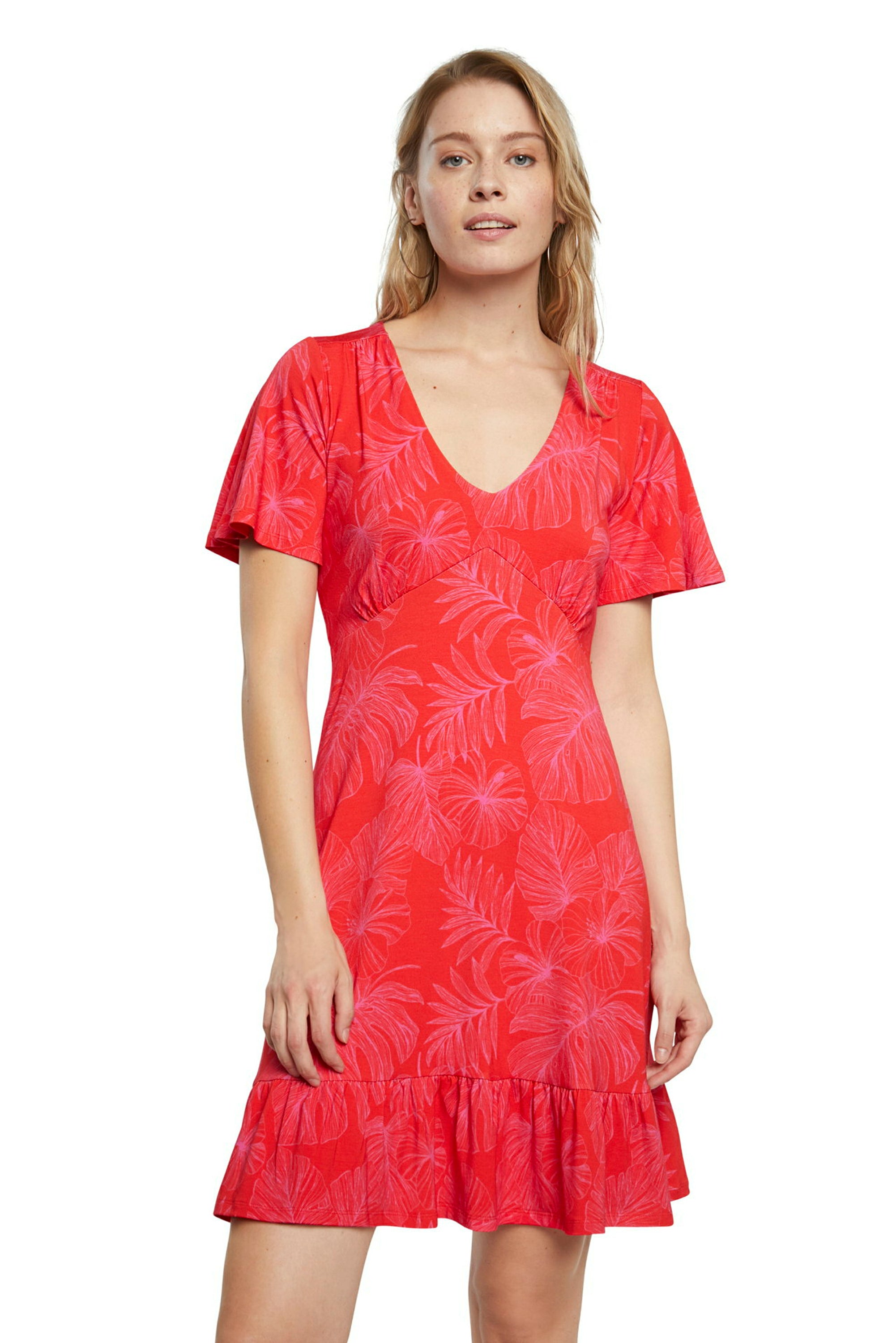 Fluidity is the main attraction of this knee-length dress with V-neck and short sleeves. Both the hem and the sleeves have flounce that emphasizes their fullness on a cool print.