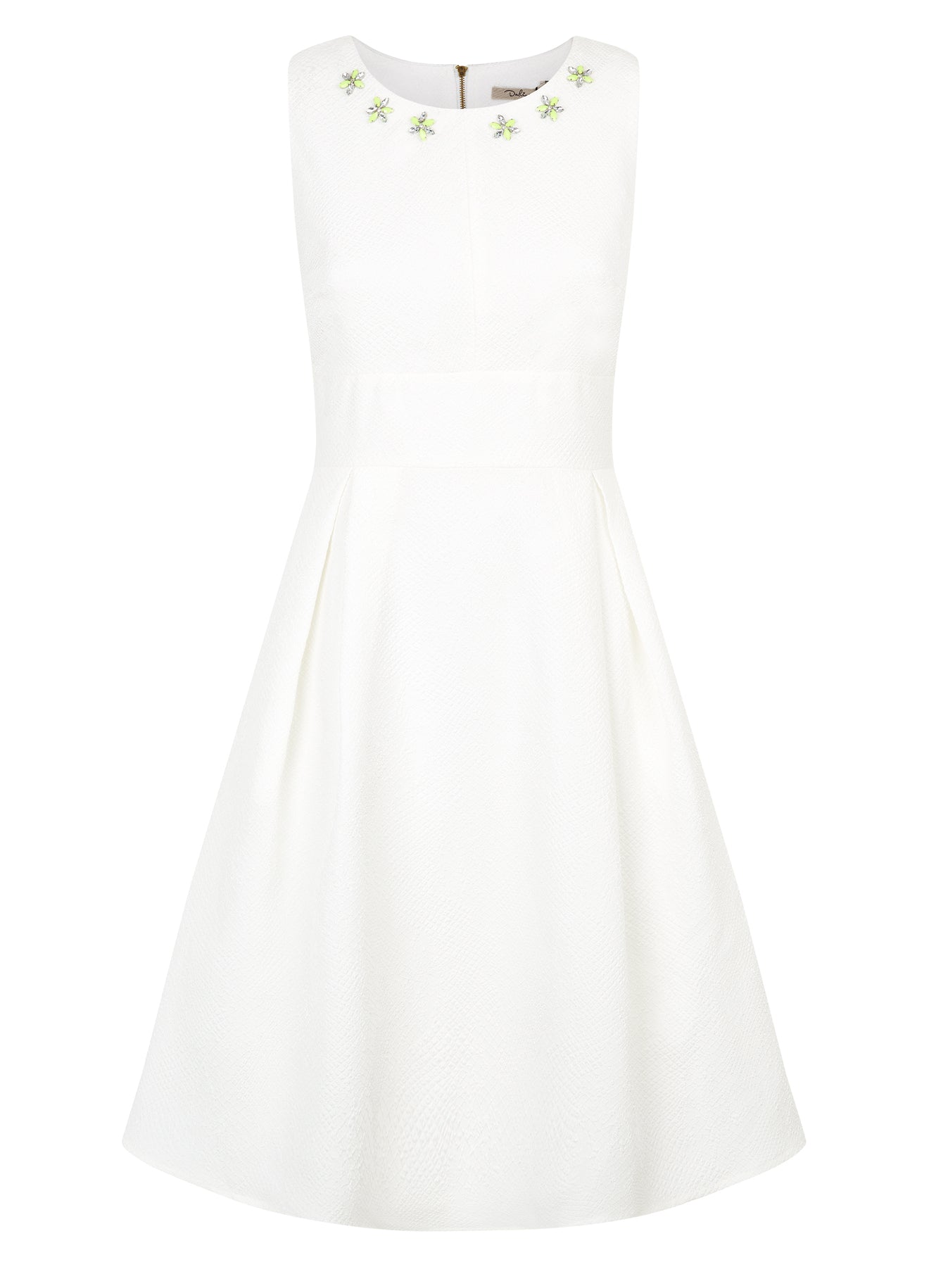 Swirl into summer in our beautiful Payton Embellished Dressed. Diamante and neon beading along the neckline give this floaty summer dress some extra cool. Features pin tuck waist and skater skirt to emphasise your shape.