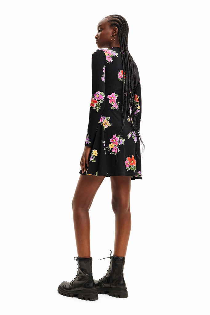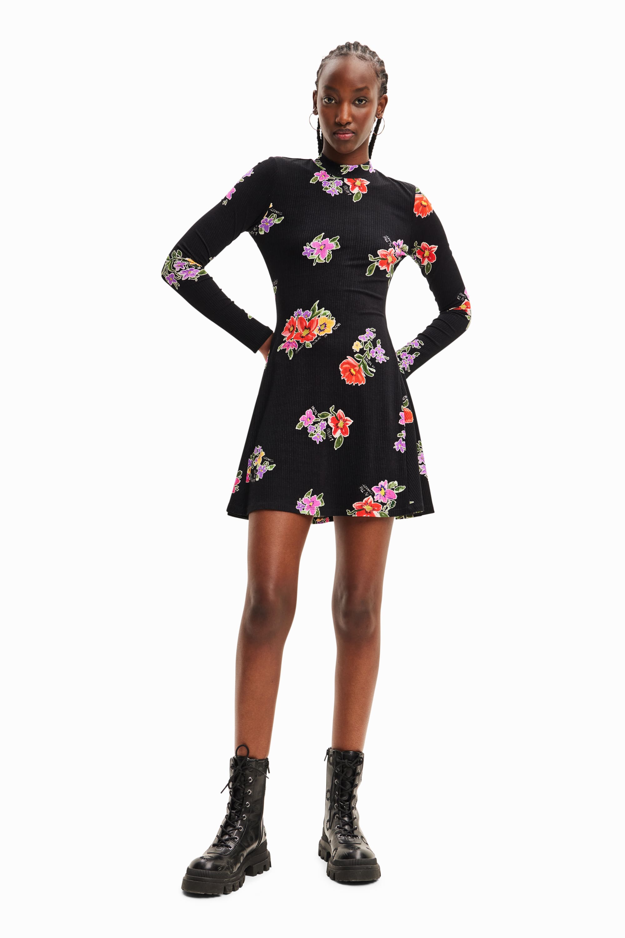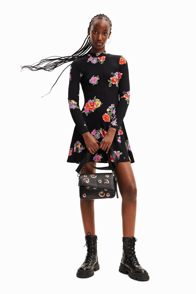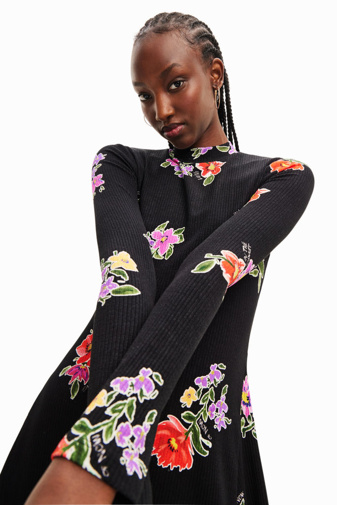 Desigual Petony Dress 23WWVK29 A fitted short dress with long sleeves in a skater style, with an A-line skirt and ribbed knit with a floral print. Fit: Slim Length: Short Arty floral print Perkins collar Long sleeves Stretch ribbed knit Sustainable fibres: Lenzing™ Ecovero™ Garment construction: Fitted Regular Loose SKU: 23WWVK292000 Product Sustainability Eco-Friendy Composition and care Outer fabric composition: 92% VISCOSE, 8% ELASTANE