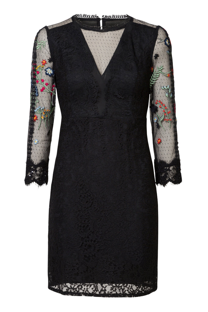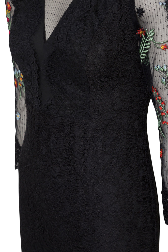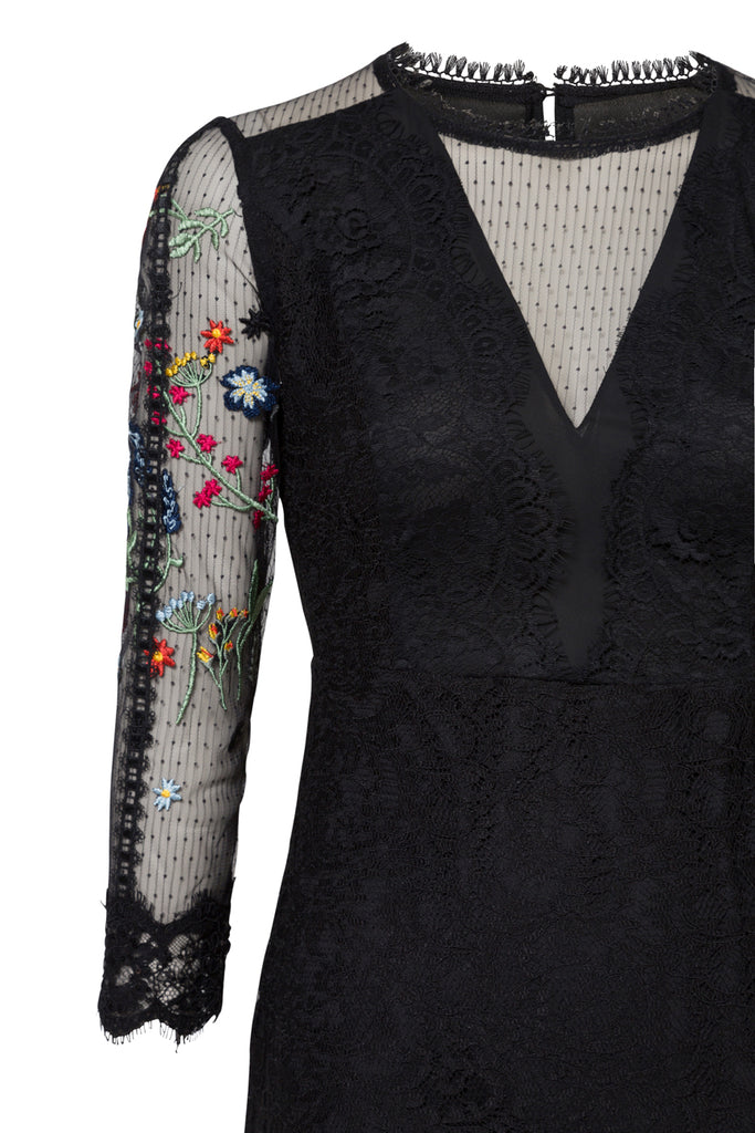 Little black dress with sheer v-neck, sheer sleeves with beautiful floral embroidery and fluted lace bottoms and beautiful lace overlay