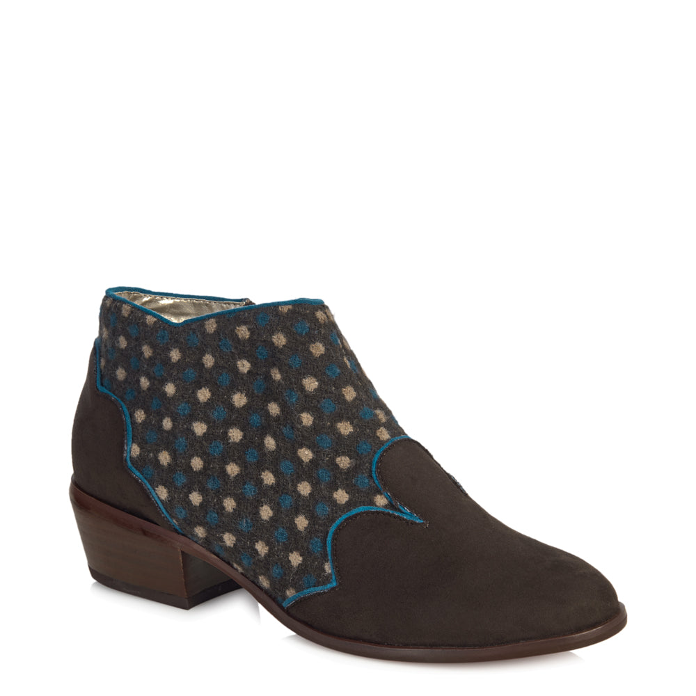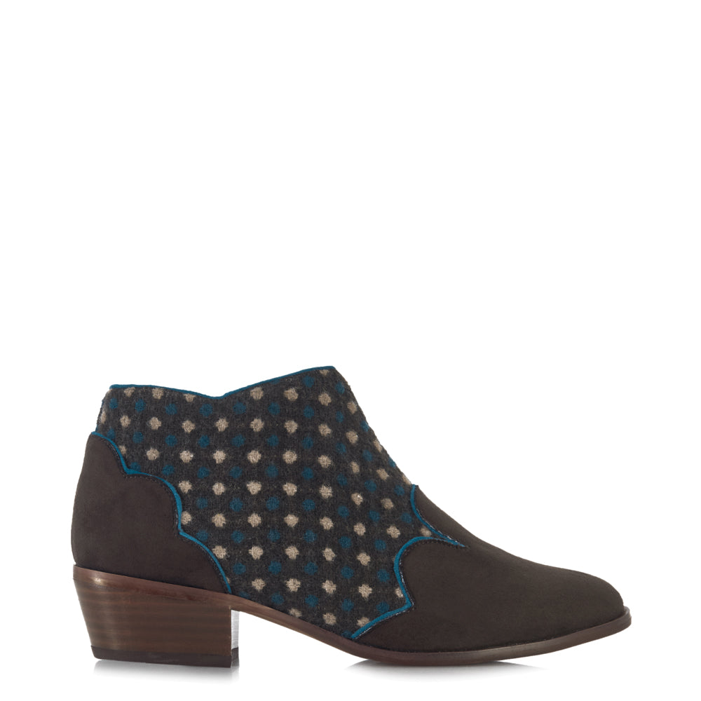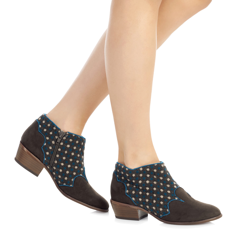 New boot style JULIETTE brings a touch of romance alongside everyday wearability. The medieval styling and contrasting tactile fabrics combine with a practical low heel to make this a boot that will take you anywhere. Choice of black faux suede and lace-effect flocked tweed, set off by narrow metallic trims, or brown faux suede and warm tweed with narrow teal trim. Featuring zip fastening for ease of wear, this style has leather stacked heels. Upper: Textile Lining: Synthetic Sole: Man made materials Heel Height: 40mm 1.6"