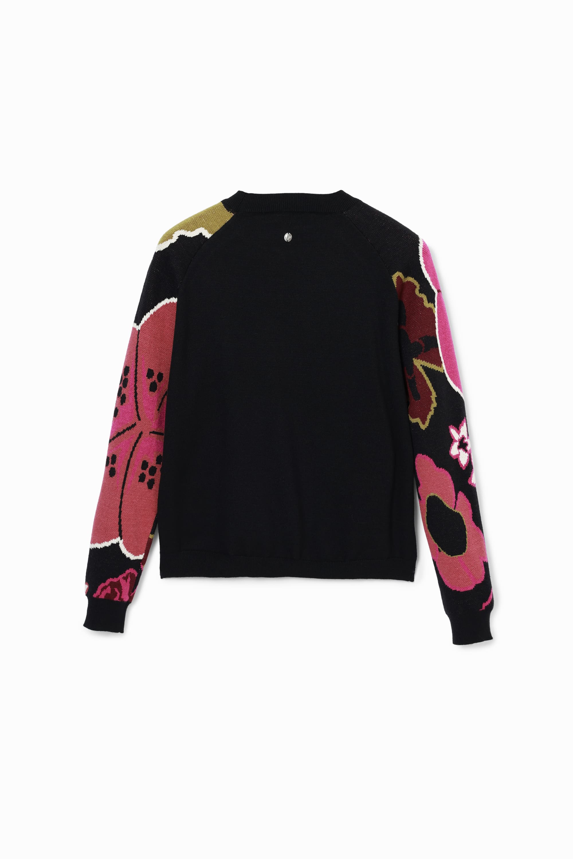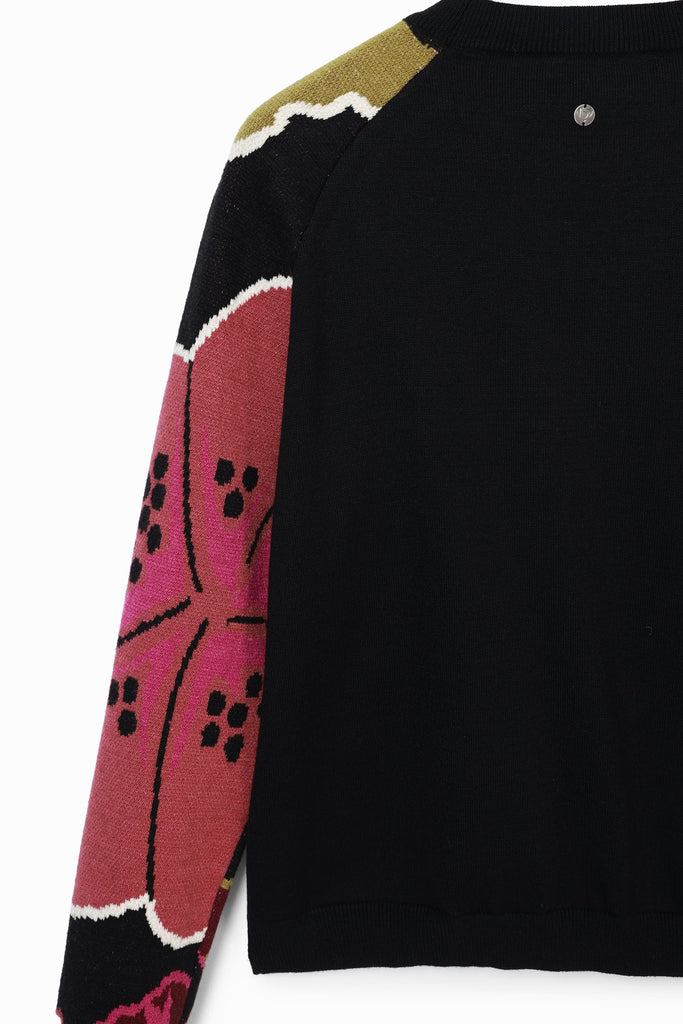 Fine knit sweater with a plain body and long sleeves with a floral print