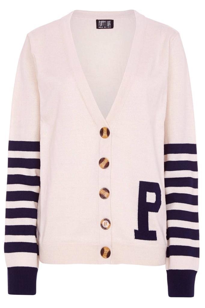 We don't have letterman jackets in the UK so we've crafted our own, with a P for Poppy Lux - Obviously! The Sandy Sweater features tortoiseshell buttons, navy stripes and a 'boyfriend fit' with a deep V front. Pop this snug cardigan over your shoulders with skater dresses and button down shirts or pair with a simple tee and jeans for that 'off duty' studious look. Smart is the new sexy...
