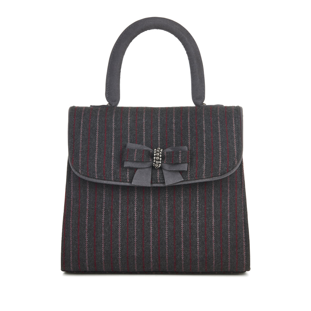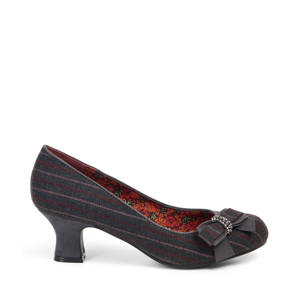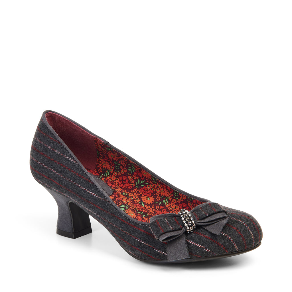 New this season, dainty low-heeled court ISLA provides comfort and practicality alongside the unique Ruby Shoo styling that you love. In grey and red pinstripe these are perfect for so many occasions. Beaded bow gives the quirky Ruby touch! Ruby Shoo ISLA matches perfectly to bag style SAIGON. This style has leather stacked heels. SHOE Upper: Textile Lining: Textile Sole: Man made materials Heel Height:60mm 2.5"