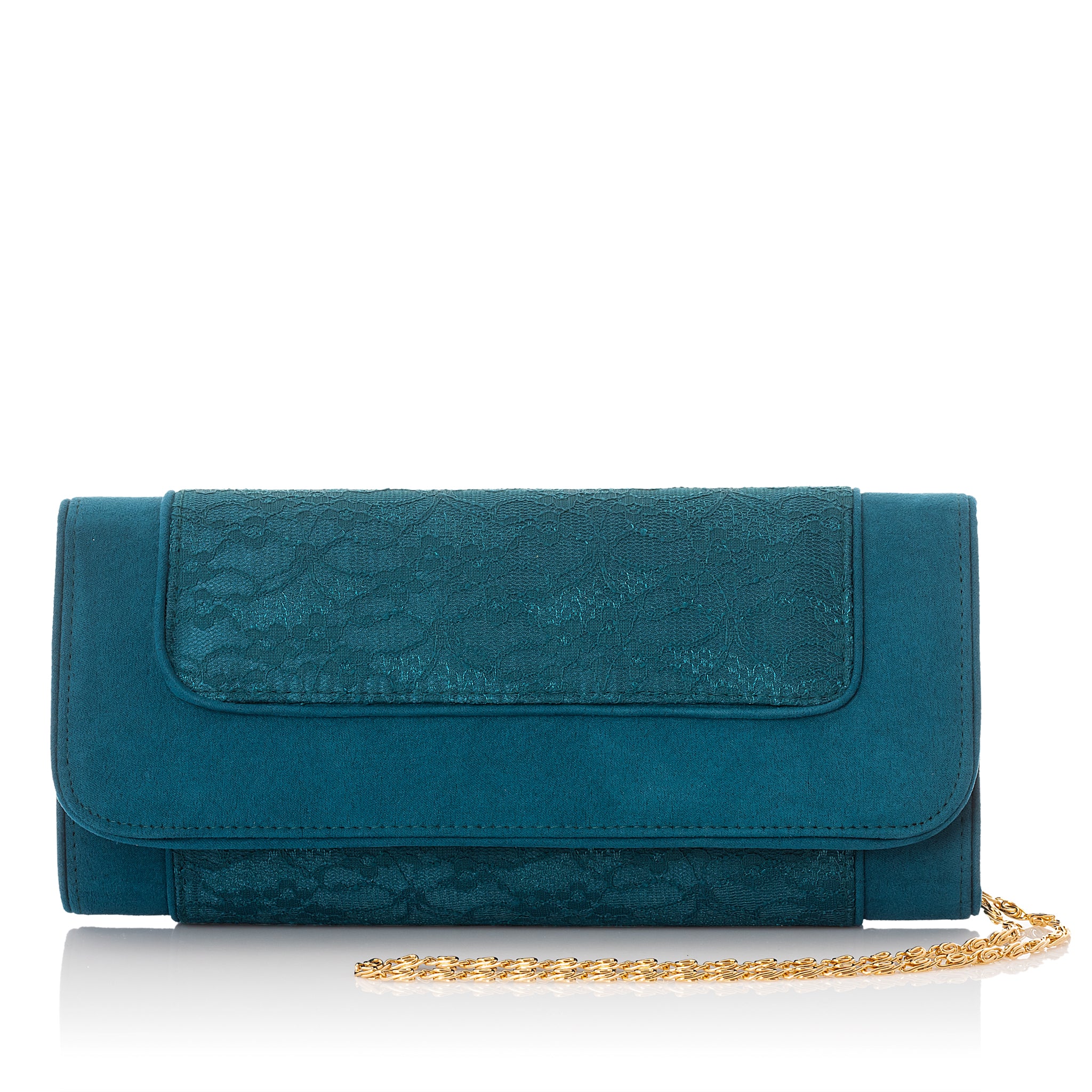 In matching shades of satin, lace and faux suede, the TIRANA clutch bag oozes elegance. With its detachable chain strap, magnetic closure and signature logo badge on the inner pocket. Fastens with a magnetic closure on the front flap and has an inner pocket with Ruby Shoo logo trim and a detachable shoulder strap. Outer: Textile Lining: Textile Width:230mm Height:110mm Depth:50mm Strap length:620mm.