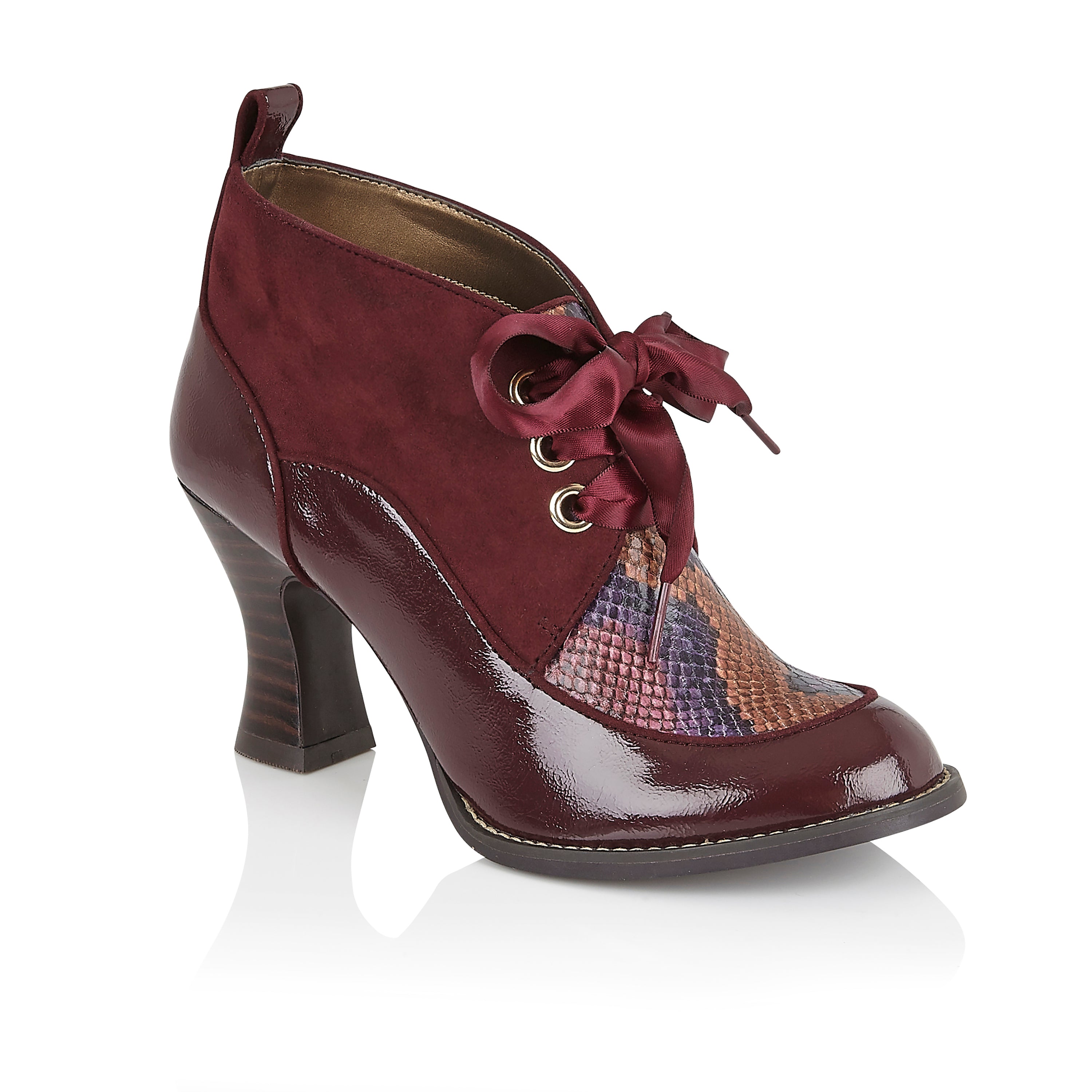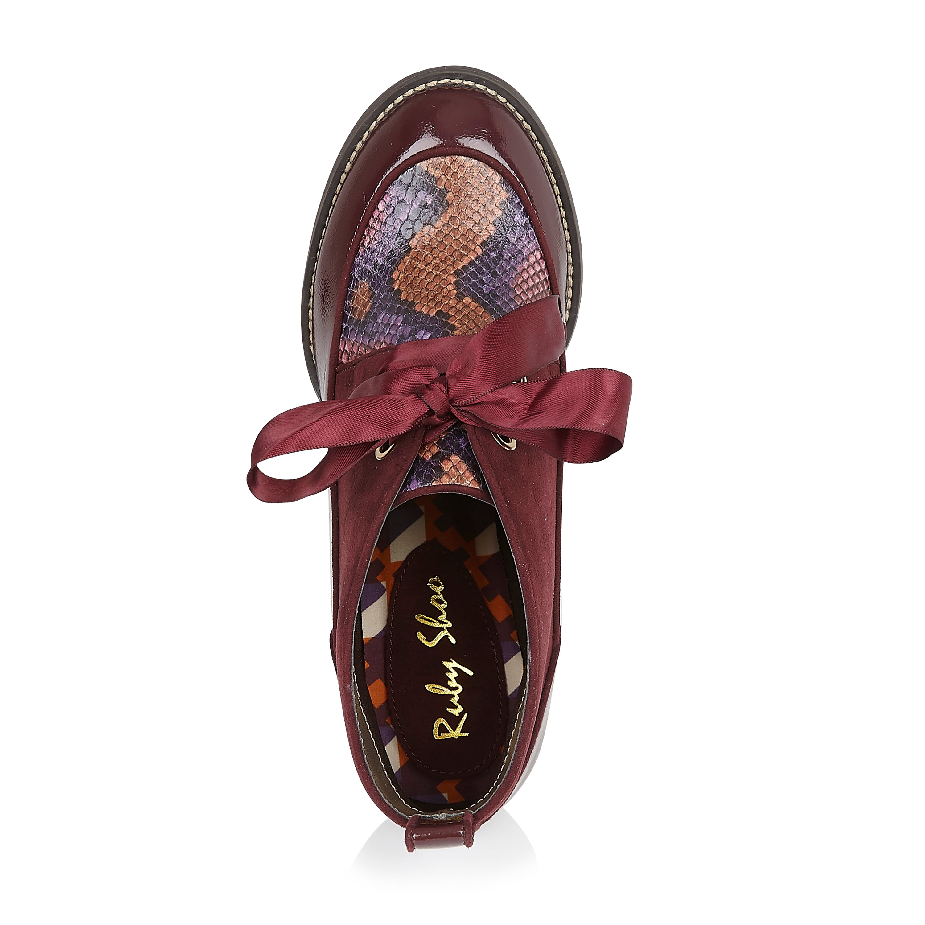 New this season, shoe-boot EMMA has a sturdy but flexible sole that combines with our comfort padding in a shoe you won't want to take off. In glossy patent teamed with faux suede, imitation snake, and rich satin ribbon laces, Ruby Shoo EMMA matches perfectly to bag style ALBERTA. This style features a stacked leather heel. Upper: textile/other Lining: textile Sock: textile Sole: other Heel height: 80mm. Stacked leather heel
