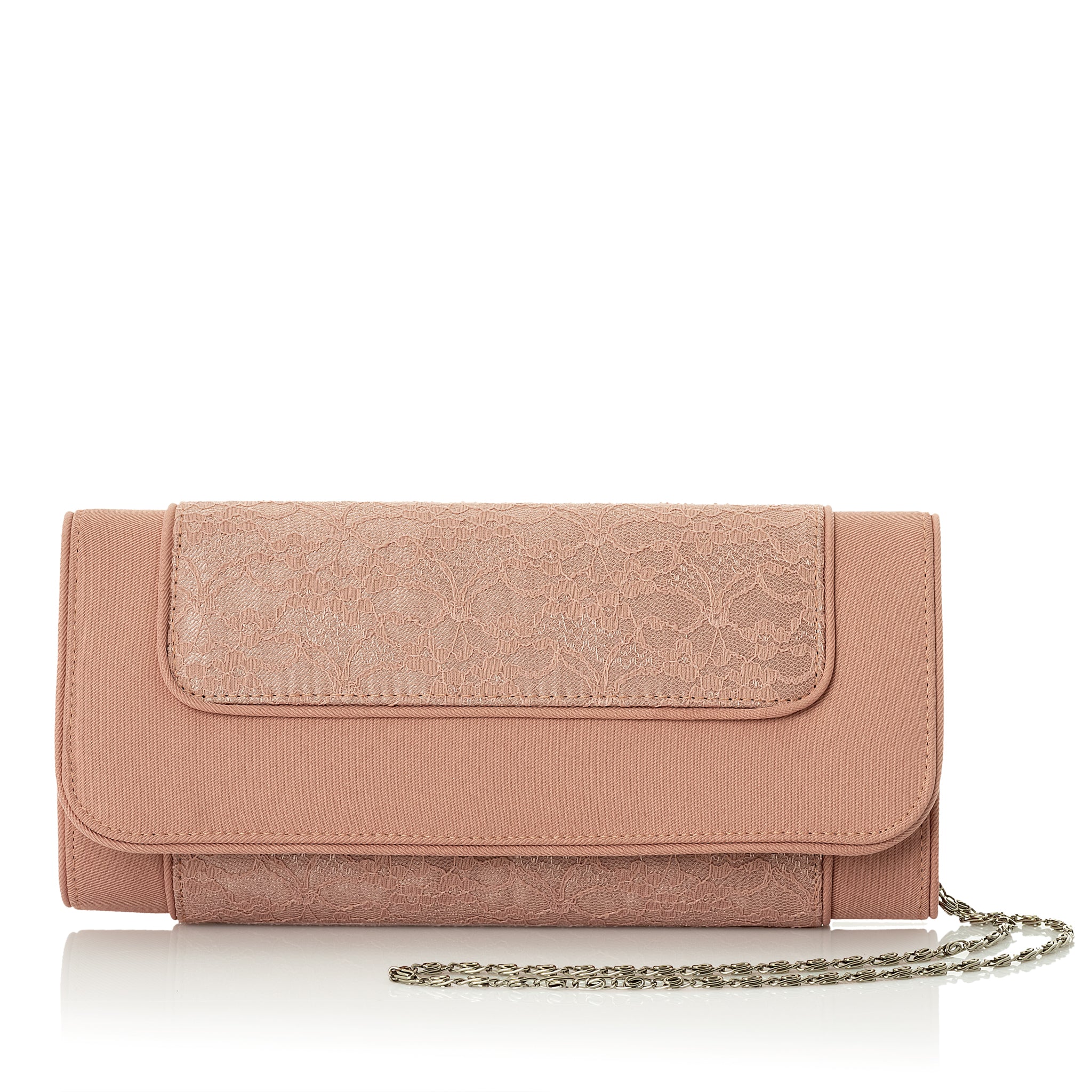 In matching shades of satin, lace and faux suede, the TIRANA clutch bag oozes elegance. With its detachable chain strap, magnetic closure and signature logo badge on the inner pocket, Ruby Shoo TIRANA matches perfectly. Fastens with a magnetic closure on the front flap and has an inner pocket with Ruby Shoo logo trim and a detachable shoulder strap. Outer: Textile Lining: Textile Width:230mm Height:110mm Depth:50mm Strap length:620mm.