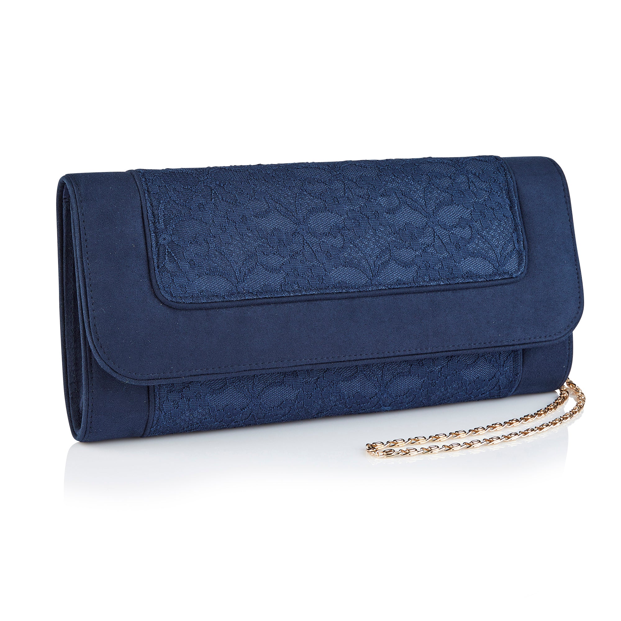 In matching shades of satin, lace and faux suede, the TIRANA clutch bag oozes elegance. With its detachable chain strap, magnetic closure and signature logo badge on the inner pocket, Ruby Shoo TIRANA matches perfectly. Fastens with a magnetic closure on the front flap and has an inner pocket with Ruby Shoo logo trim and a detachable shoulder strap. Outer: Textile Lining: Textile Width:230mm Height:110mm Depth:50mm Strap length:620mm.