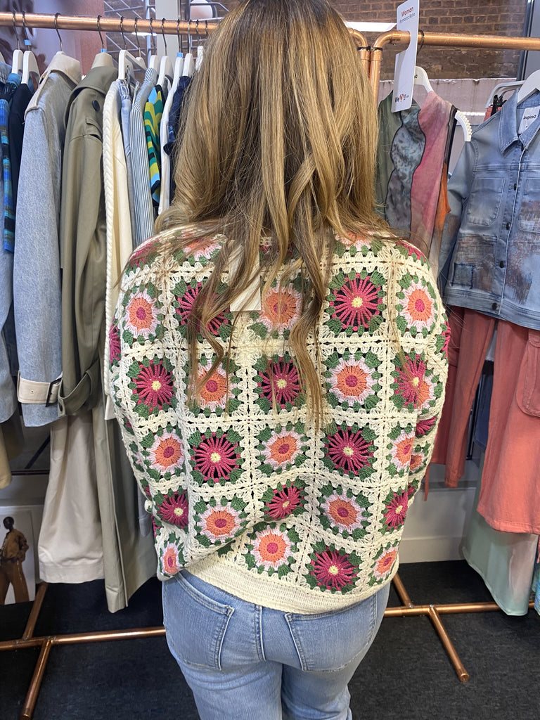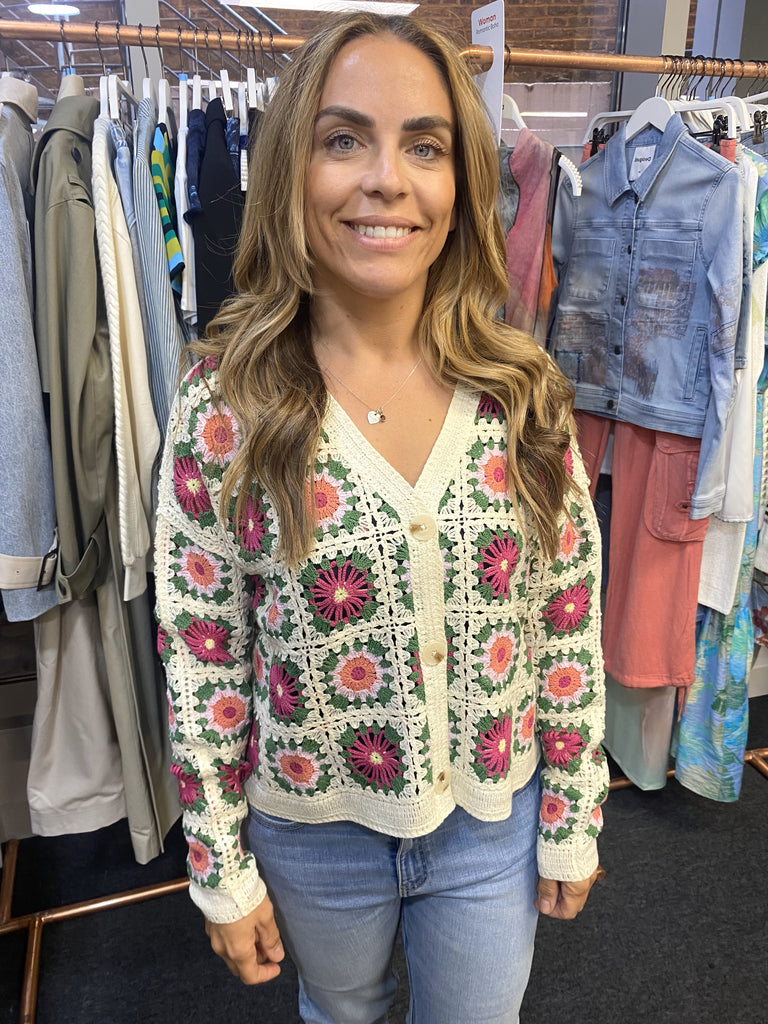 Classic knit cardigan with floral design, long sleeves, V-neck, and button closure.