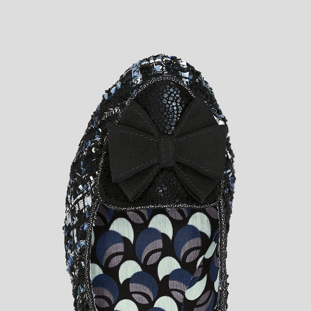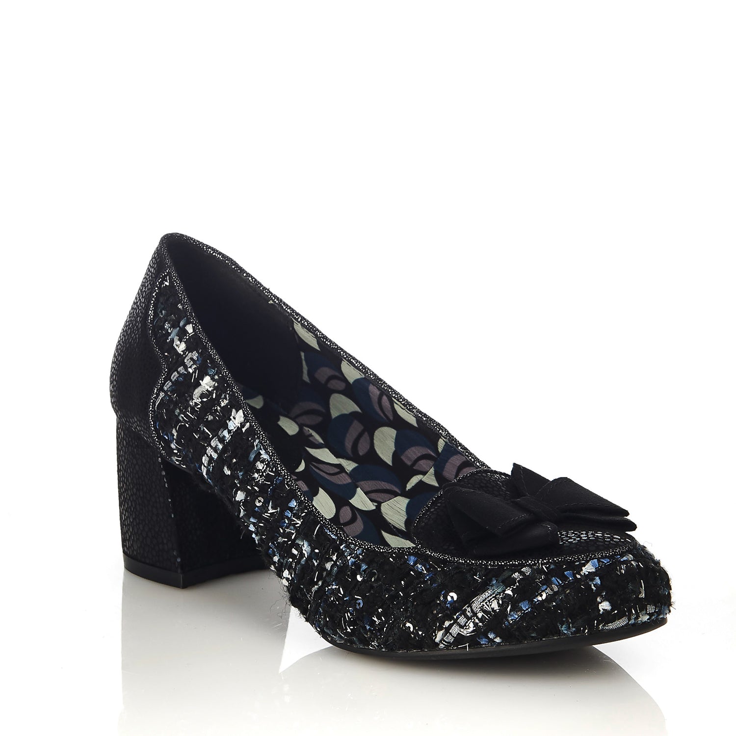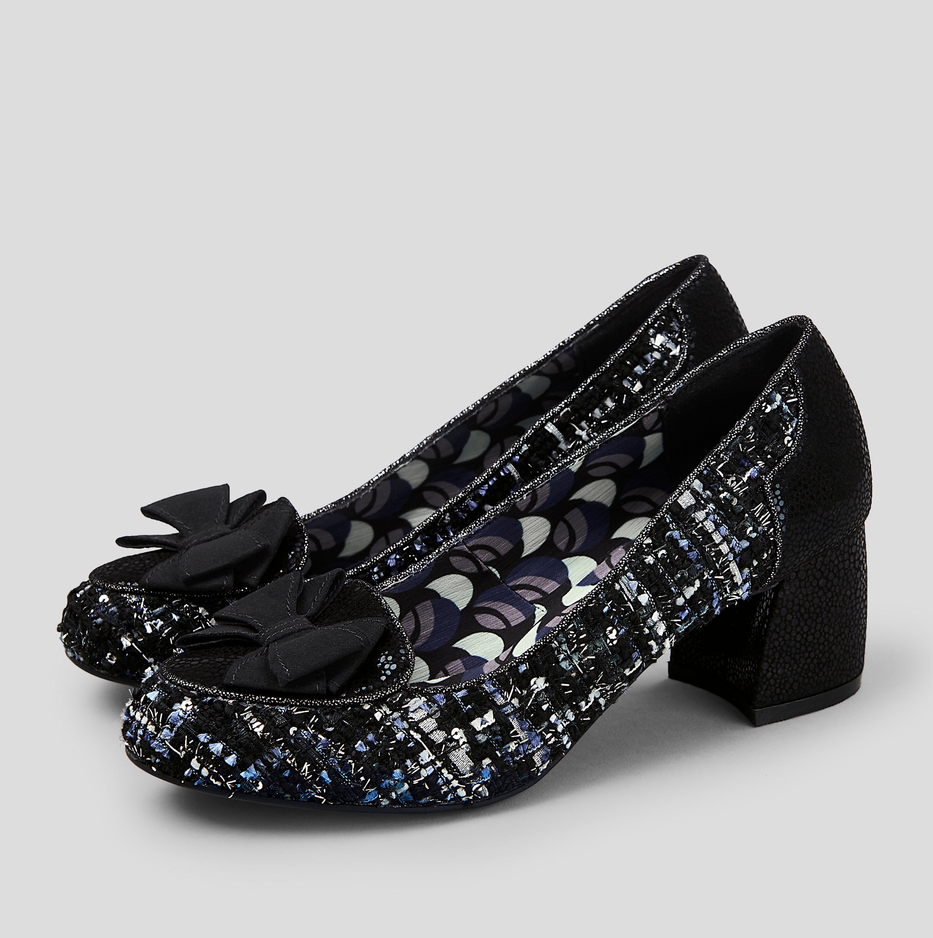 Combining ribbon threaded, sequin and tinsel embellished tweed with mock snake and soft faux suede, new heeled loafer THALIA is a treat to touch as well as to wear. Finished with a fine metallic piping, print lining, and a cute bow, Ruby Shoo THALIA matches perfectly to bag style KOBE Upper: textile Lining: textile Sock: textile Sole: other Heel height: 55mm