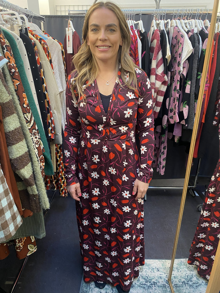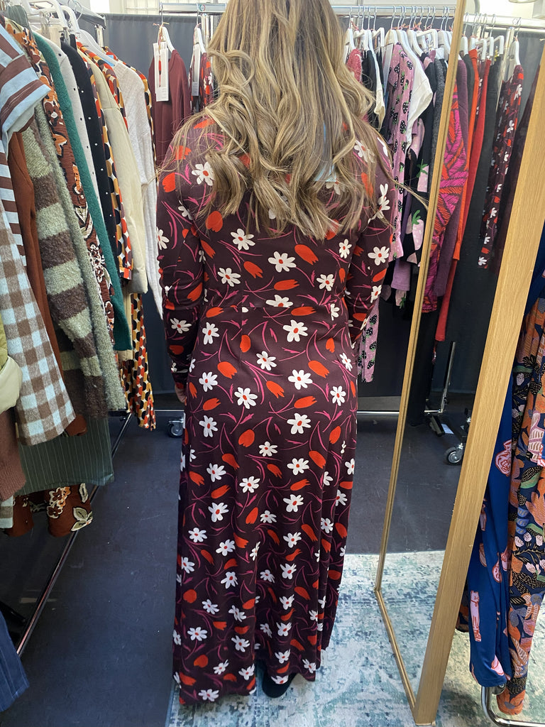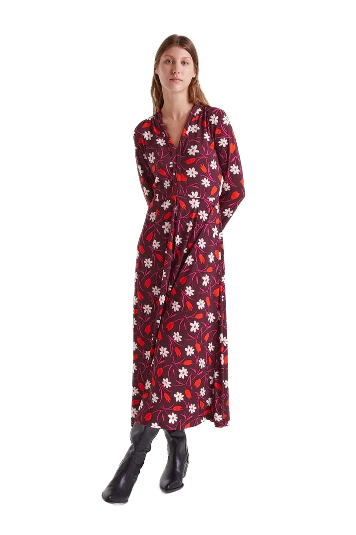 Long tulip print dress with a V-neck and long sleeves. Concealed button front closure. Model is 177 cm tall and is wearing size S. 53C/41000/5XL