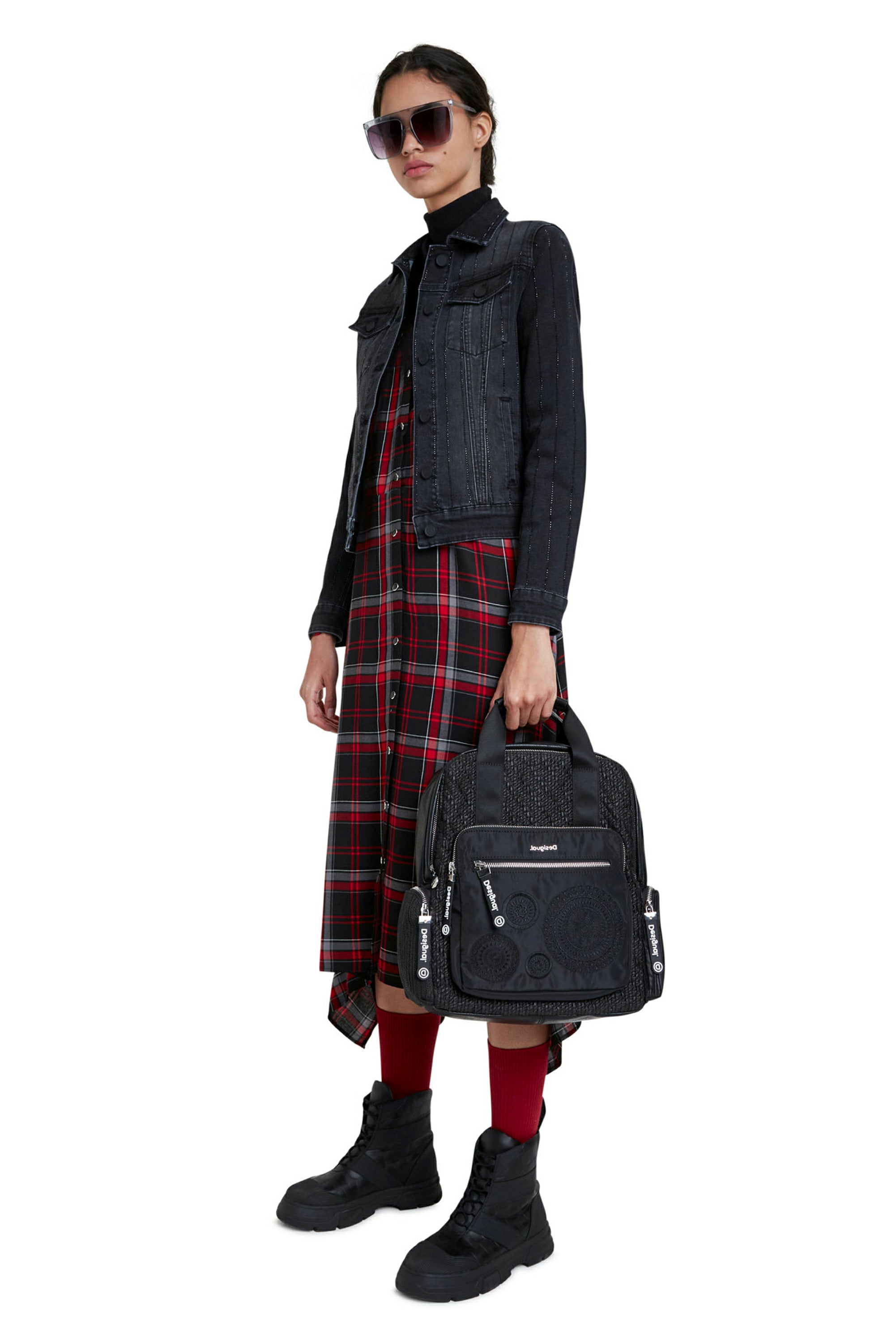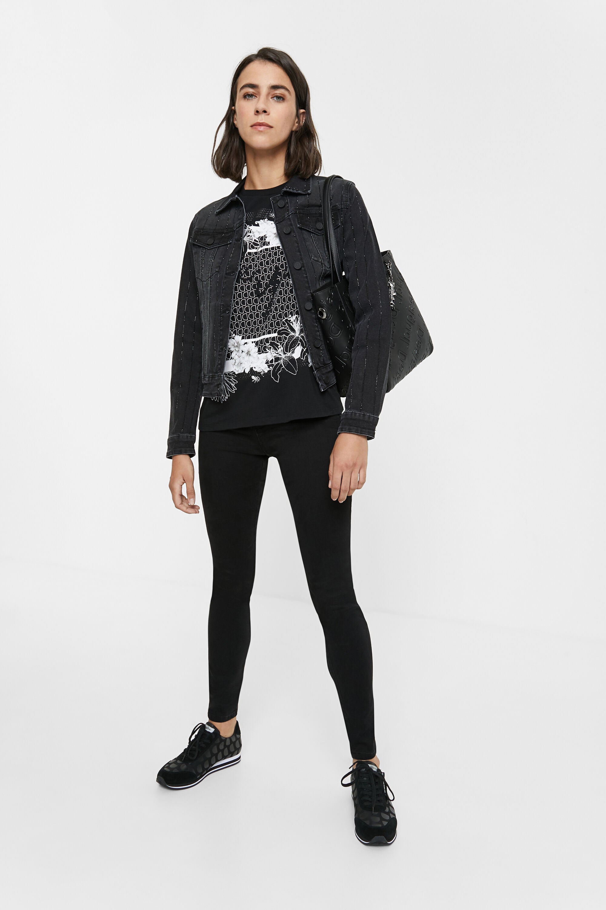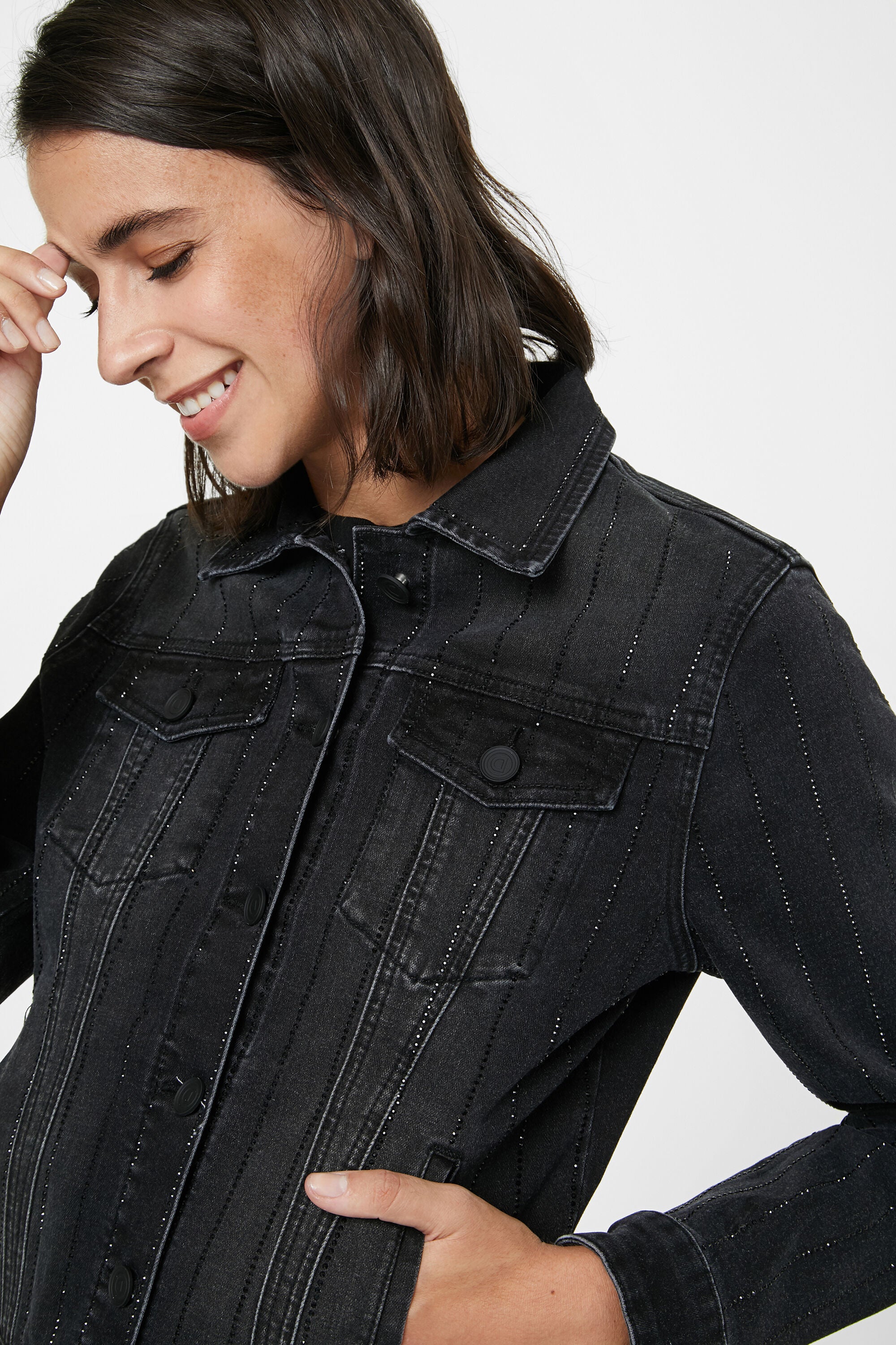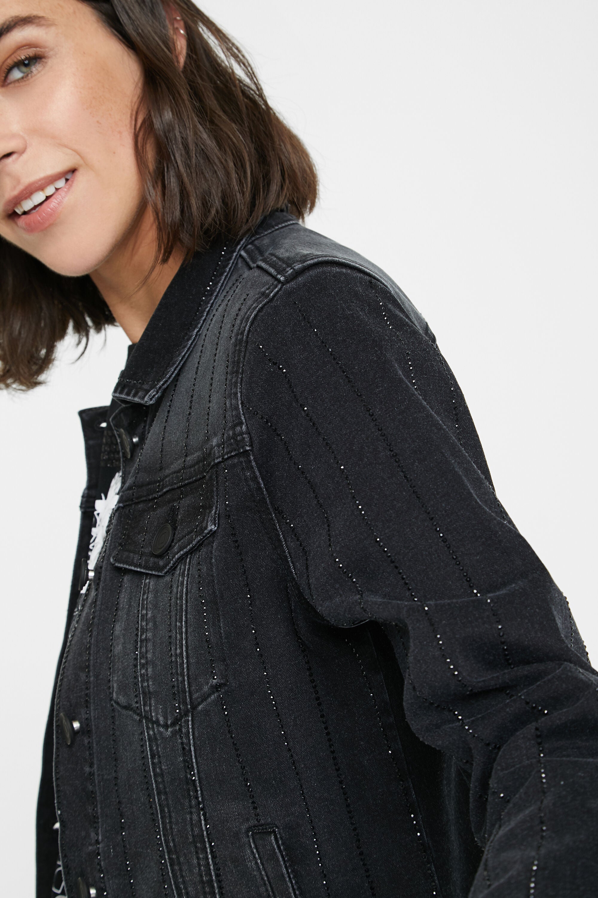 20WWED21 - CHAQ_BLACK BLINDER - 74% COTTON 25% POLYESTER 1% ELASTANE The trucker type denim jacket with the usual washed/worn effect? No way. Because, in addition to its flattering slim silhouette, this jacket displays vertical lines of black rhinestone beads that will add an elegant, bright touch to your looks.