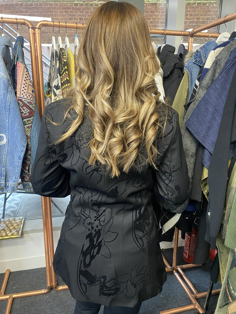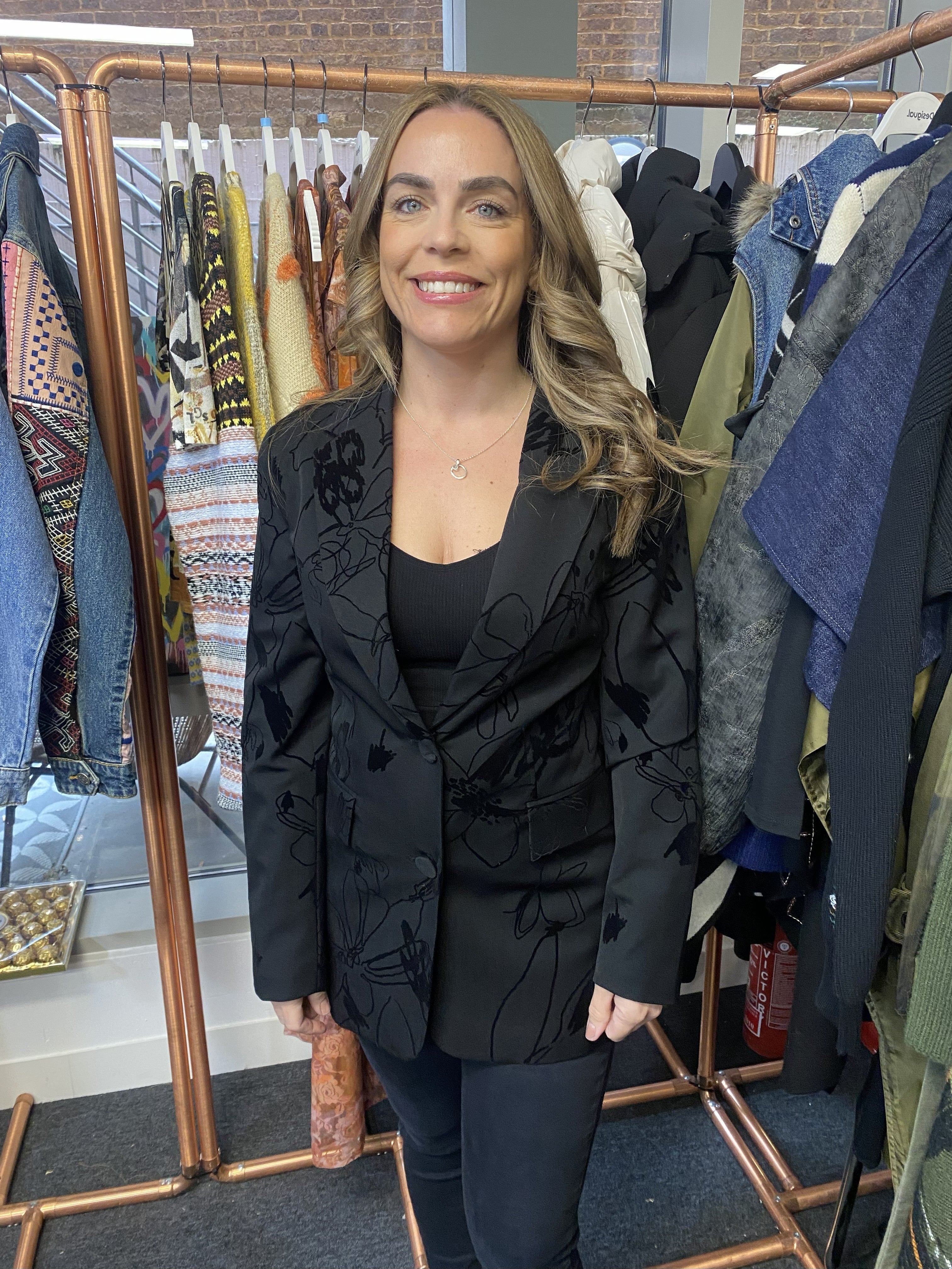 Regular-fit blazer in red or black with front pockets in solid color featuring velvet flocked details creating an Arty-inspired print.