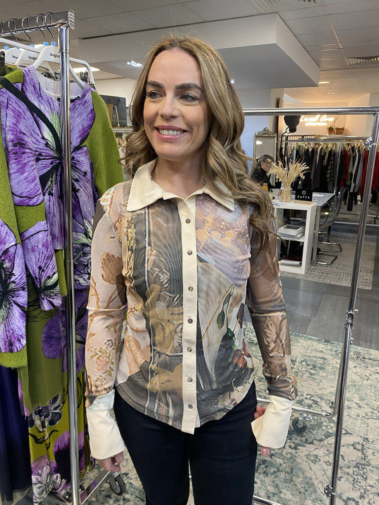 Desigual Eyre Cream Chiffon Collage Shirt with Ribbed Collar 25WWTK26