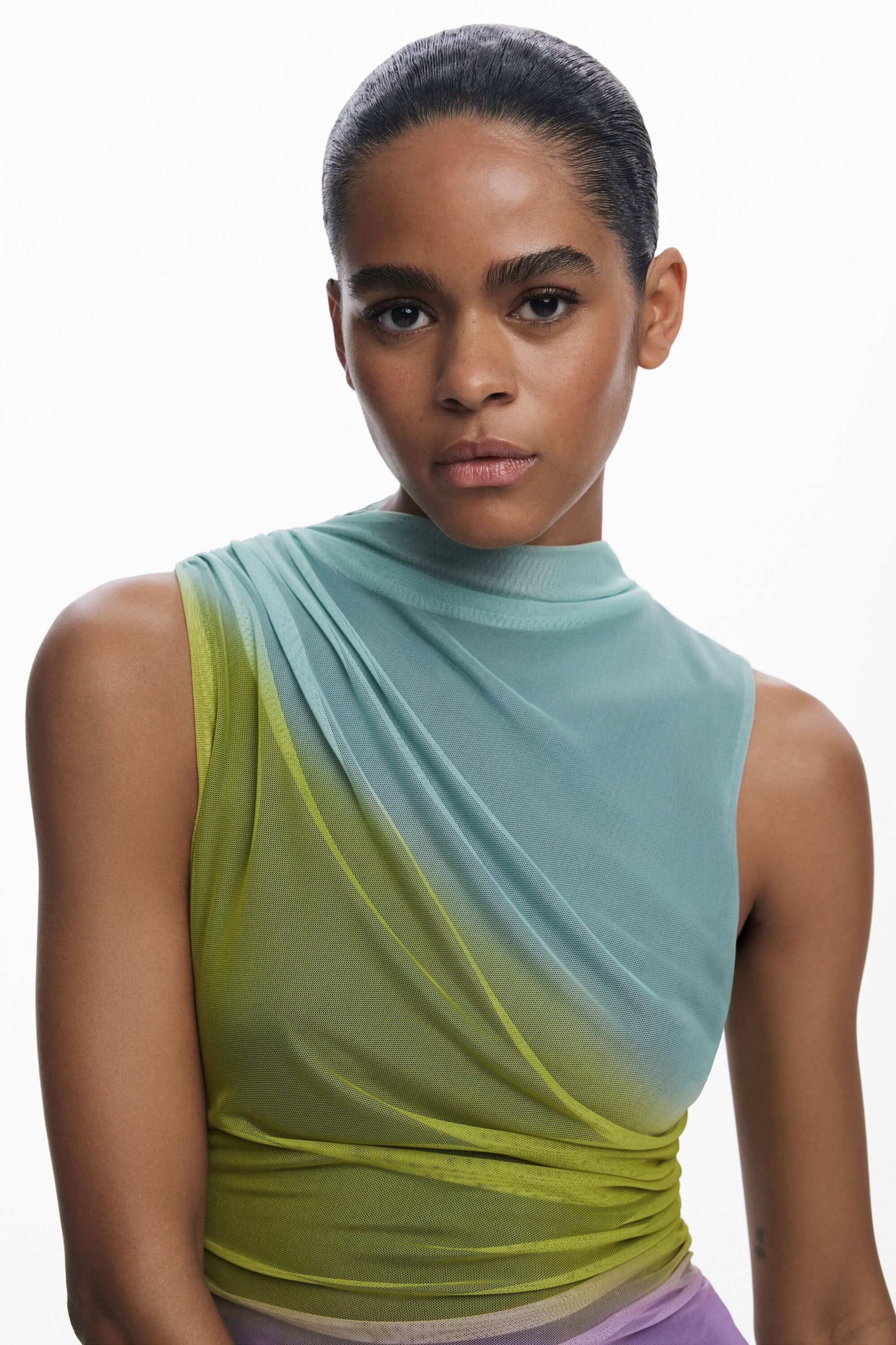 Midi dress in tulle, sleeveless, round neck and front draping with color gradient.
